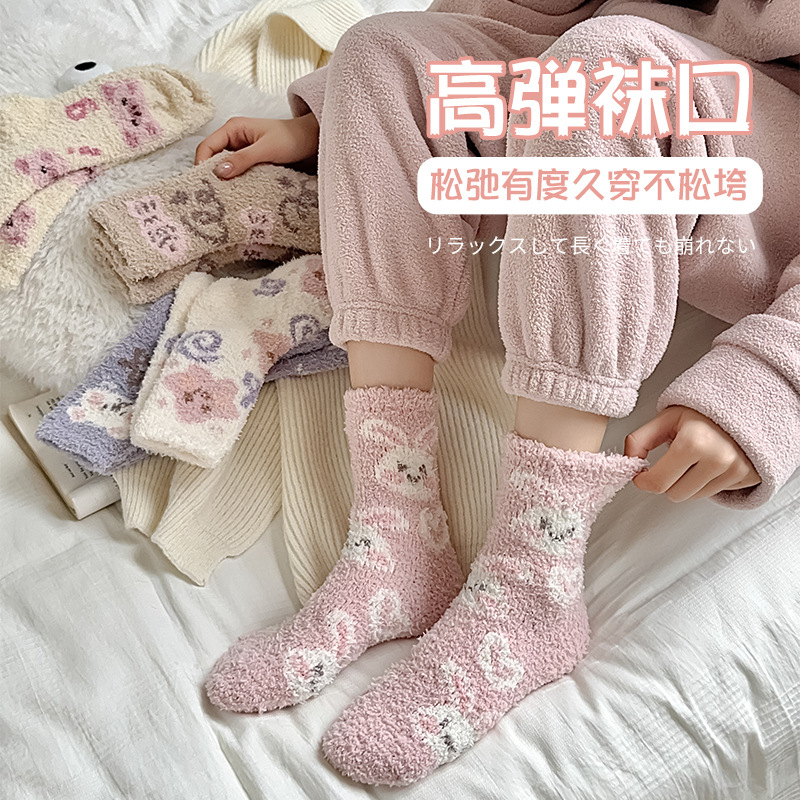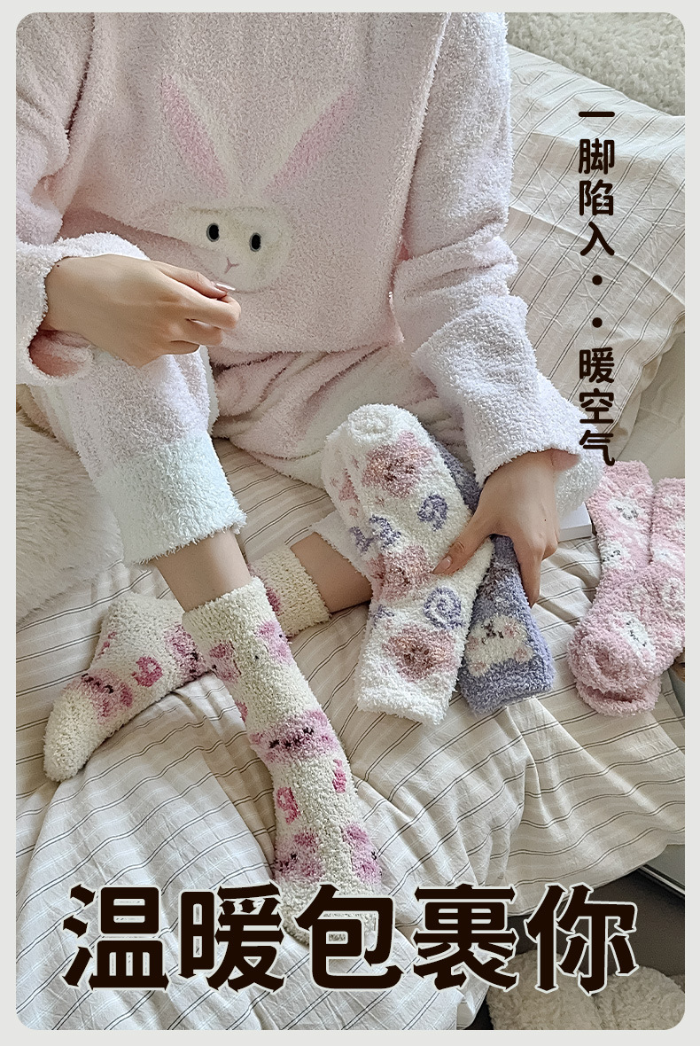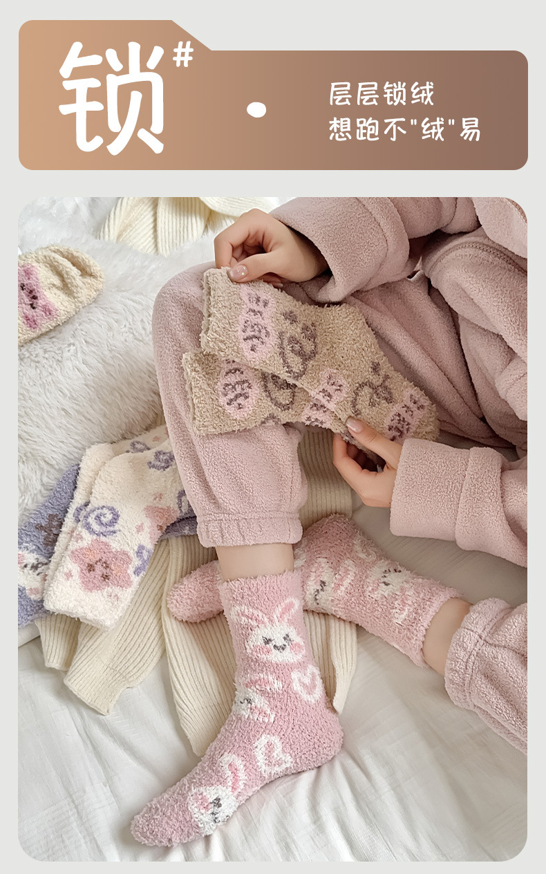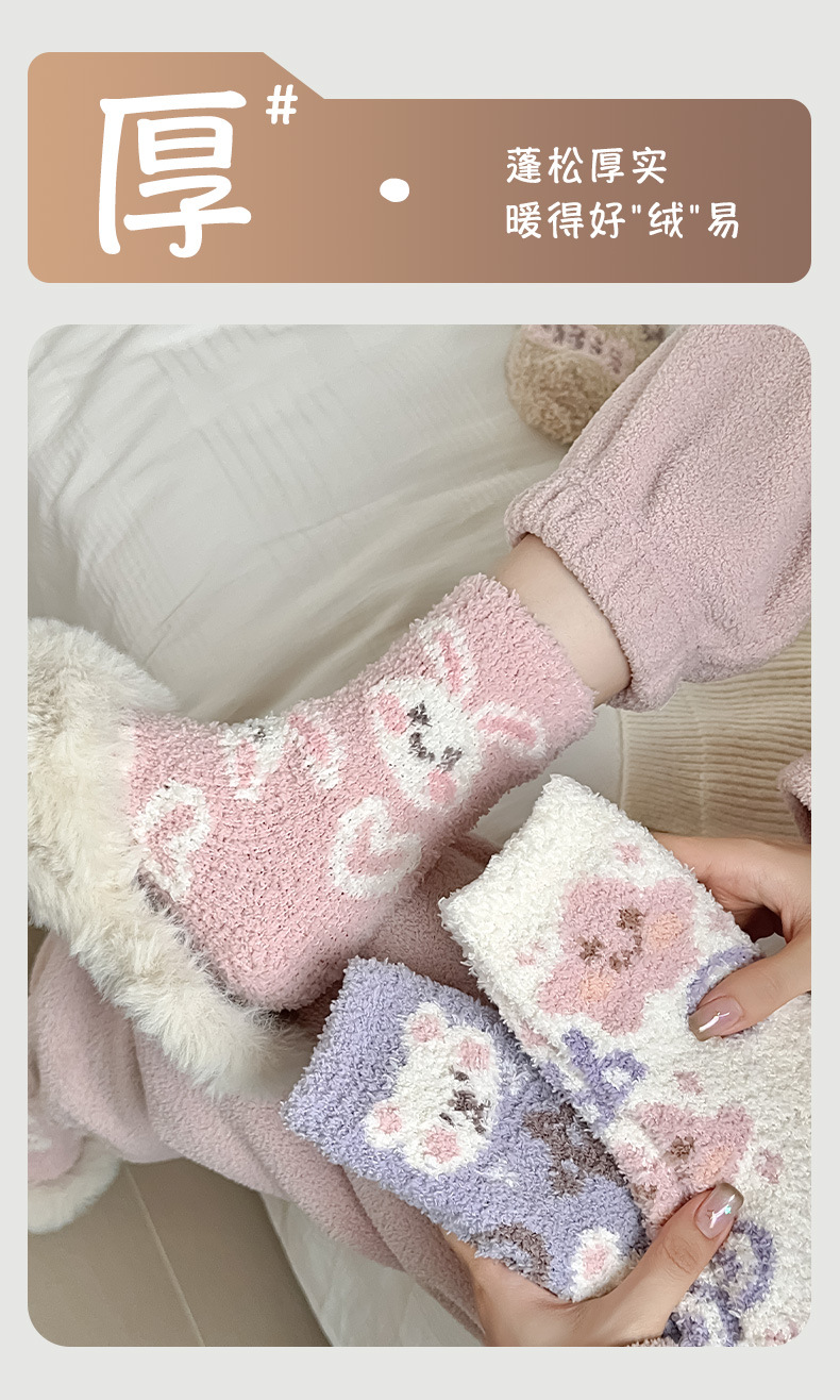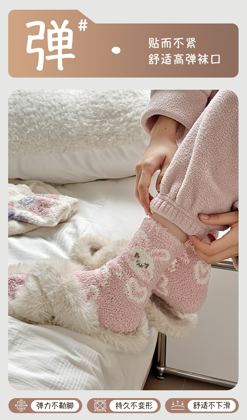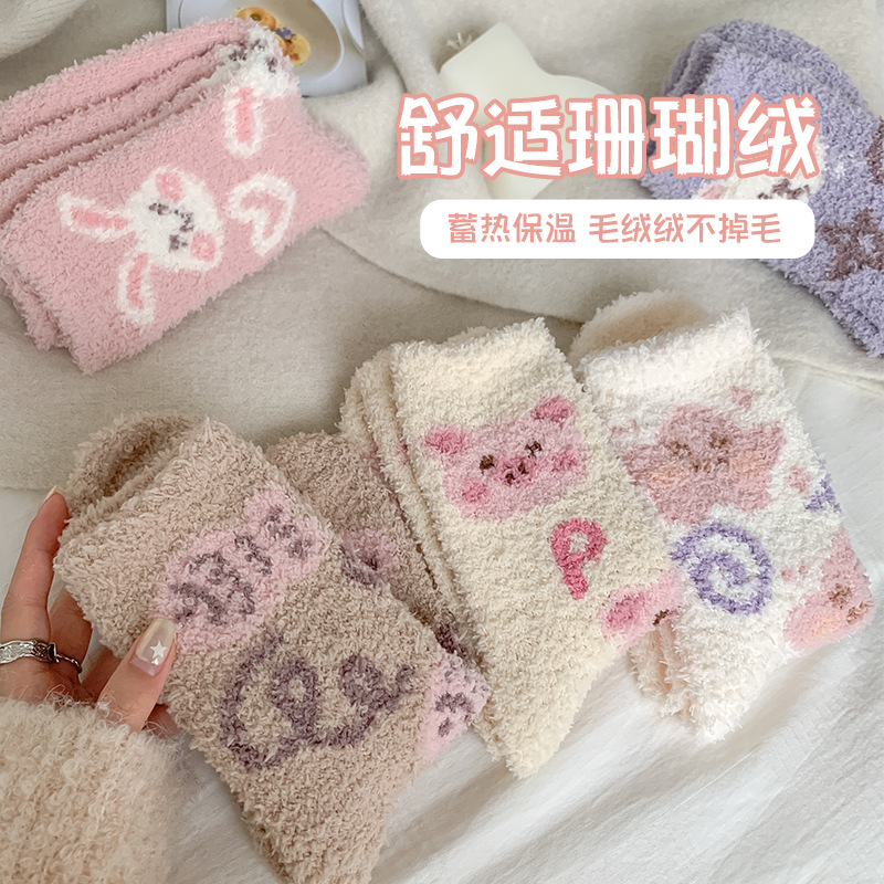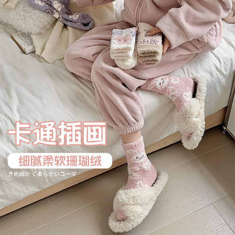 珊瑚绒袜子女冬天加厚保暖中筒袜甜美卡通可爱睡眠袜女居家地板袜