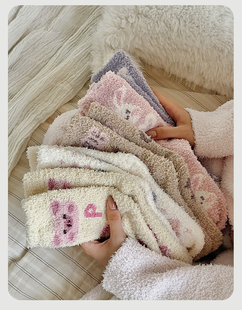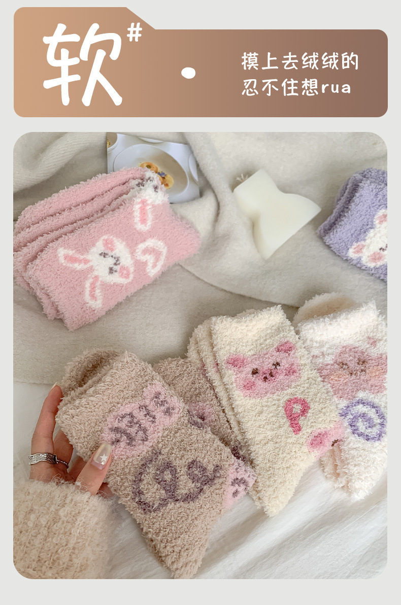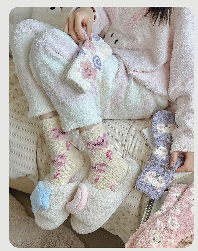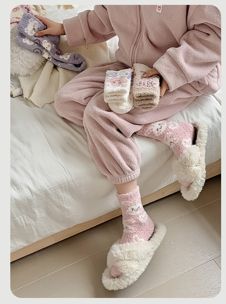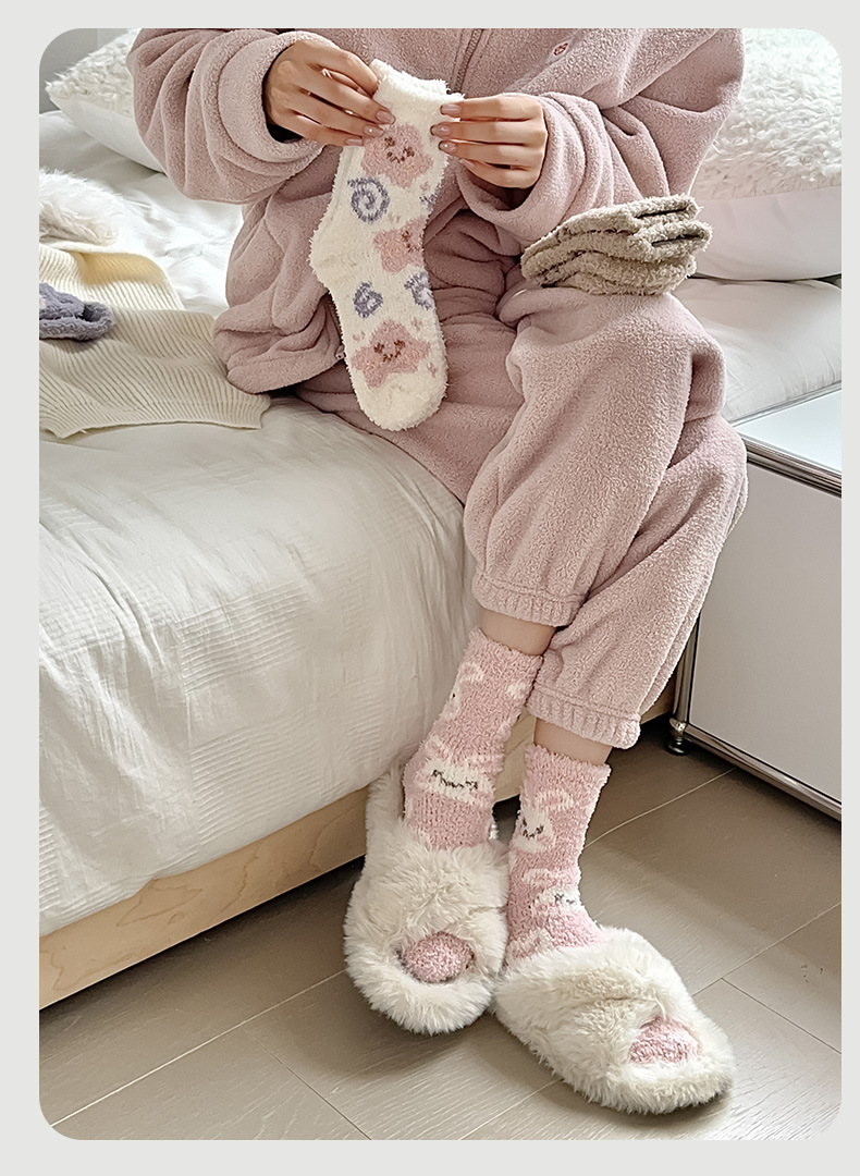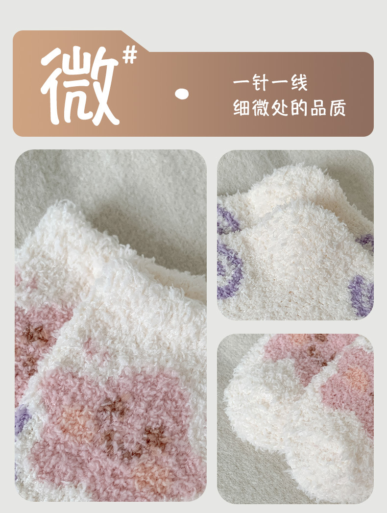 珊瑚绒袜子女冬天加厚保暖中筒袜甜美卡通可爱睡眠袜女居家地板袜