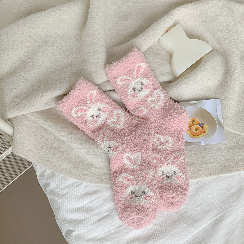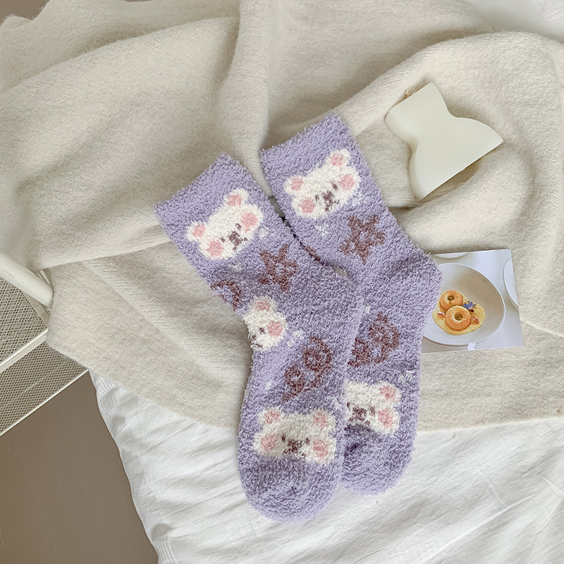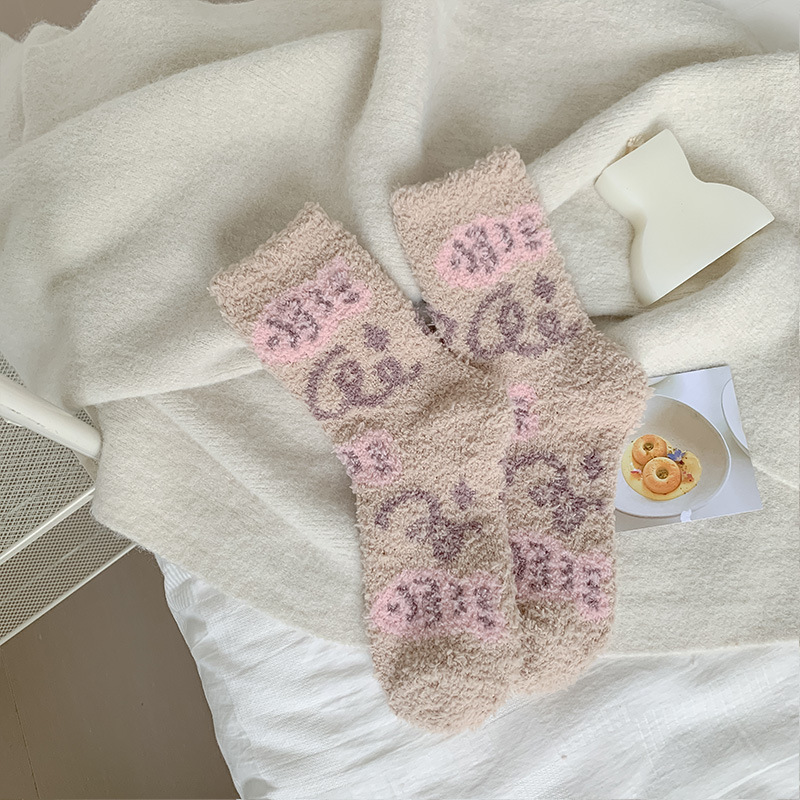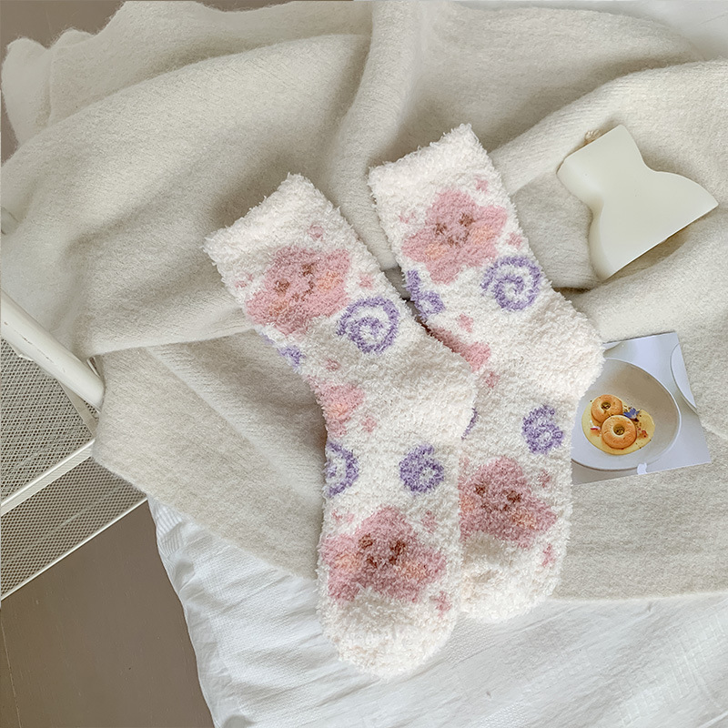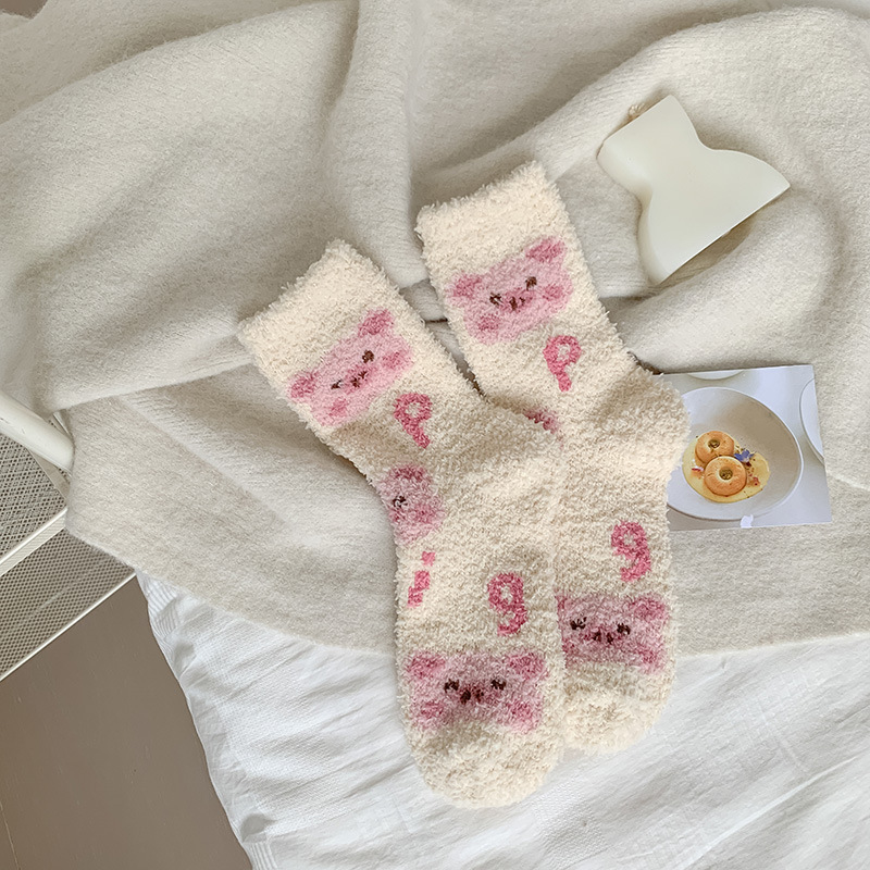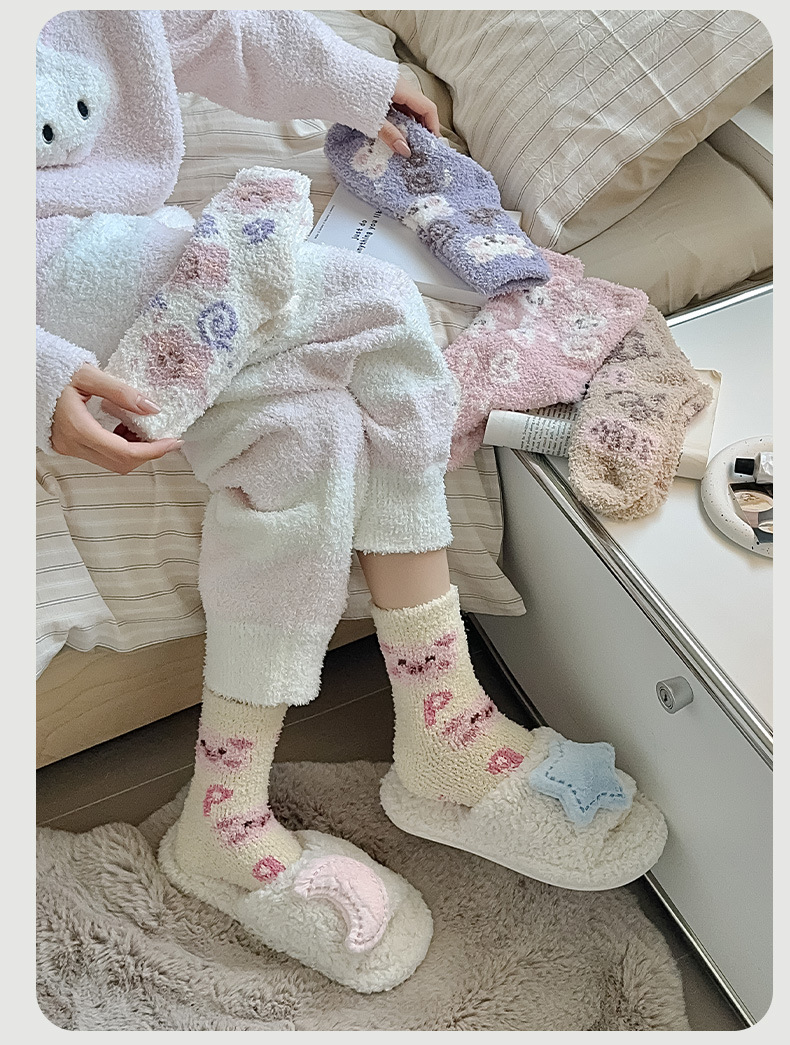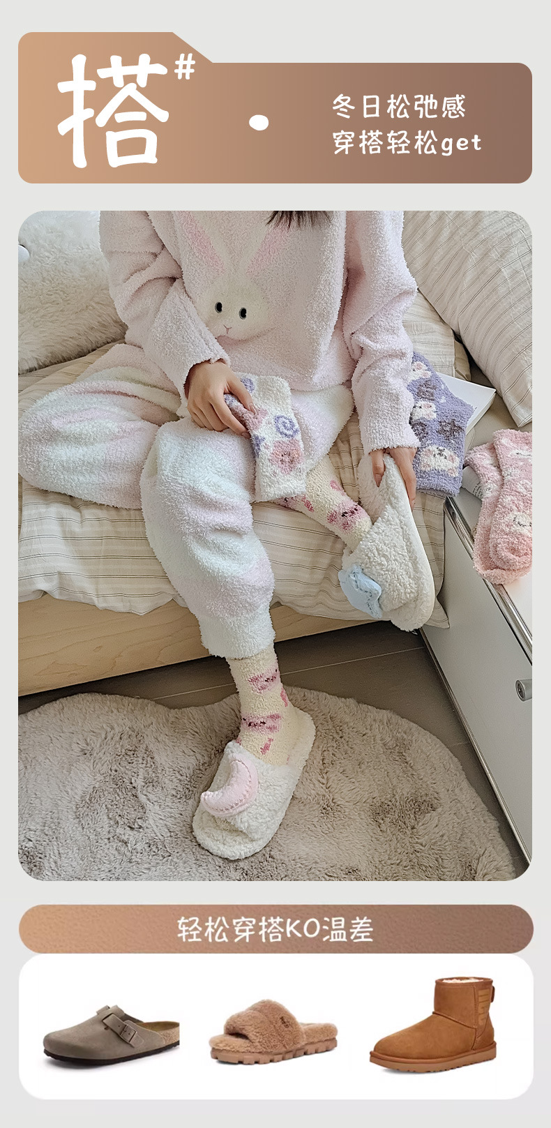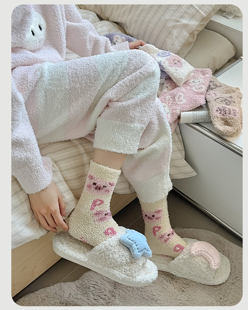 珊瑚绒袜子女冬天加厚保暖中筒袜甜美卡通可爱睡眠袜女居家地板袜