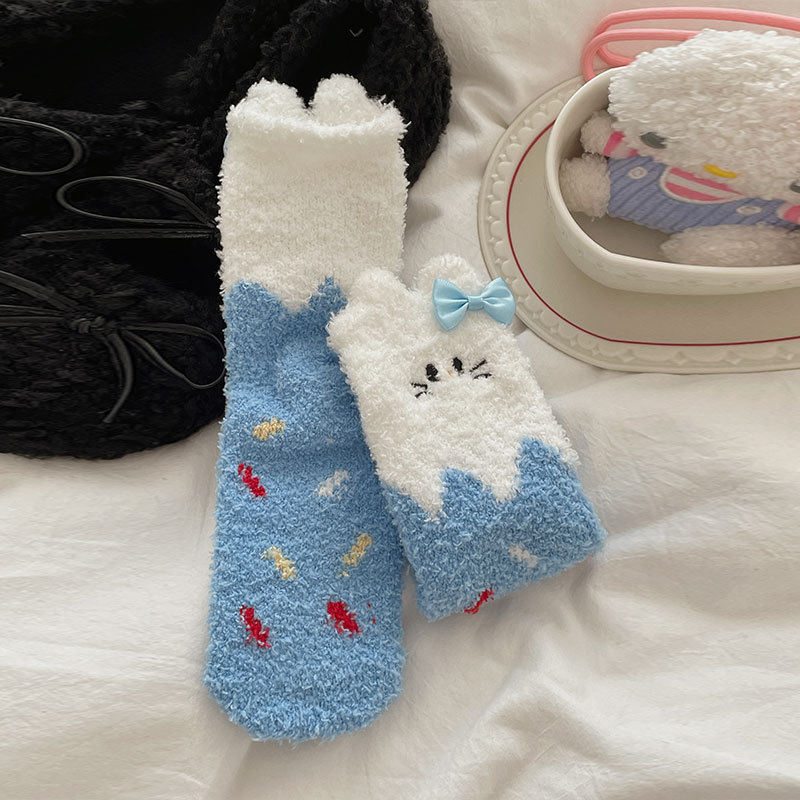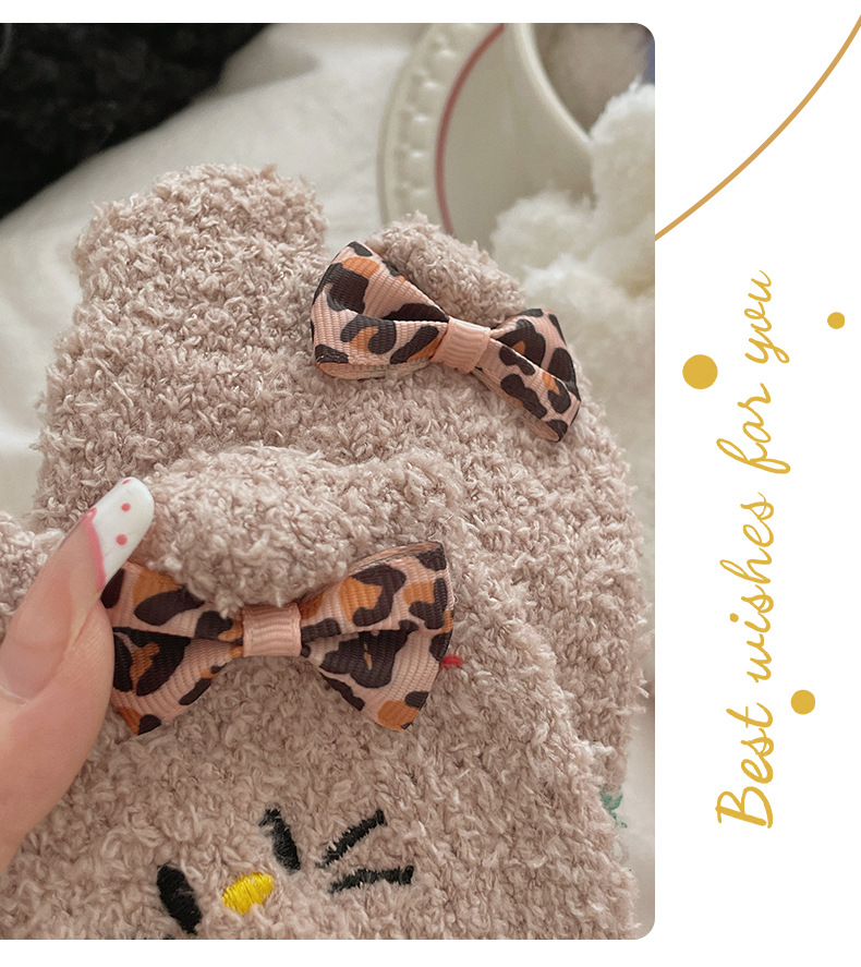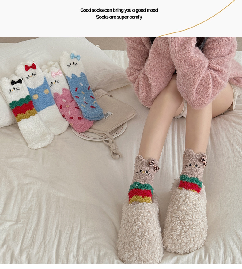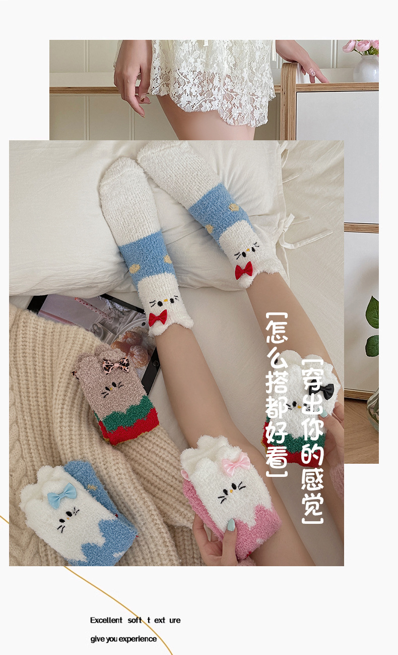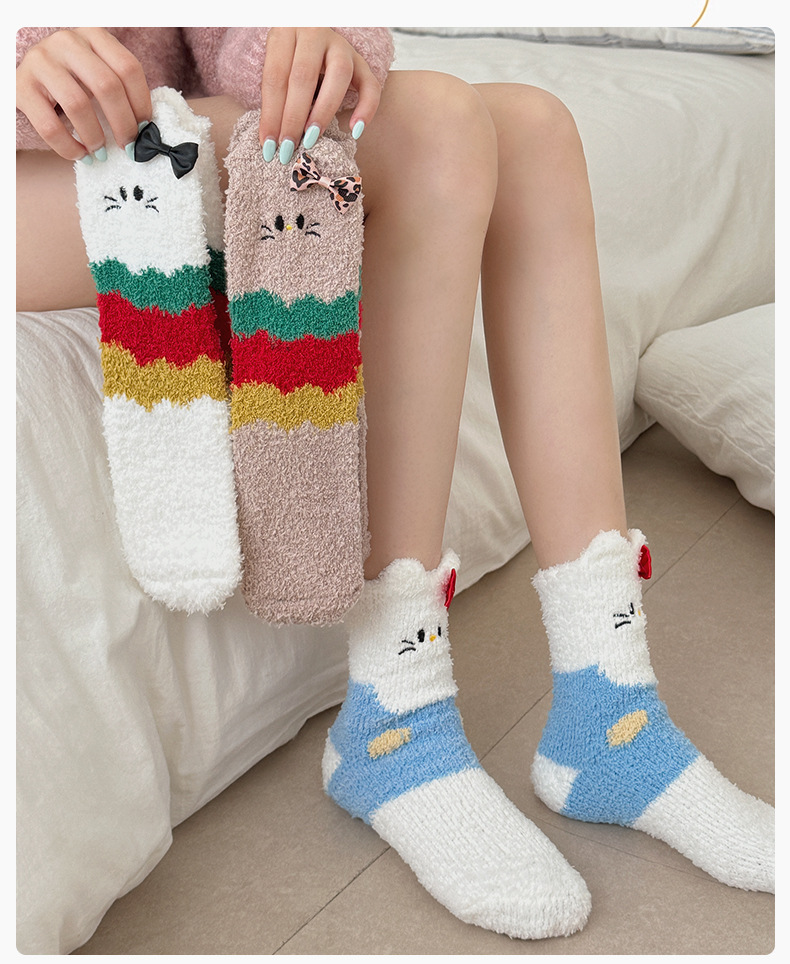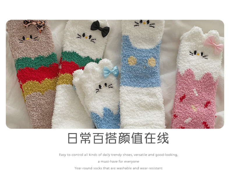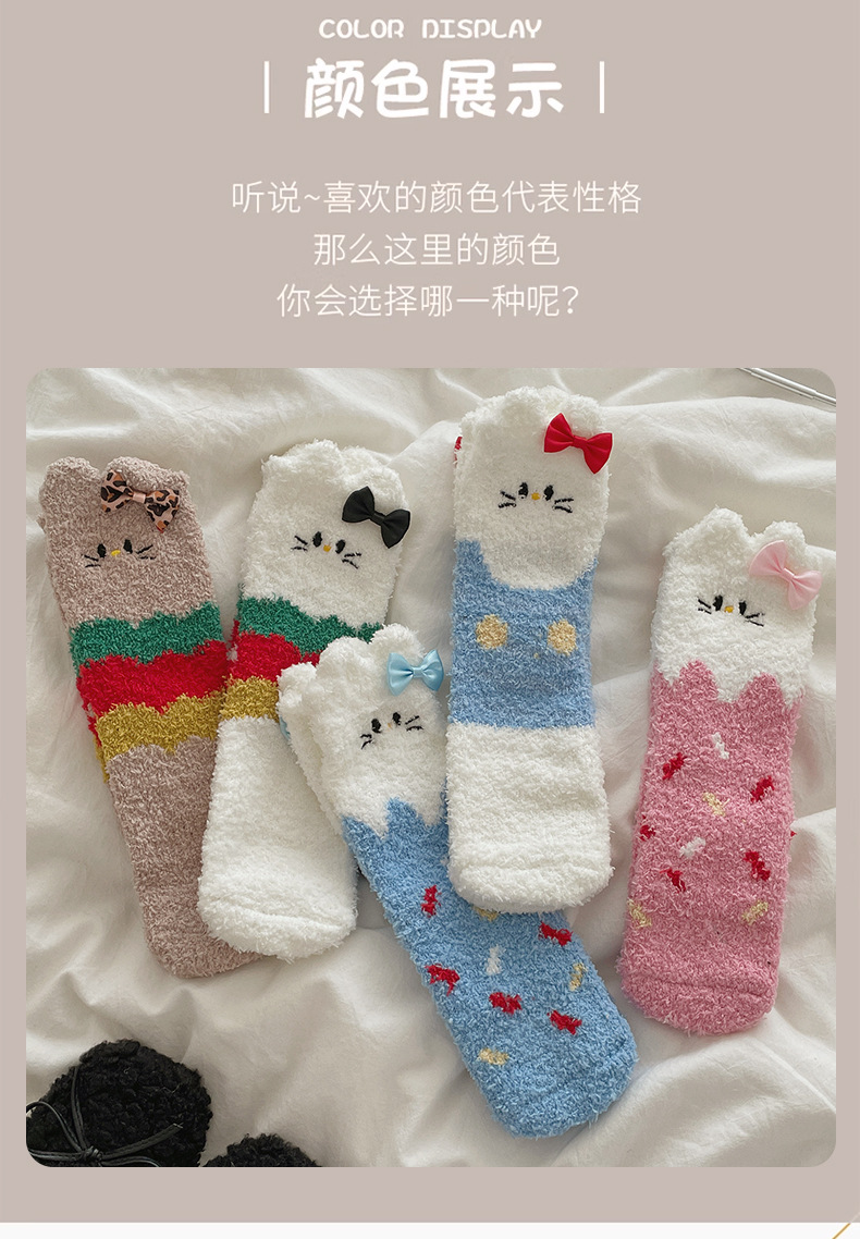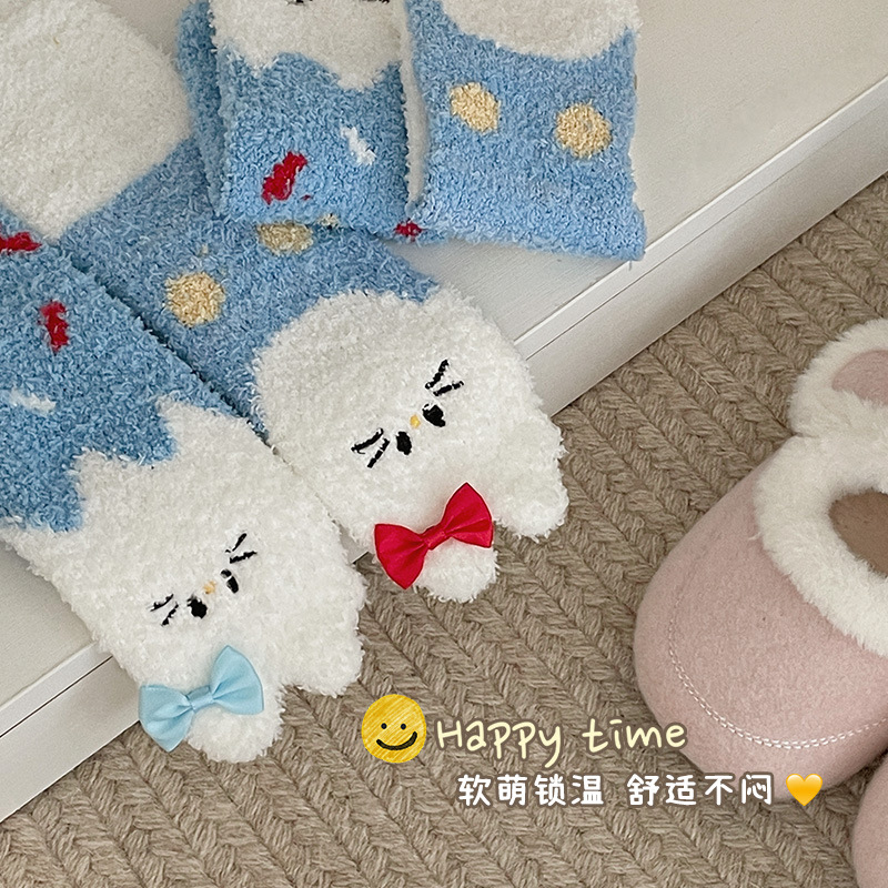 刺绣猫咪珊瑚绒袜子女可爱立体蝴蝶结中筒袜冬季保暖不掉毛睡眠袜