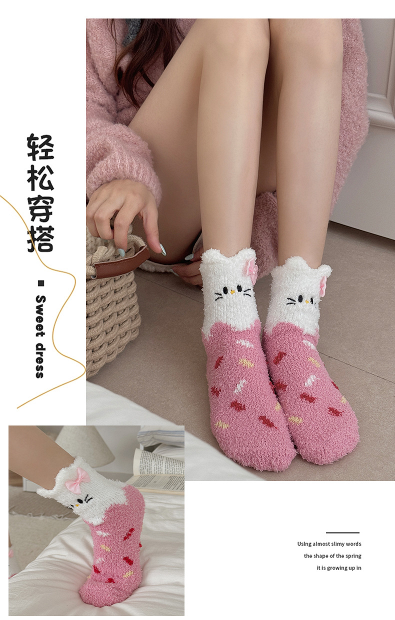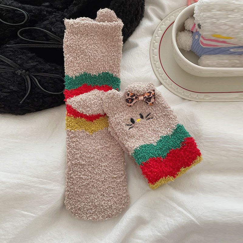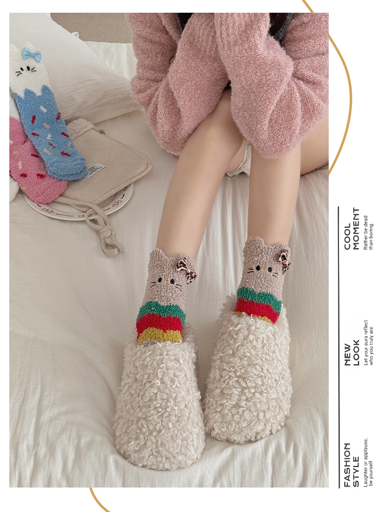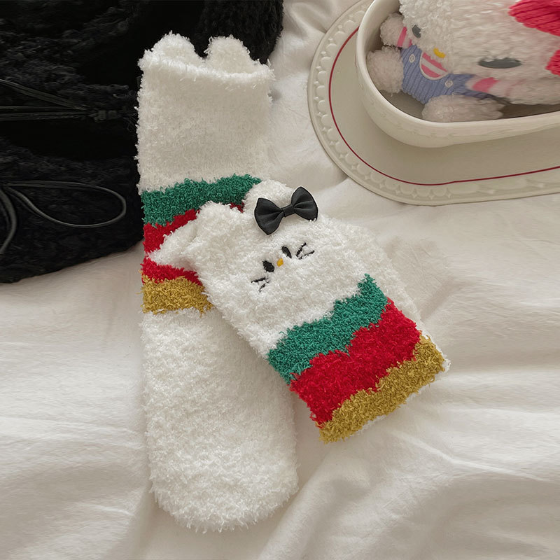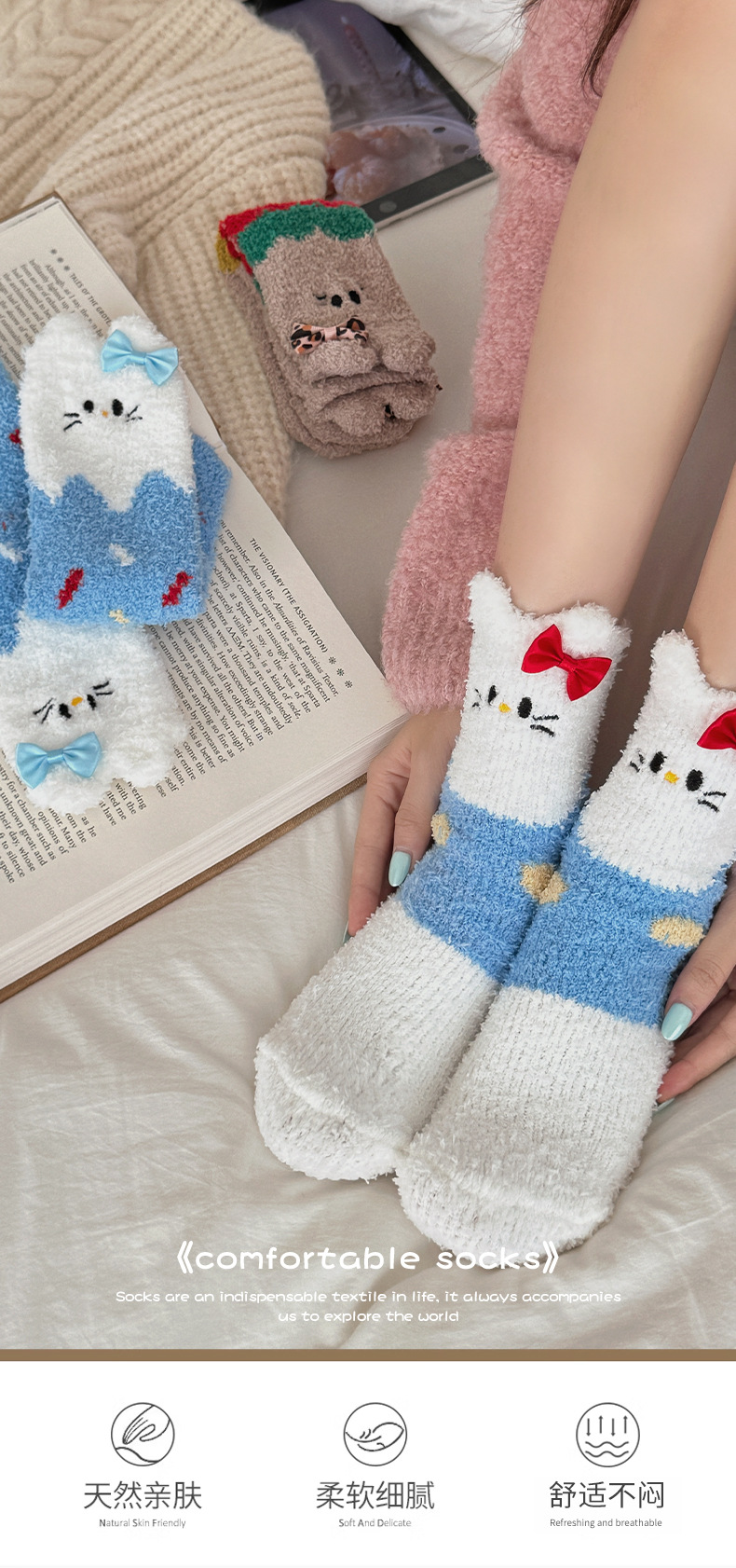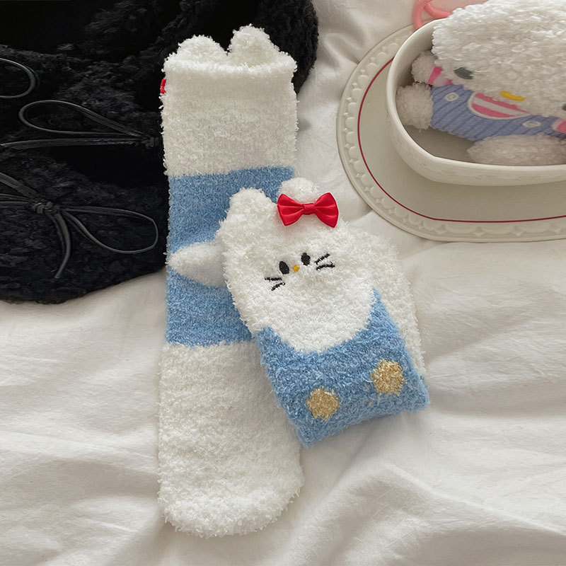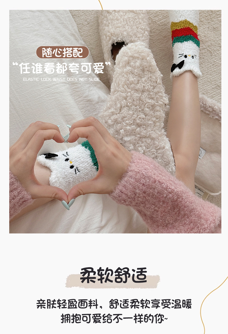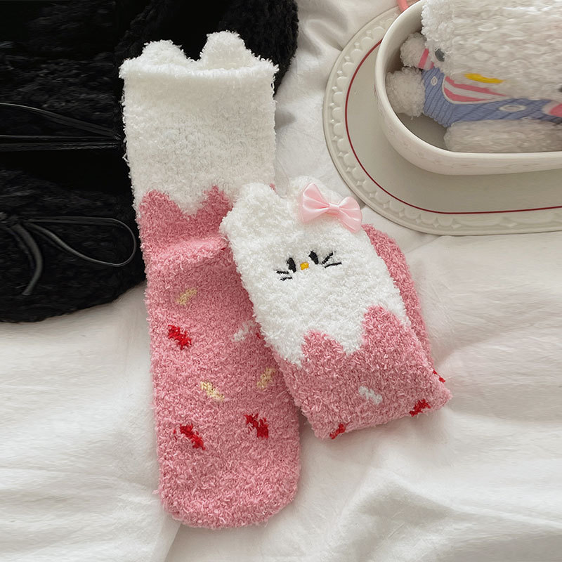 刺绣猫咪珊瑚绒袜子女可爱立体蝴蝶结中筒袜冬季保暖不掉毛睡眠袜