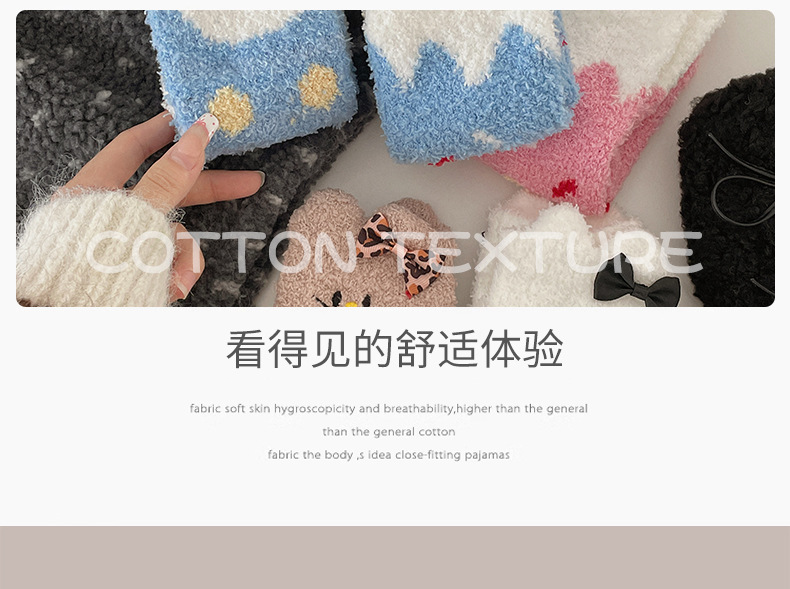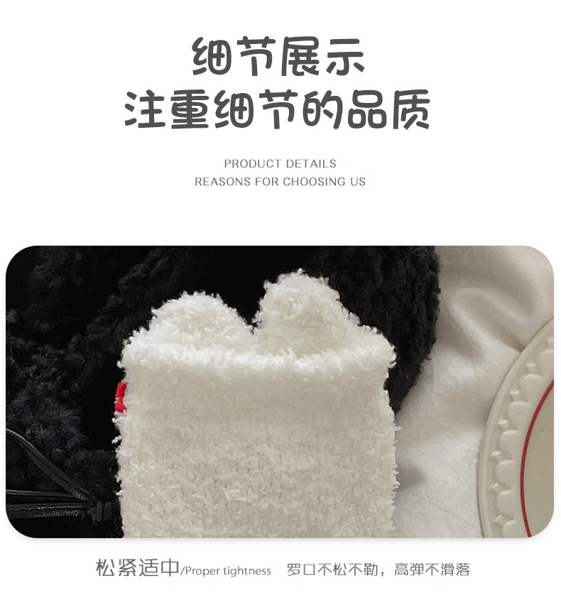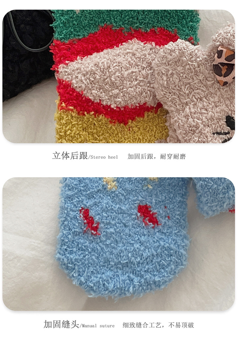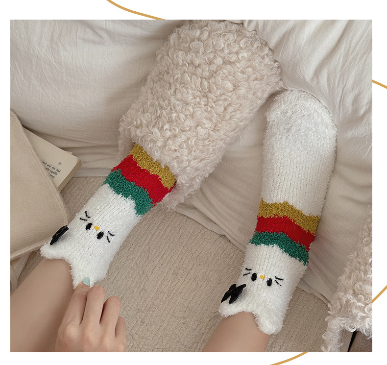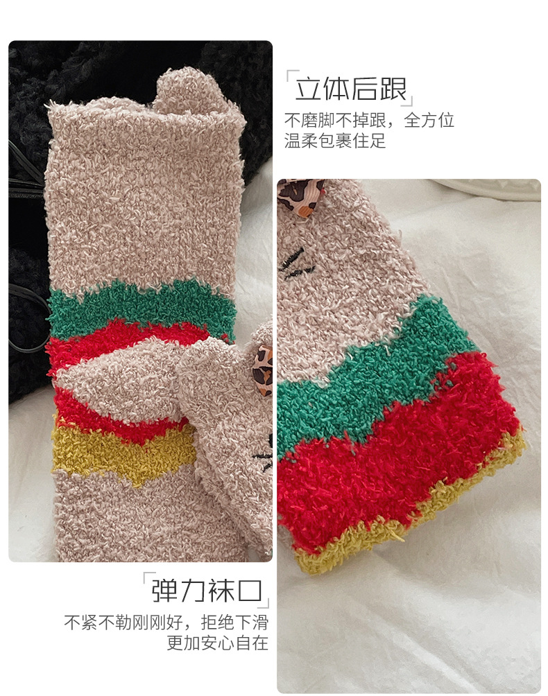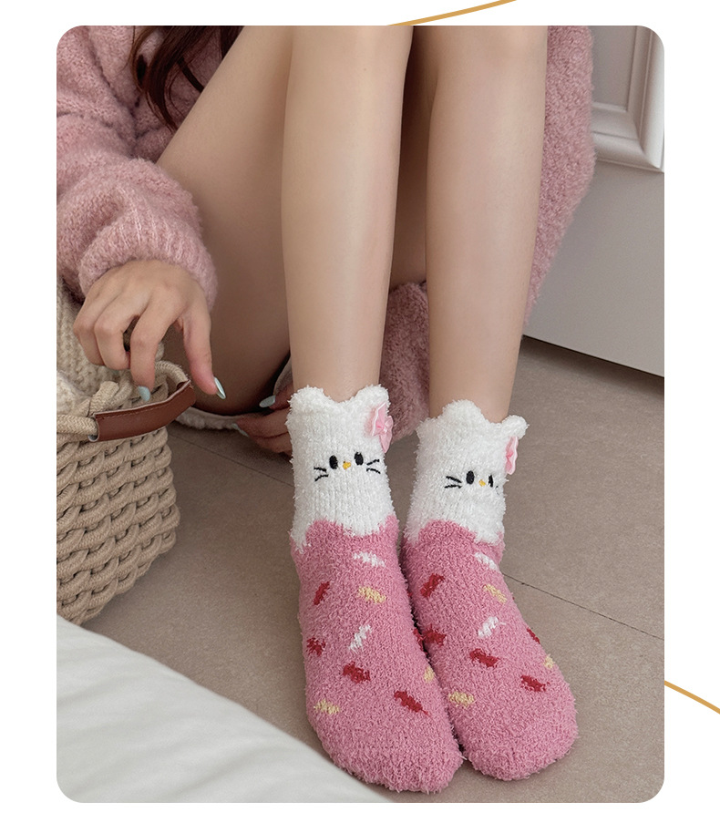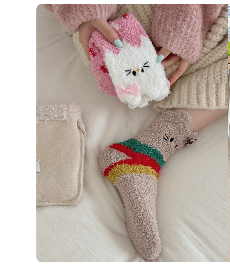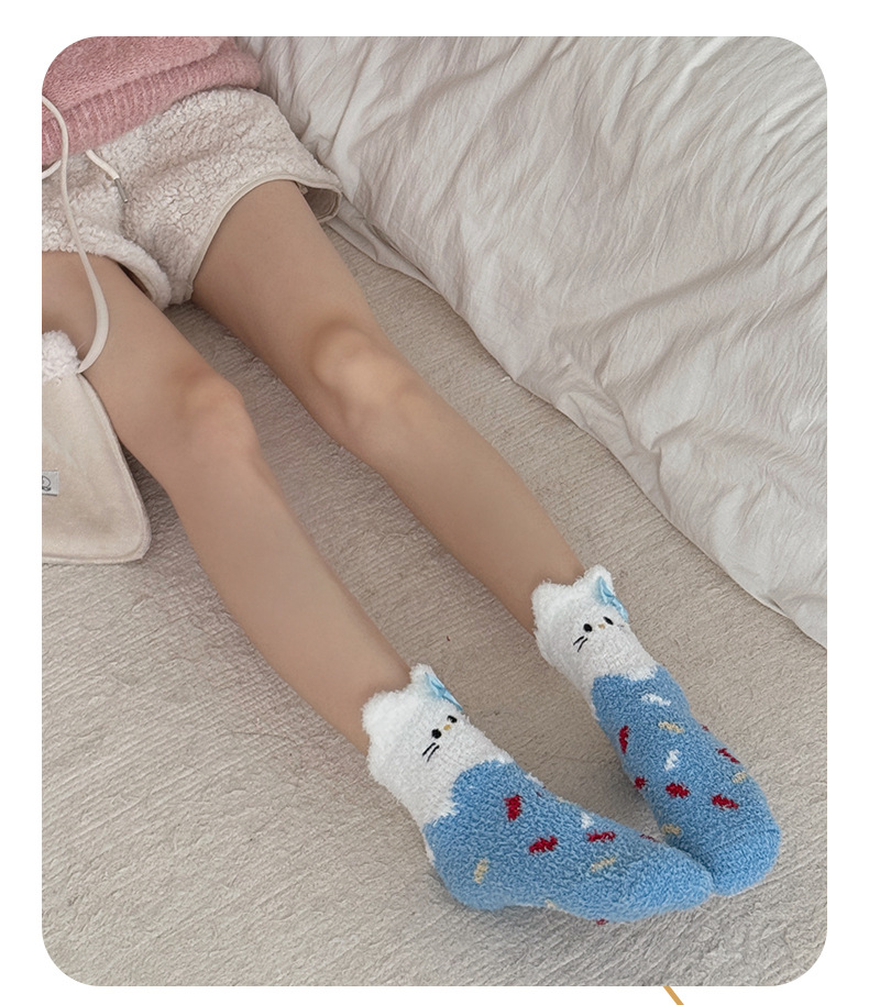 刺绣猫咪珊瑚绒袜子女可爱立体蝴蝶结中筒袜冬季保暖不掉毛睡眠袜