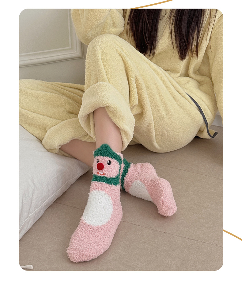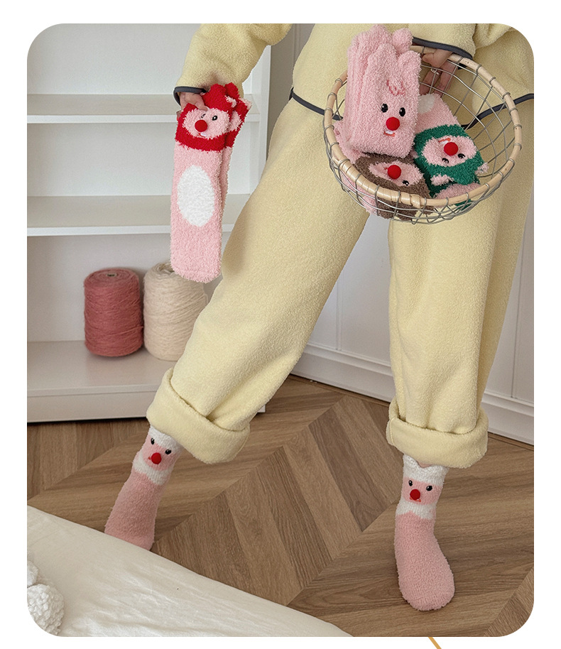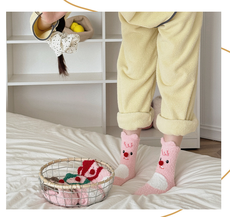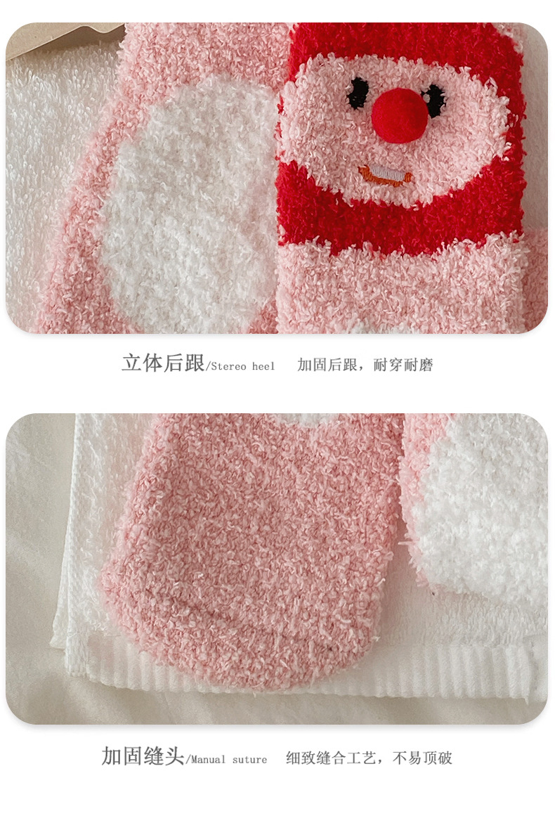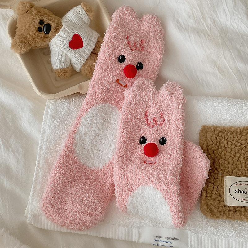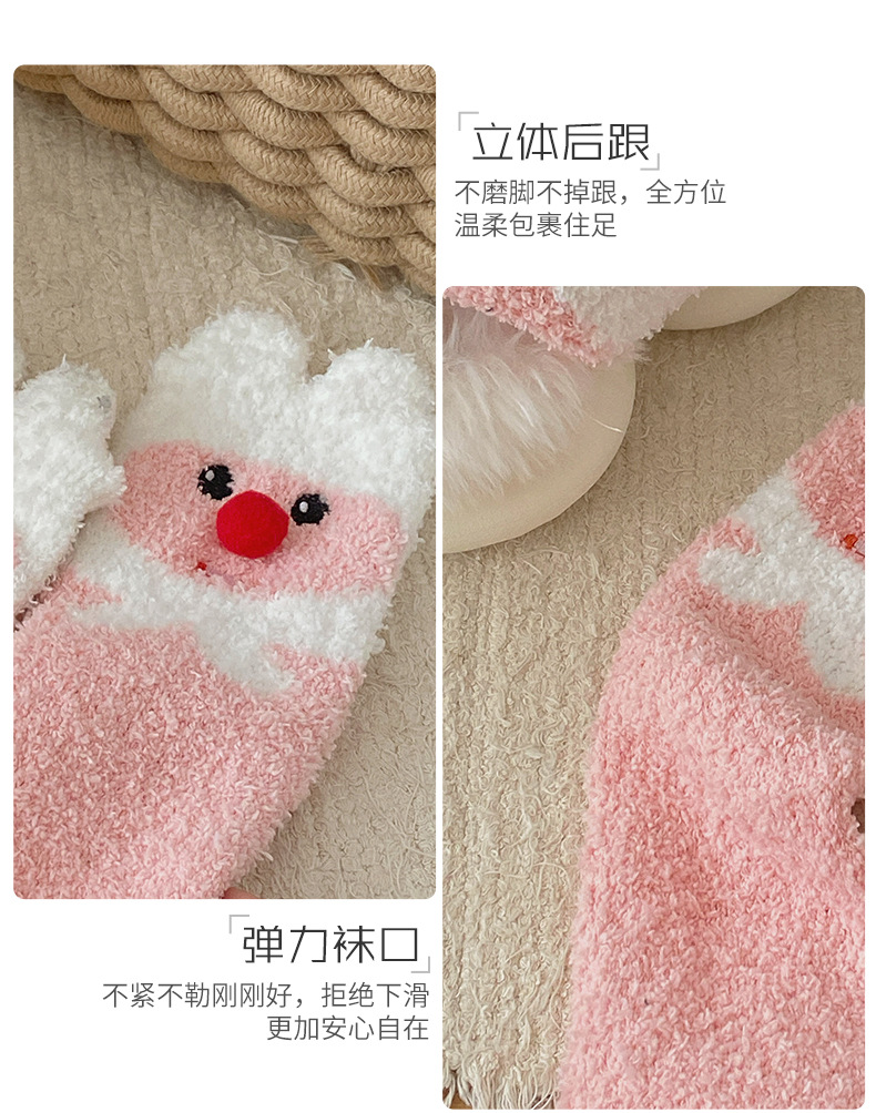 小海狸珊瑚绒袜子女冬季保暖加厚中筒袜粉色卡通可爱小毛球地板袜