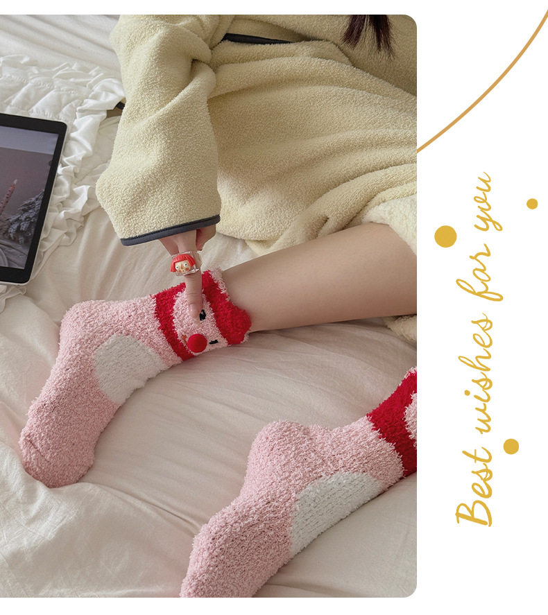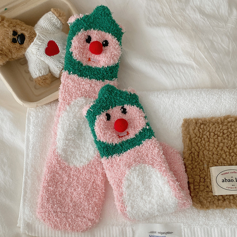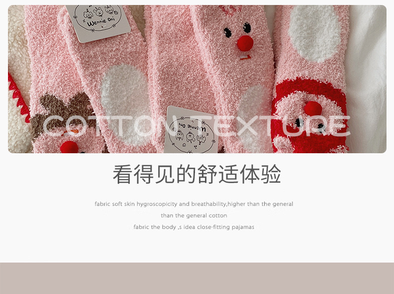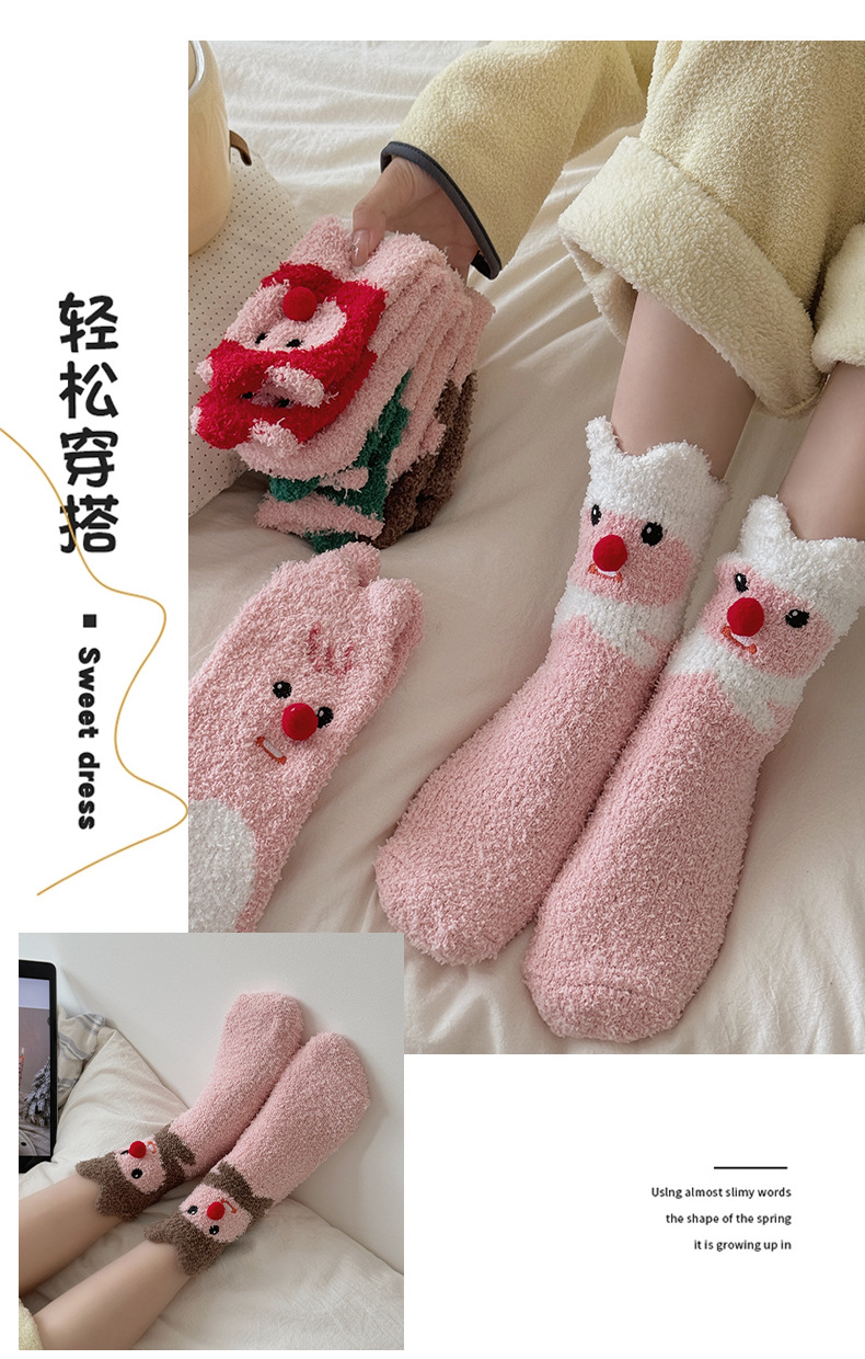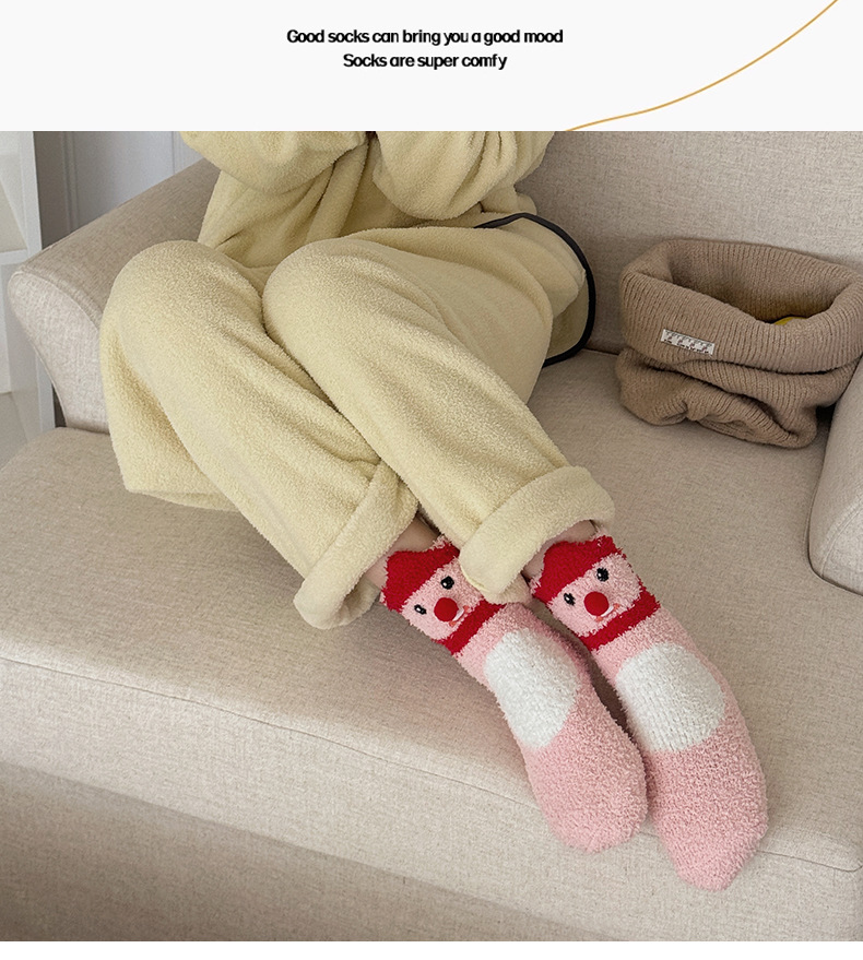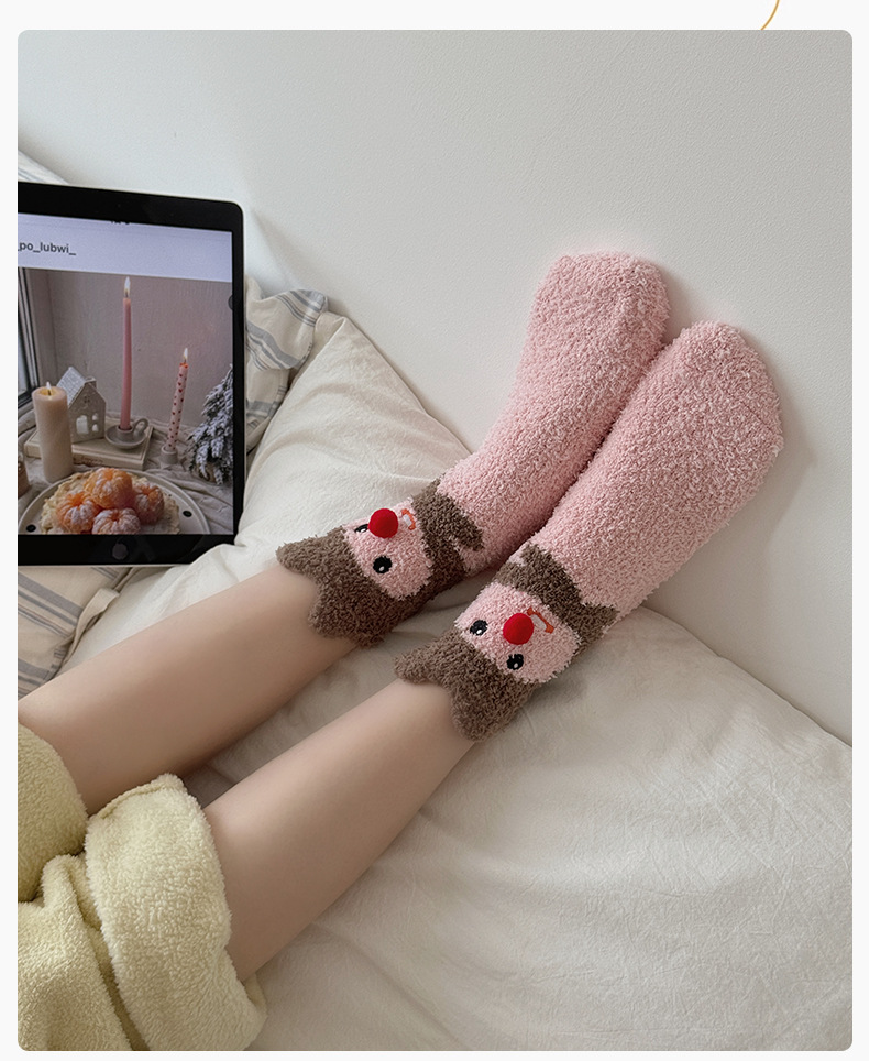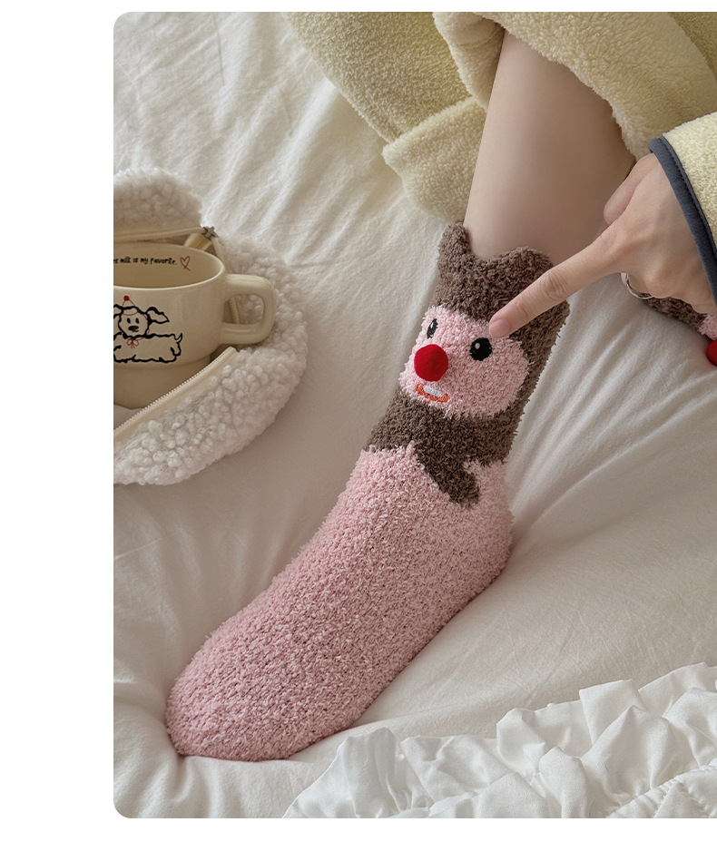 小海狸珊瑚绒袜子女冬季保暖加厚中筒袜粉色卡通可爱小毛球地板袜
