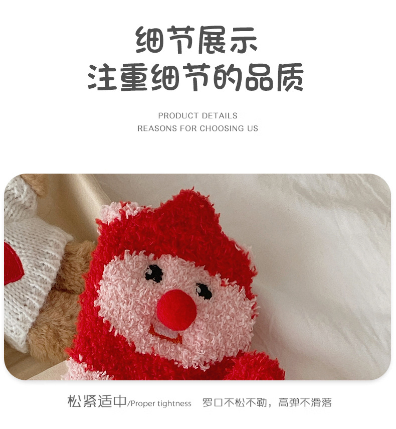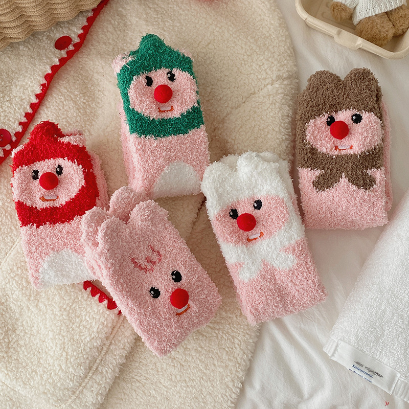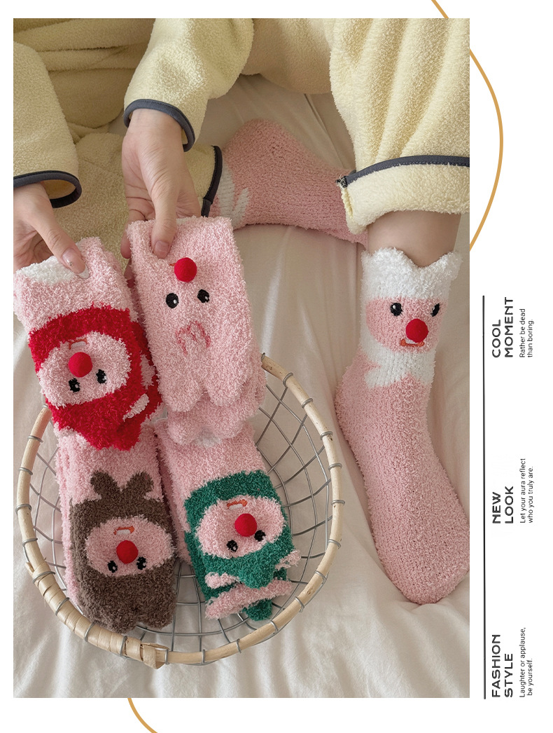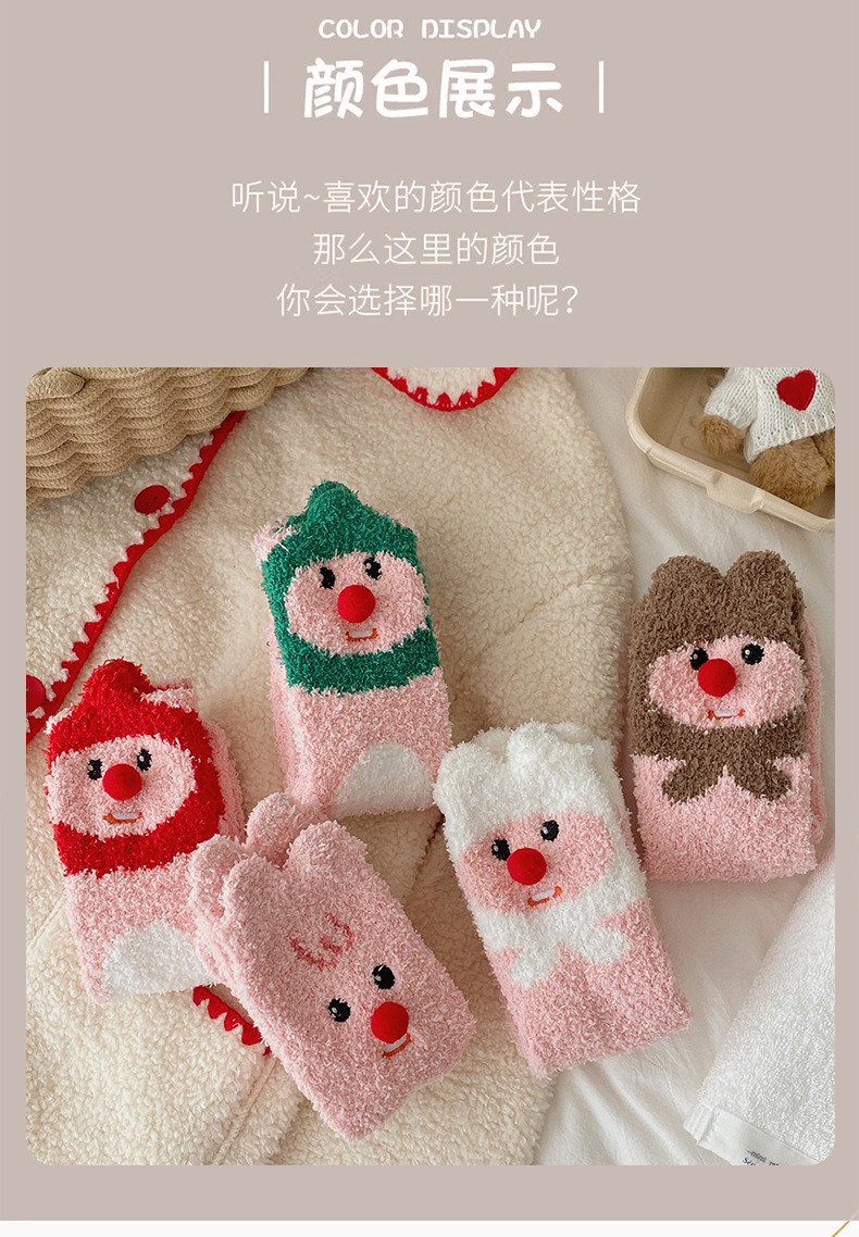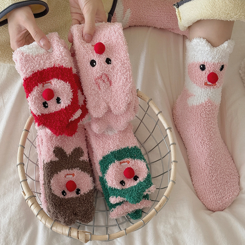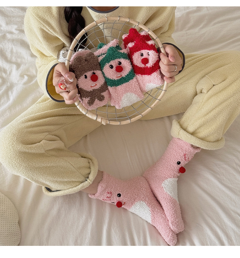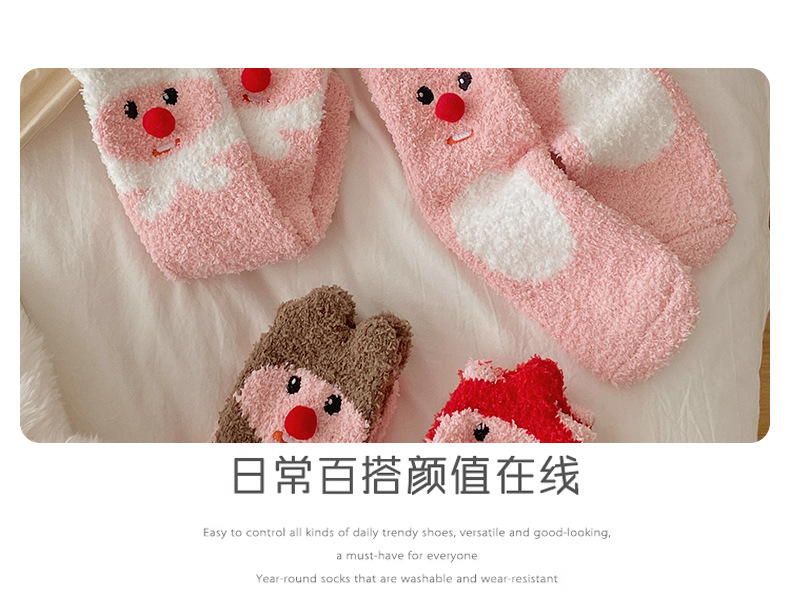 小海狸珊瑚绒袜子女冬季保暖加厚中筒袜粉色卡通可爱小毛球地板袜