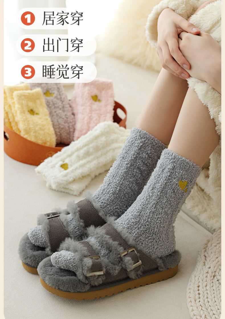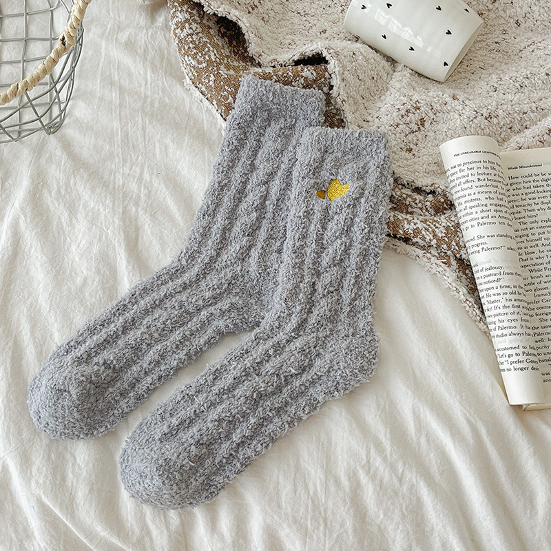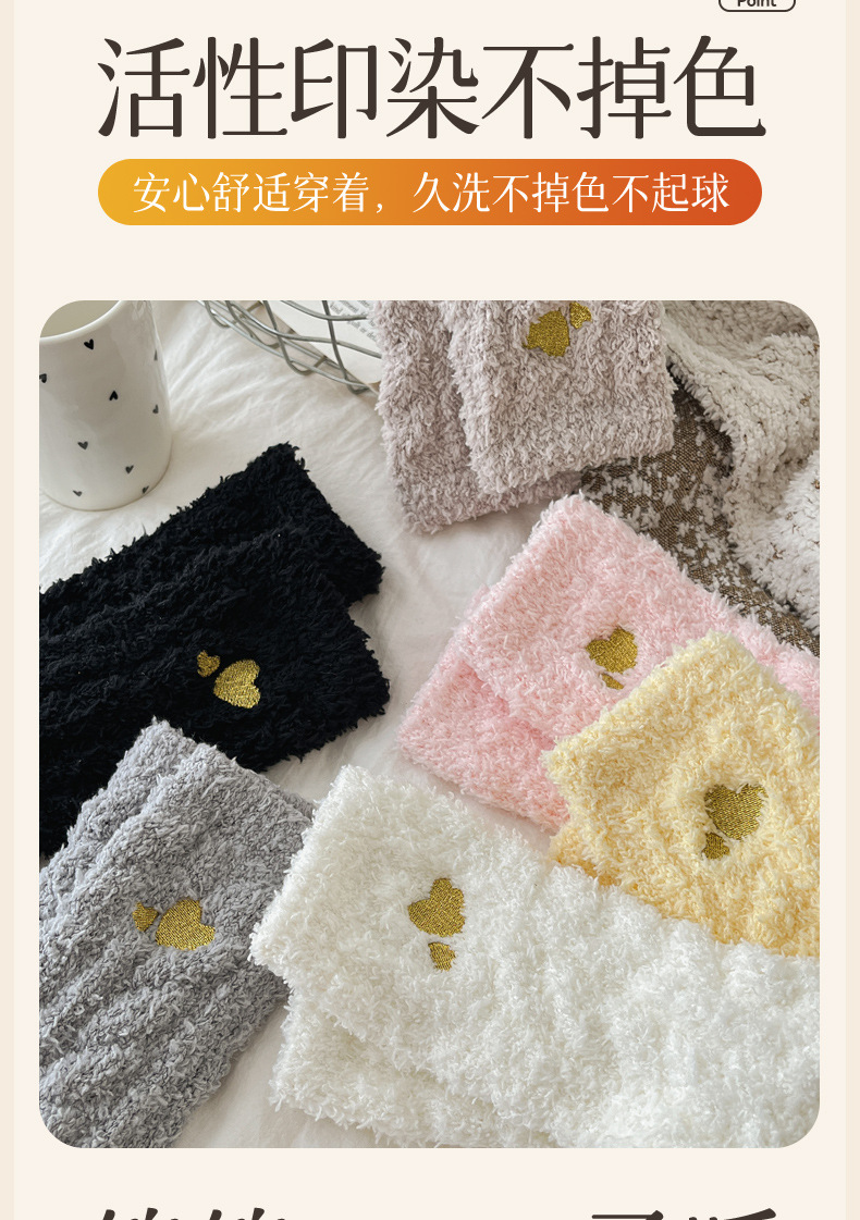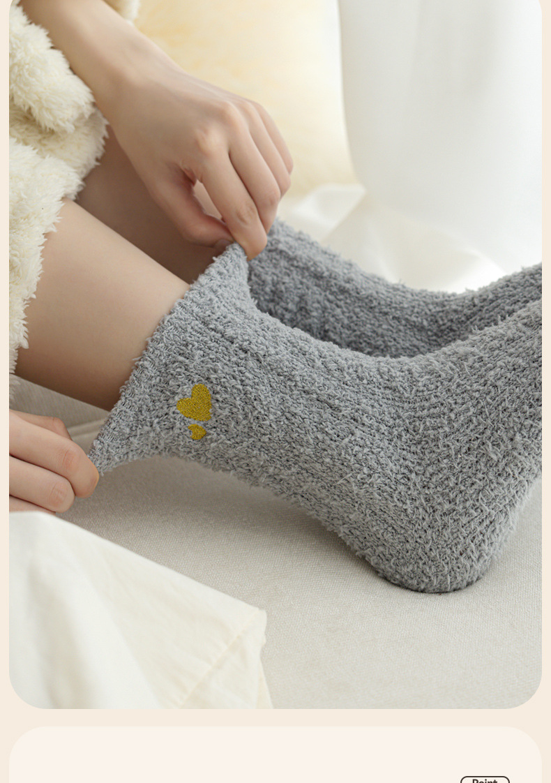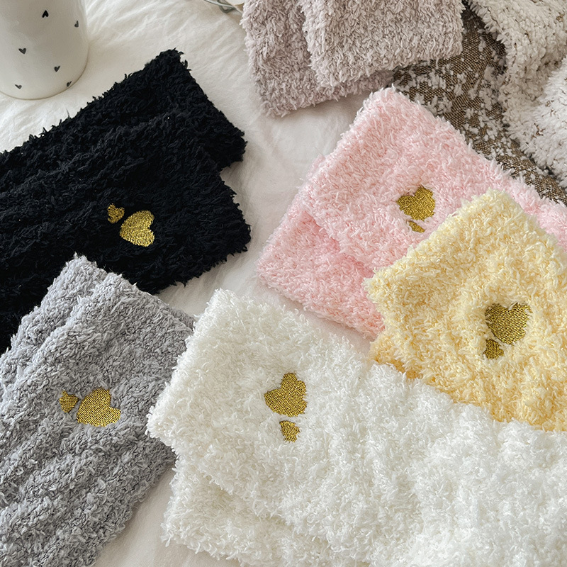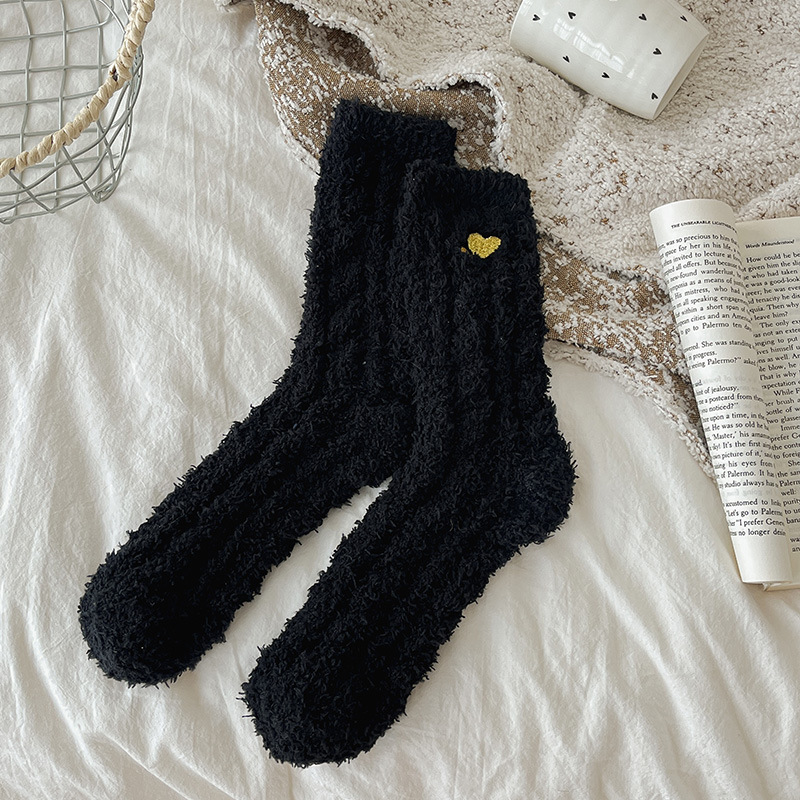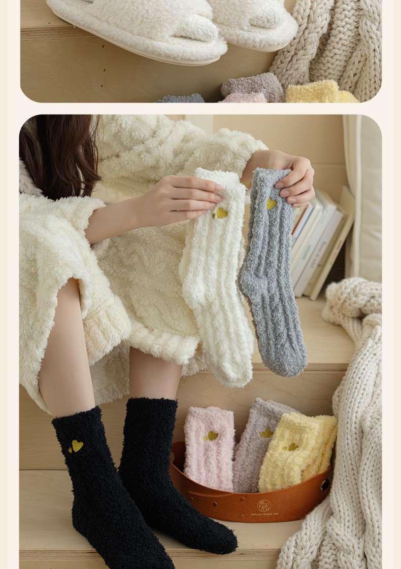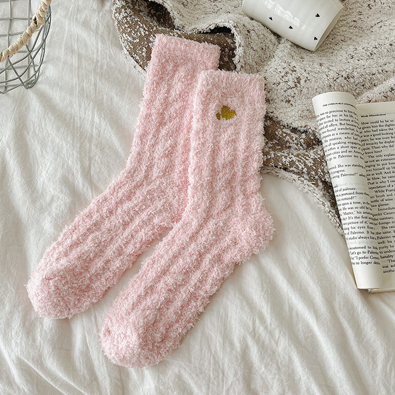 珊瑚绒袜子女甜美爱心刺绣中筒袜冬季加厚保暖袜子不掉毛睡眠袜女