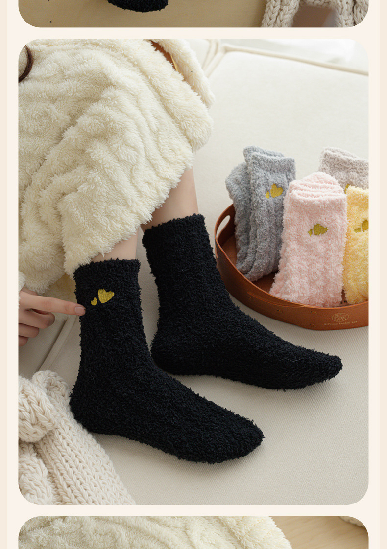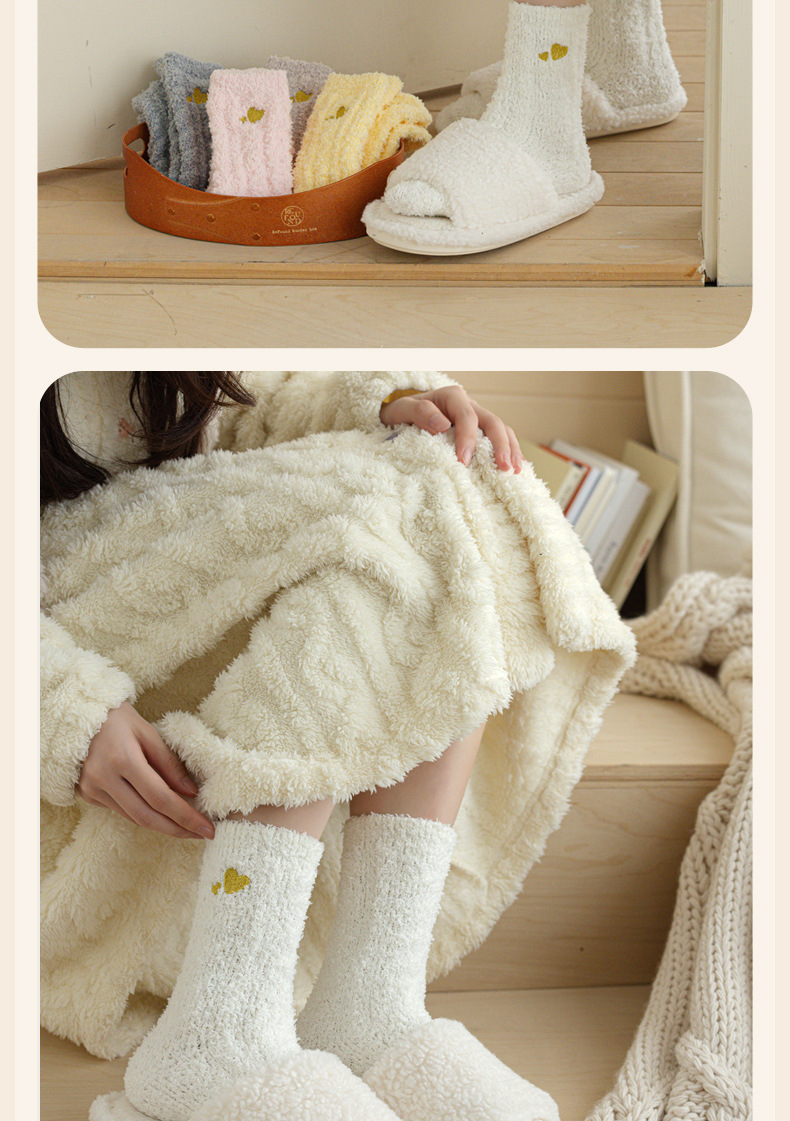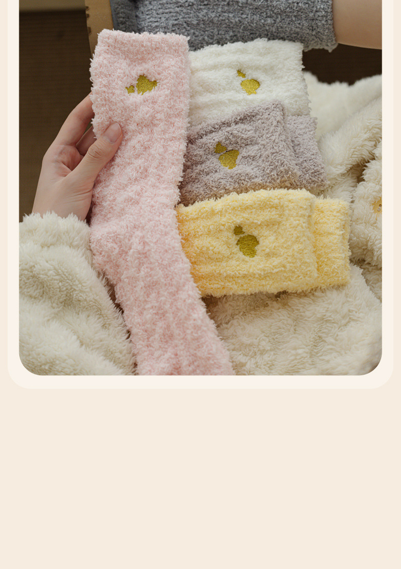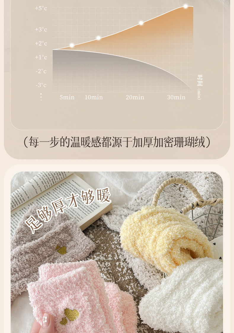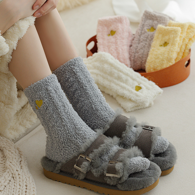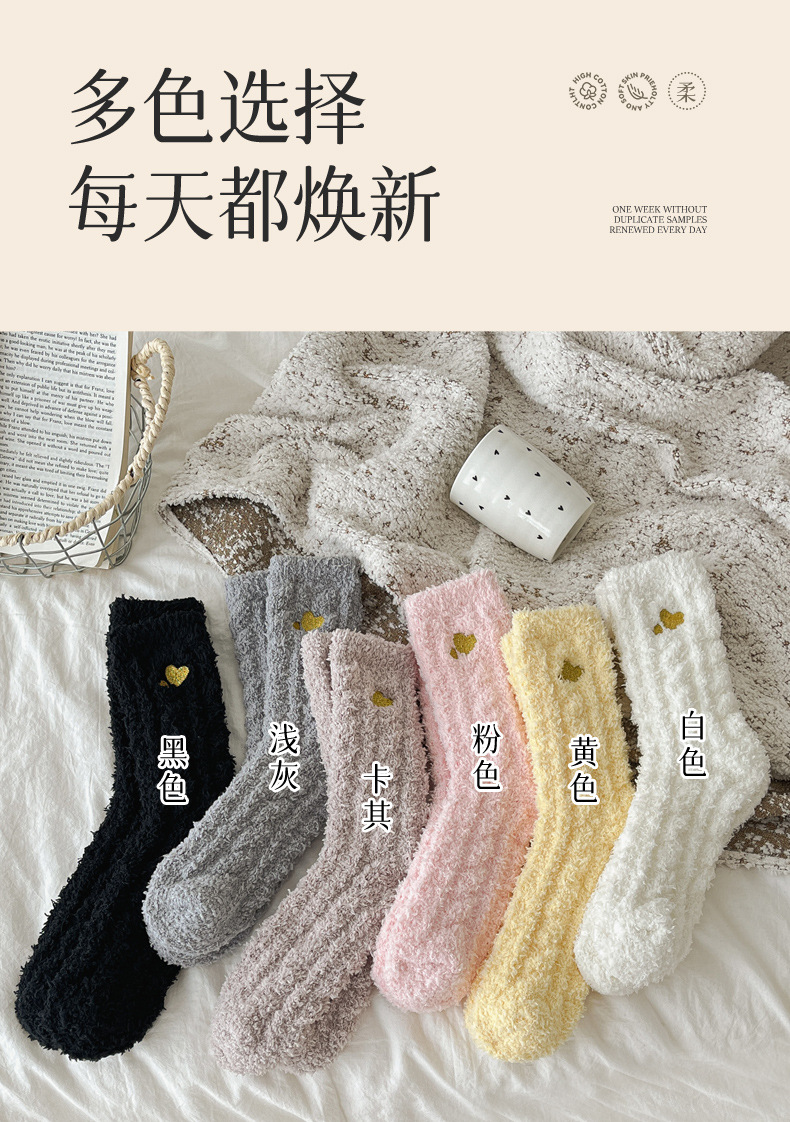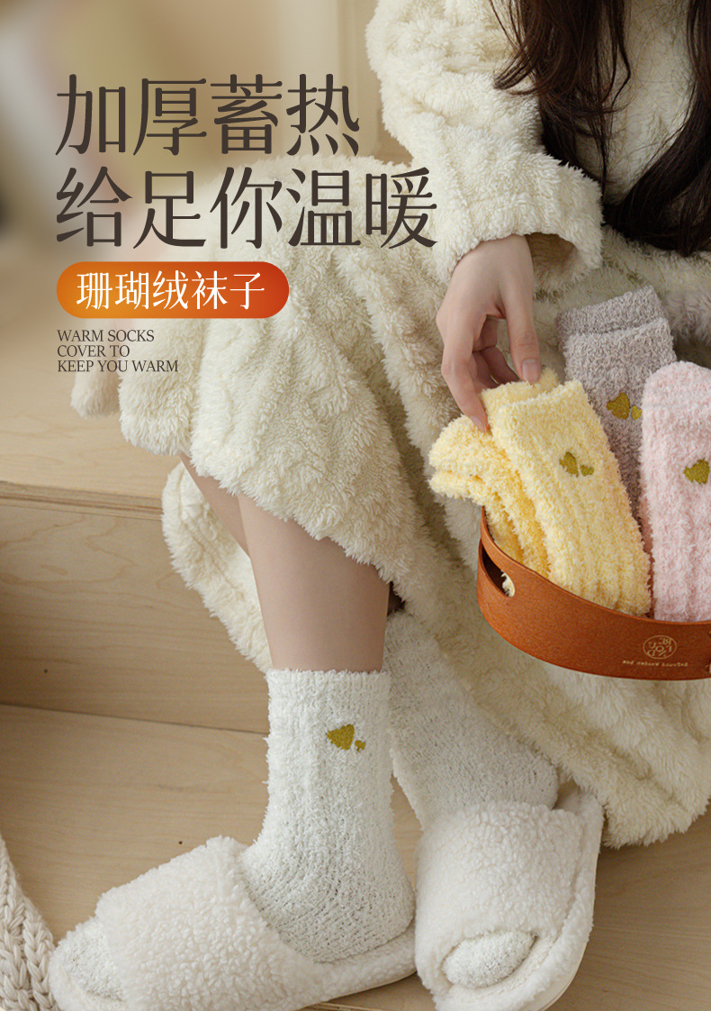 珊瑚绒袜子女甜美爱心刺绣中筒袜冬季加厚保暖袜子不掉毛睡眠袜女
