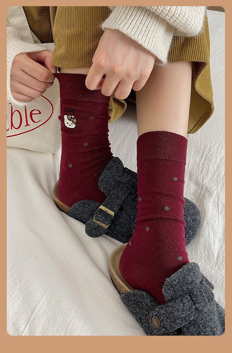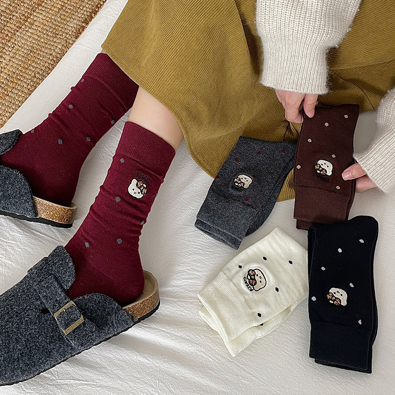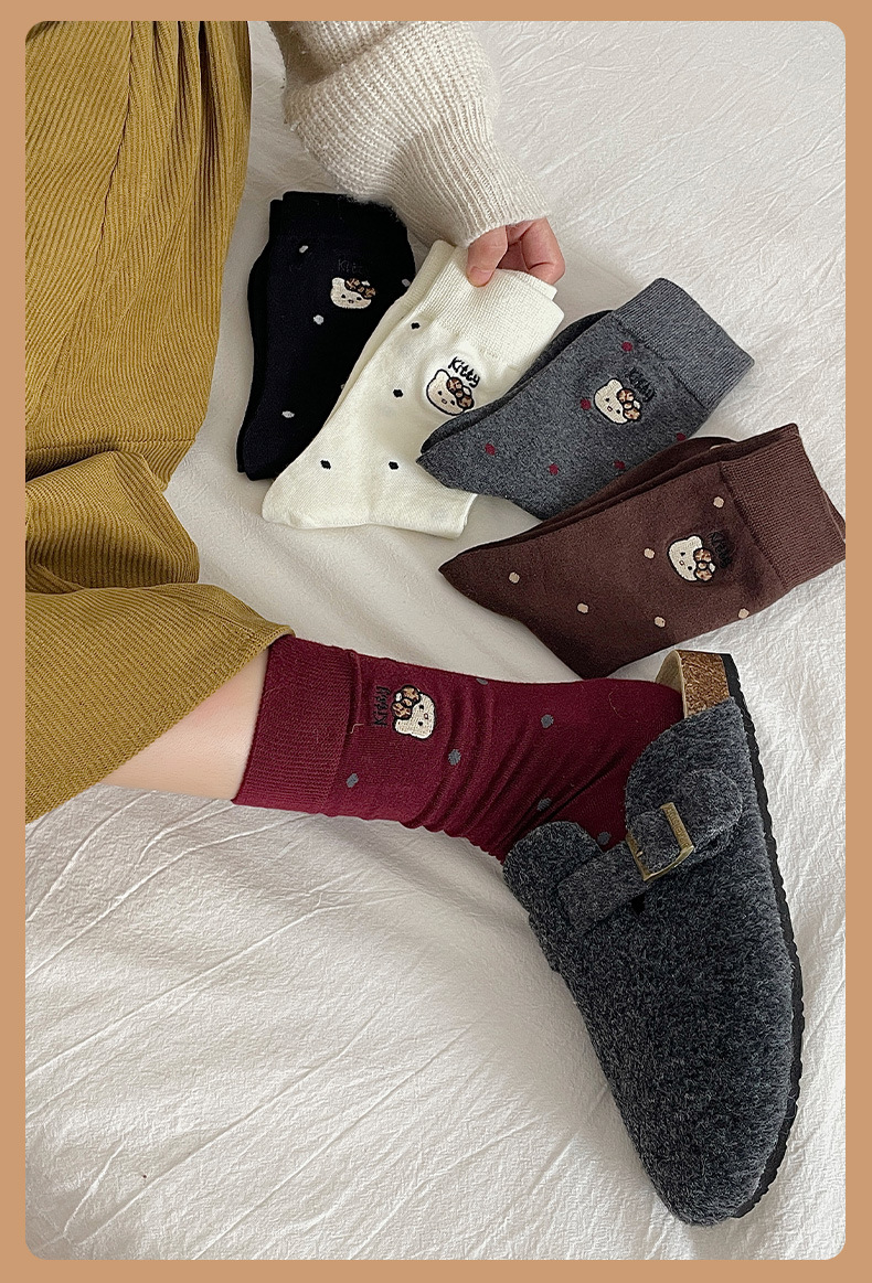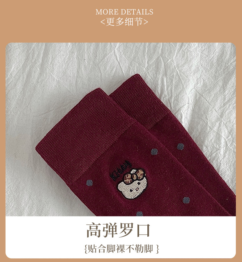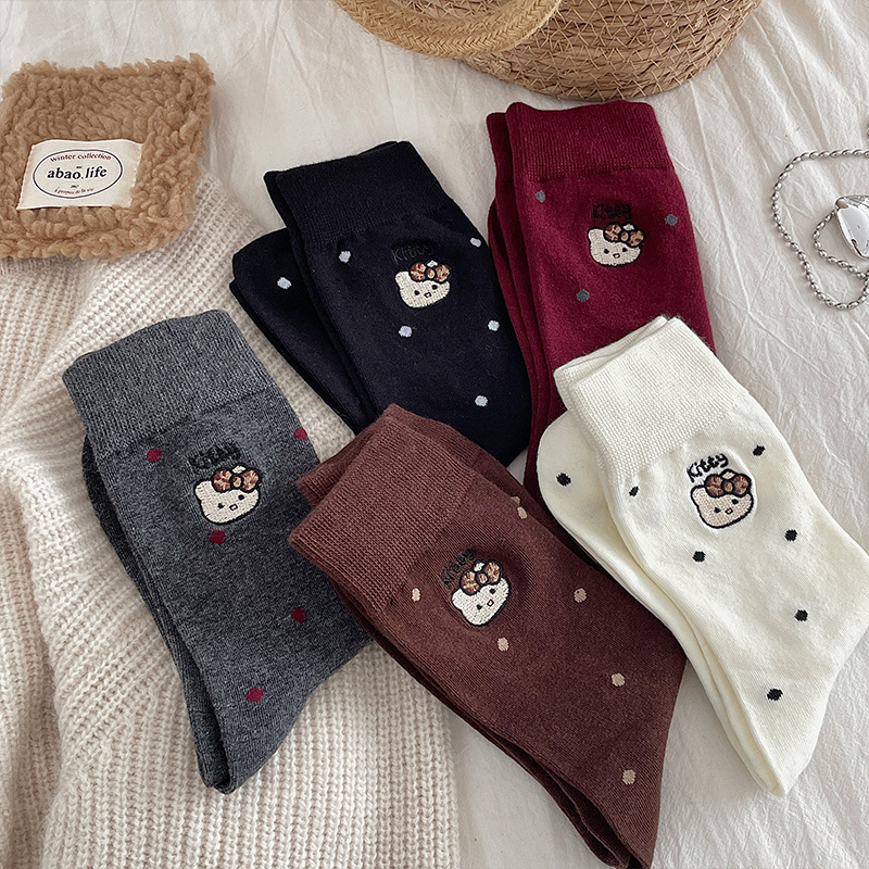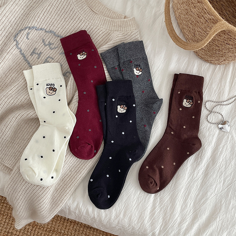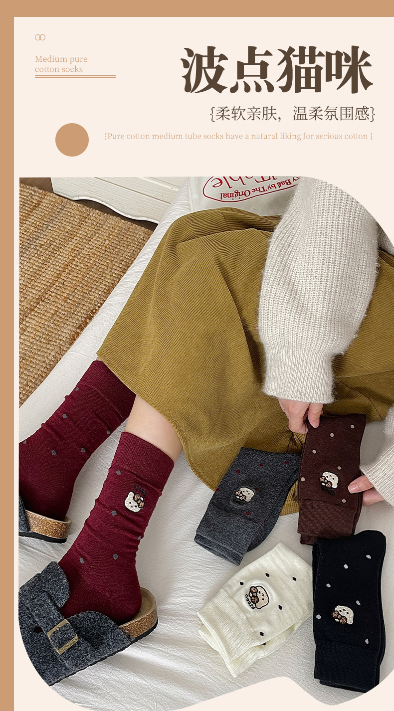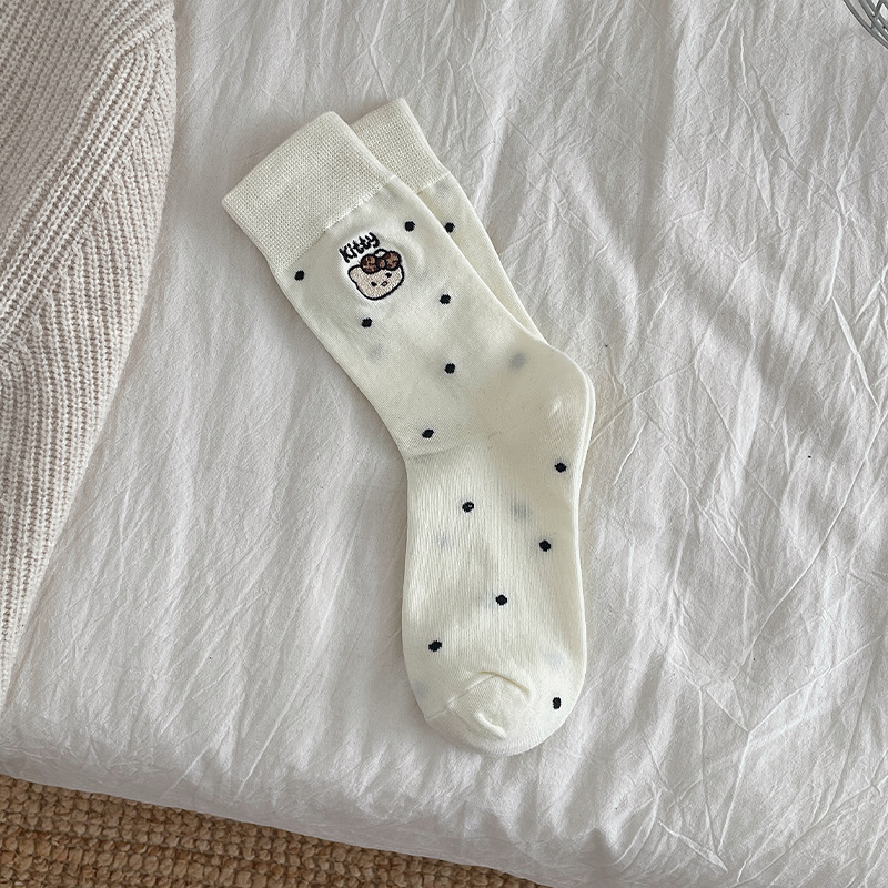 刺绣猫咪袜子女棉袜日系波点中筒袜网红卡通可爱袜子韩版堆堆袜女