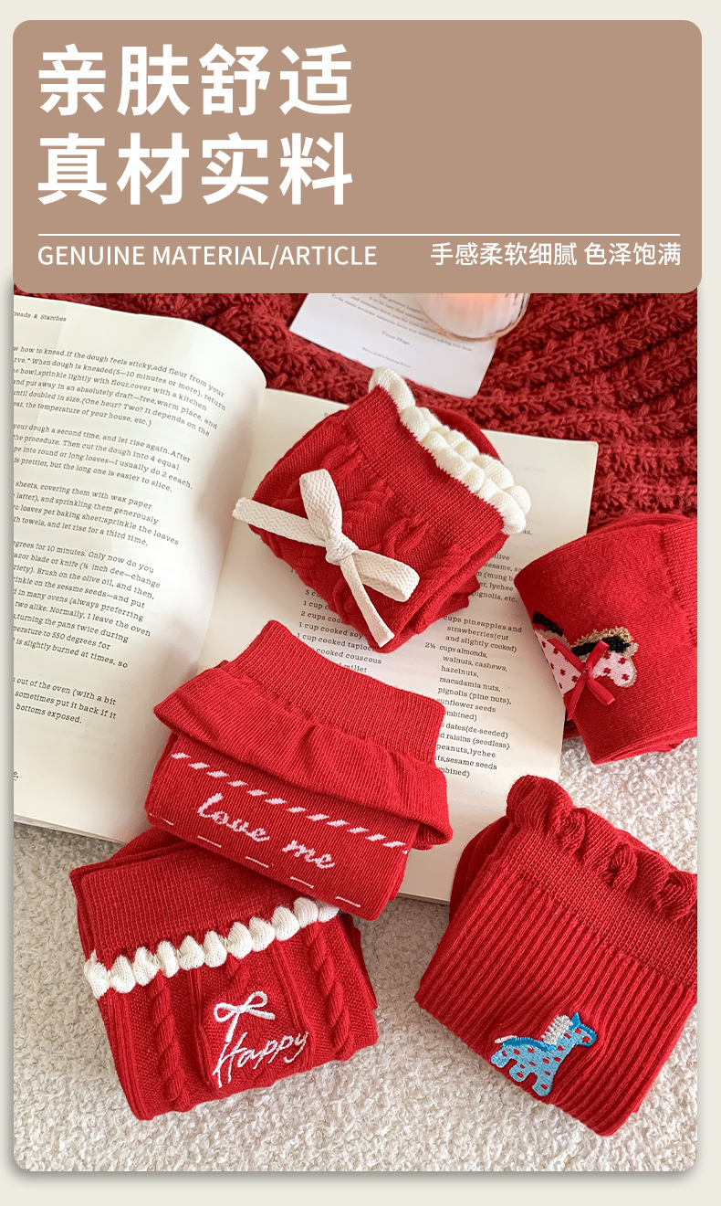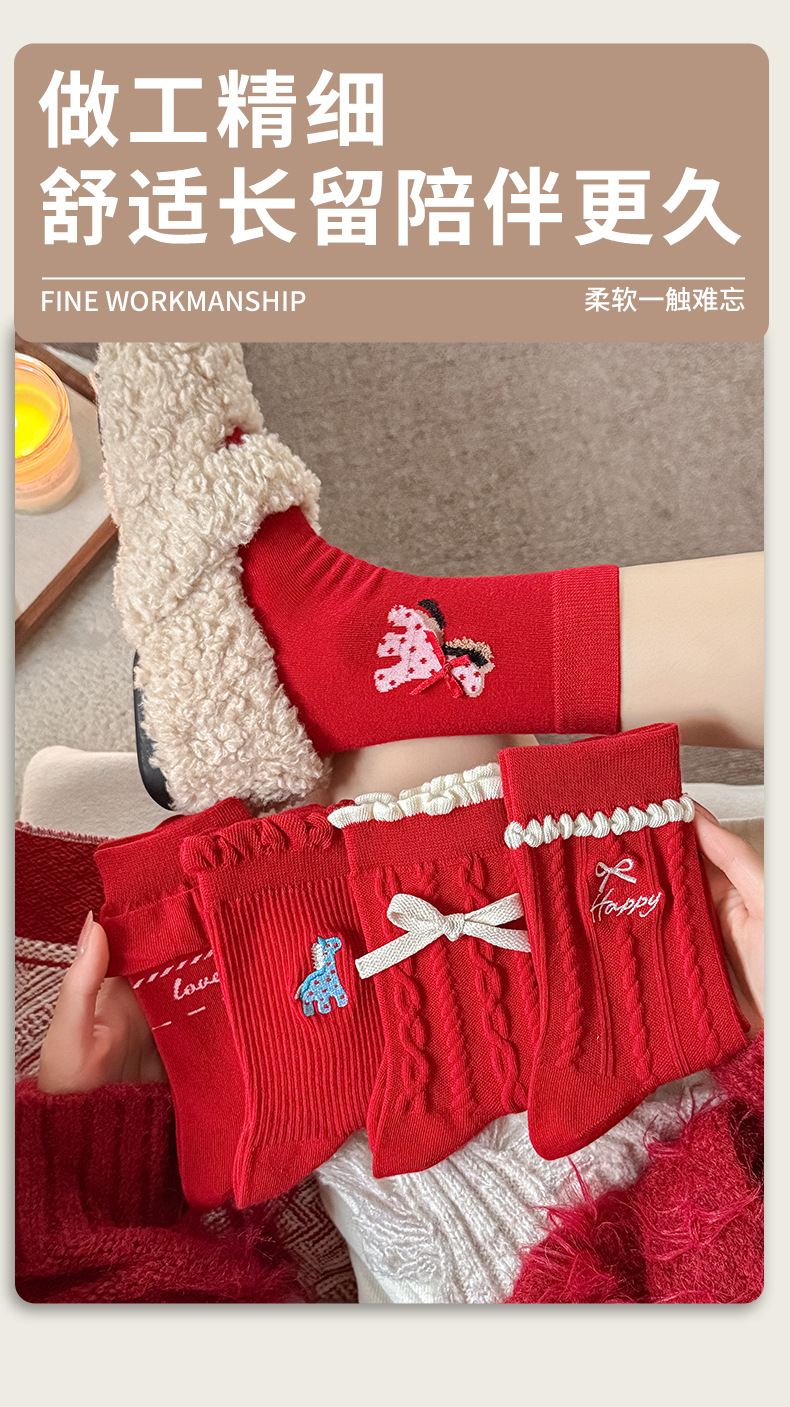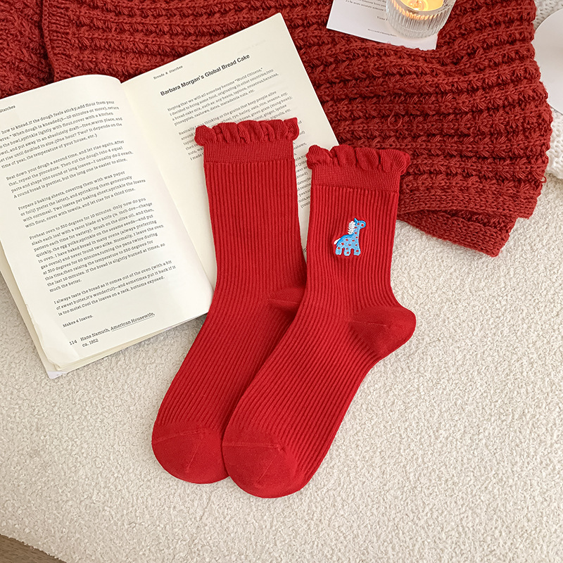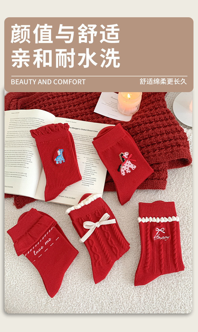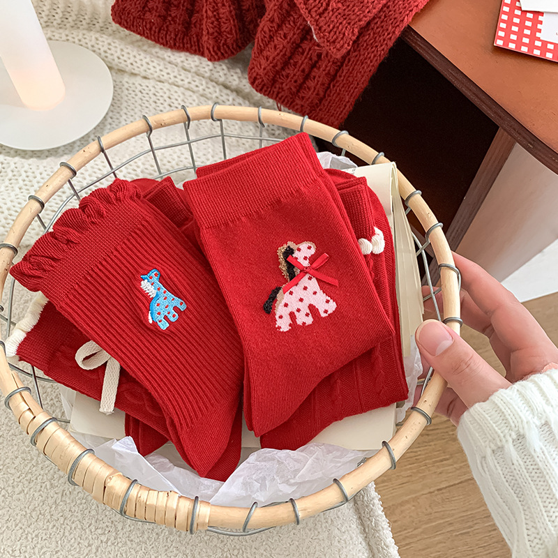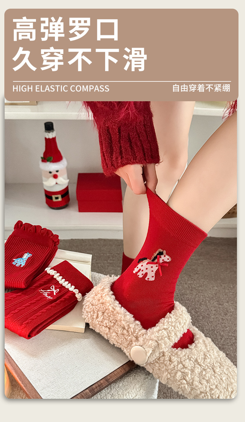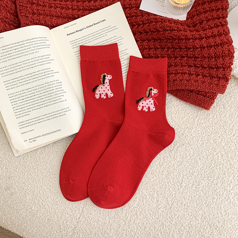 红色袜子女可爱卡通小马中筒袜甜美花边蝴蝶结堆堆袜新年马年袜子