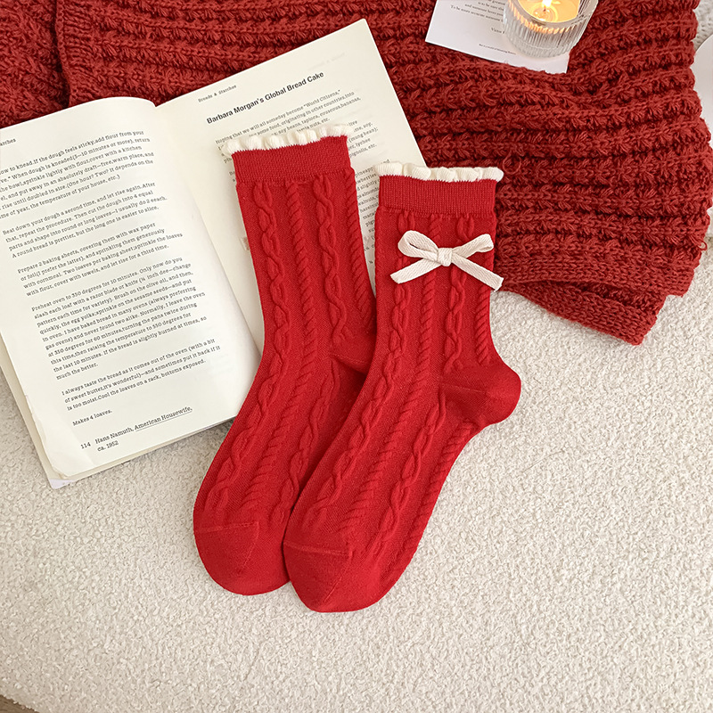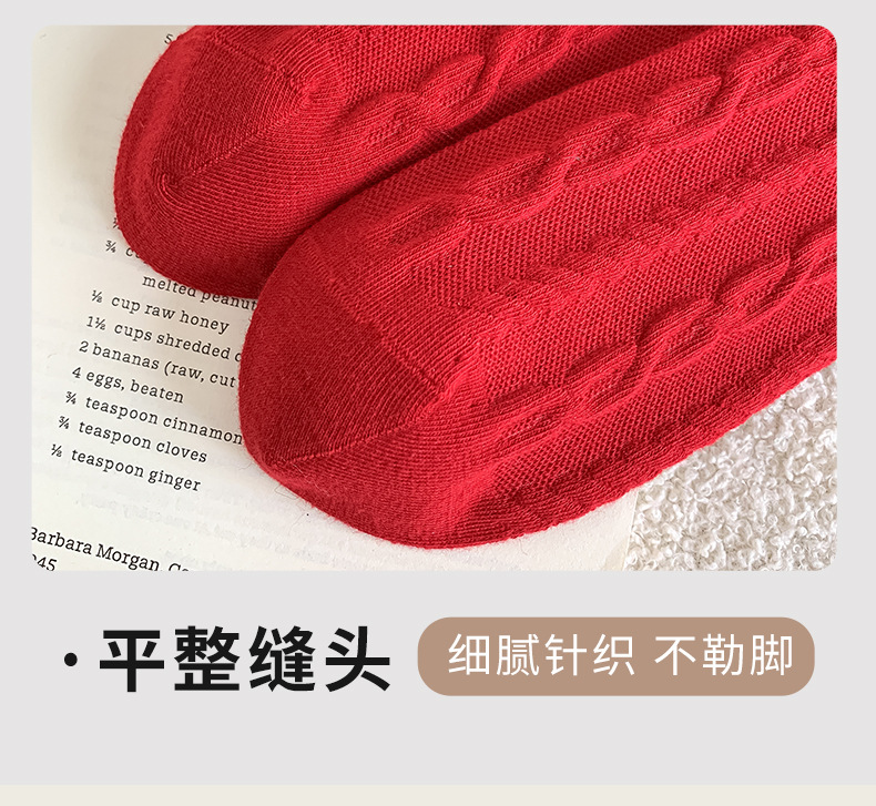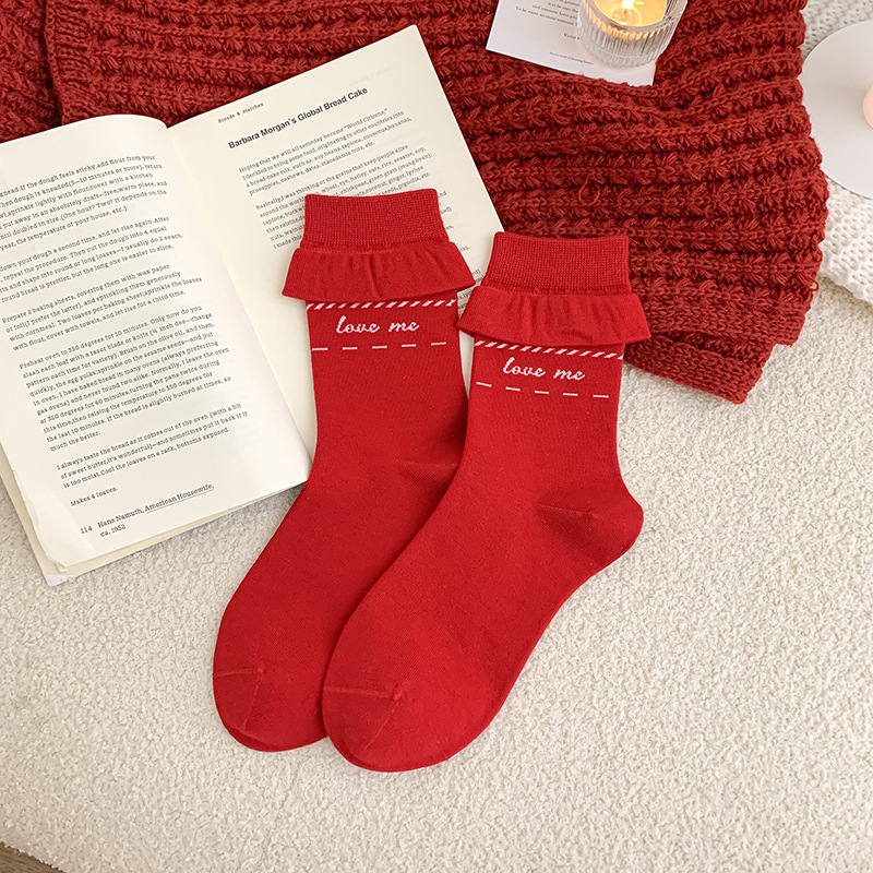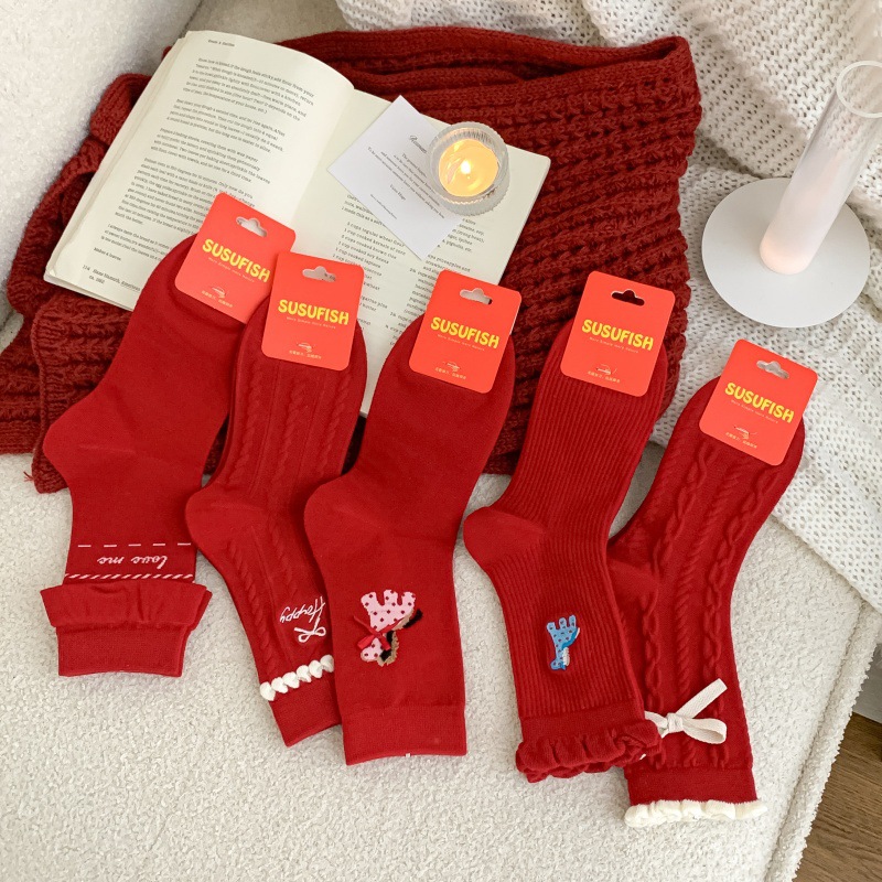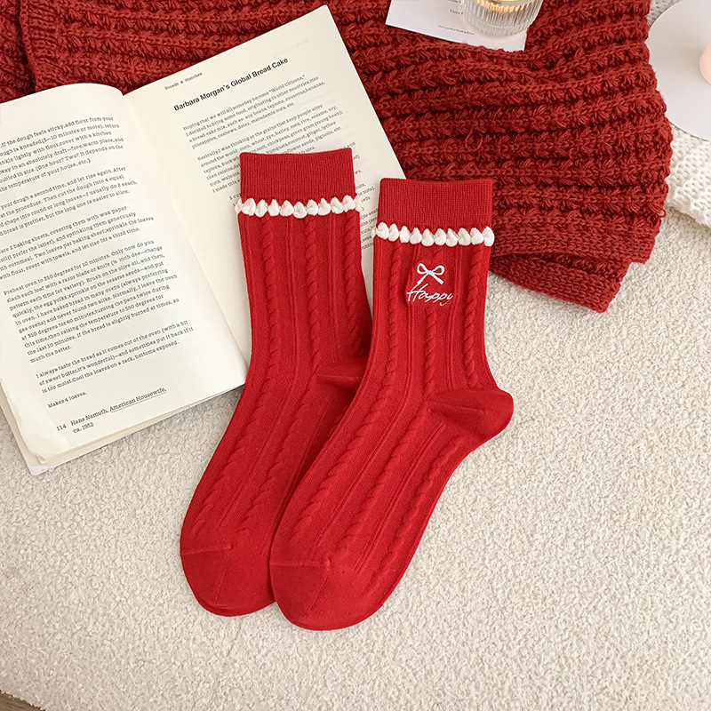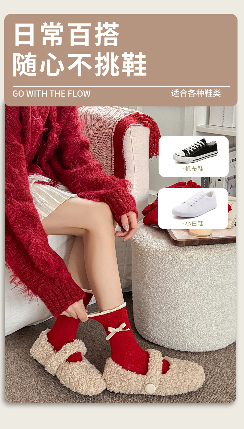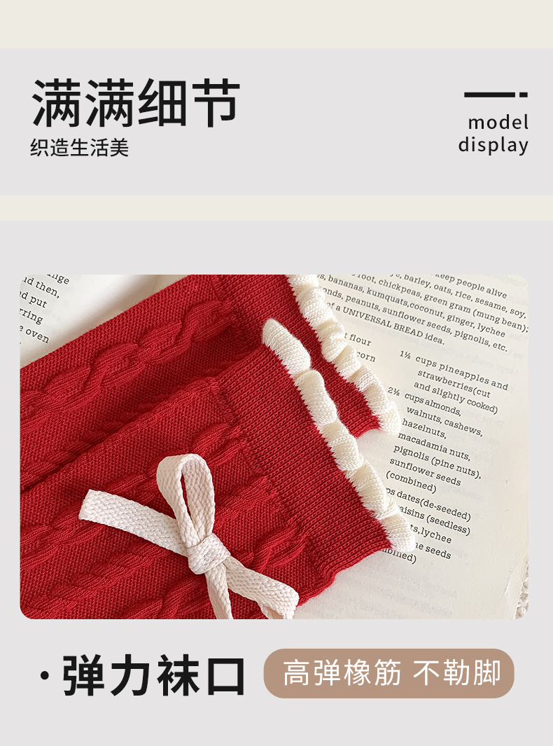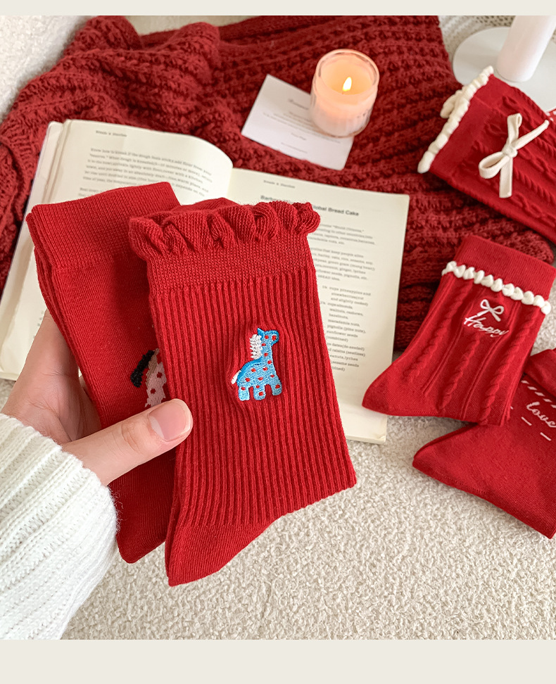 红色袜子女可爱卡通小马中筒袜甜美花边蝴蝶结堆堆袜新年马年袜子