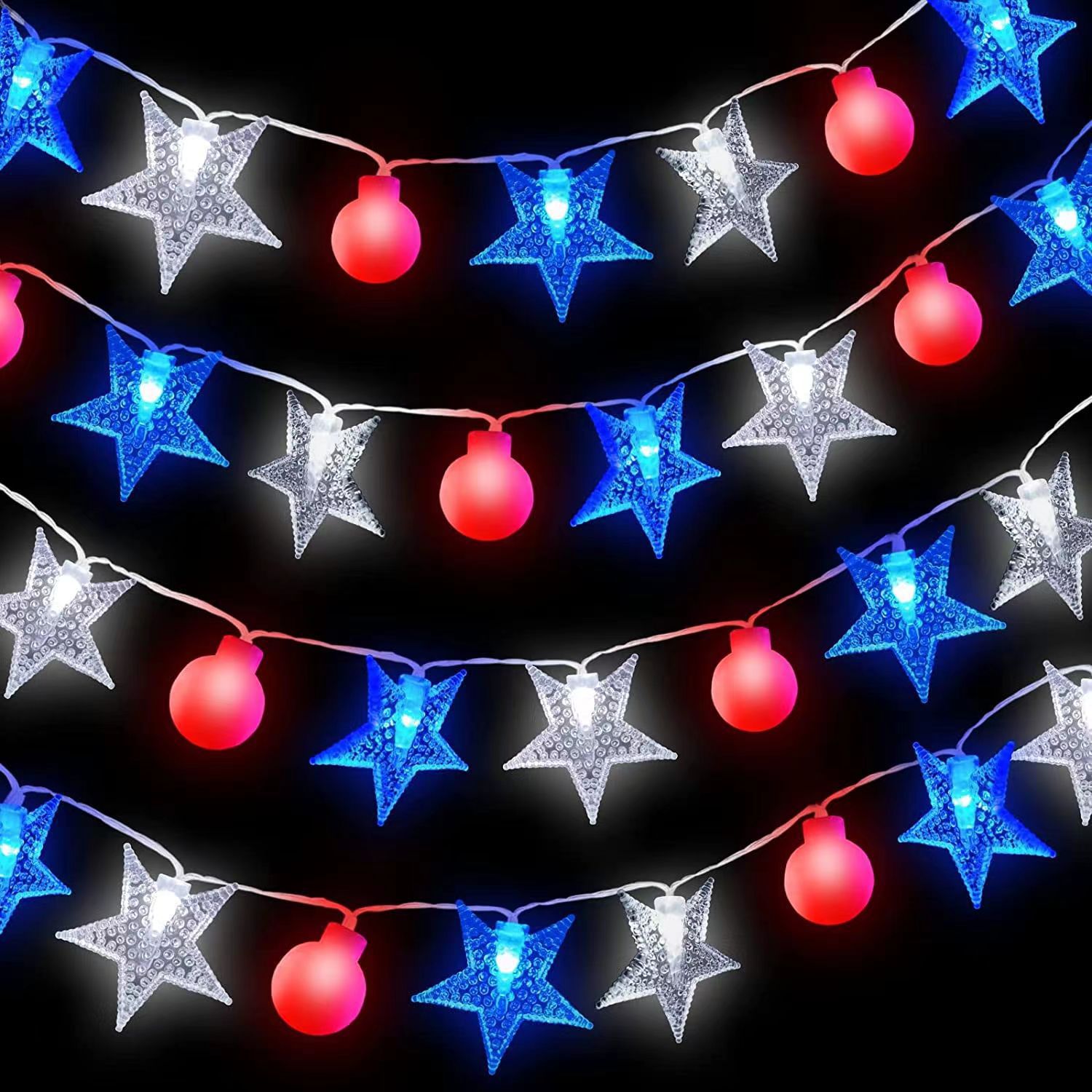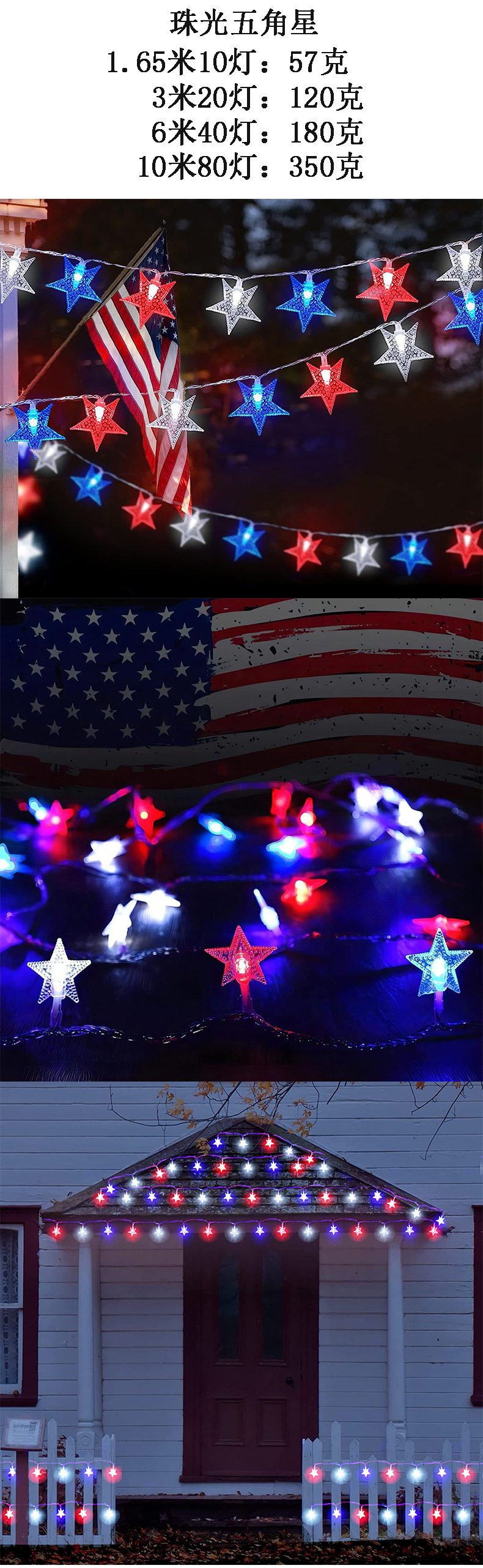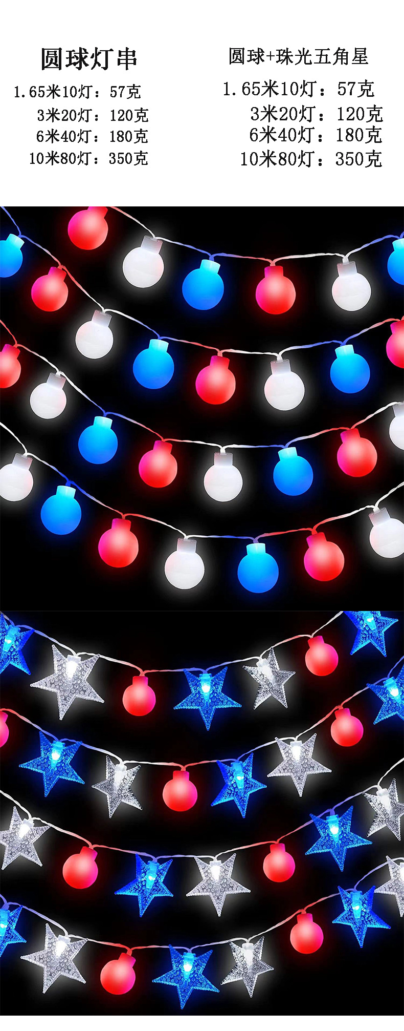 跨境美国独立日灯串红白蓝五角星圆球串灯国旗独立日装饰彩灯批发