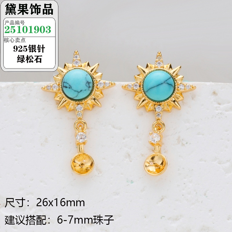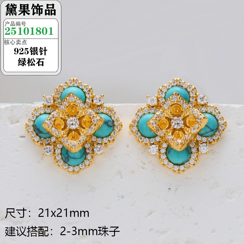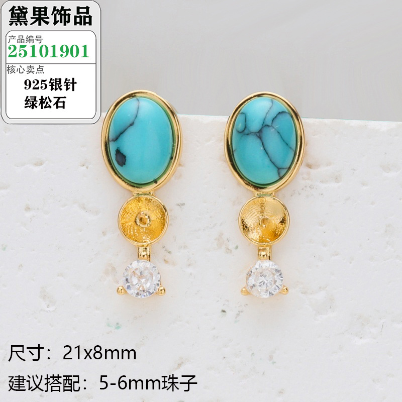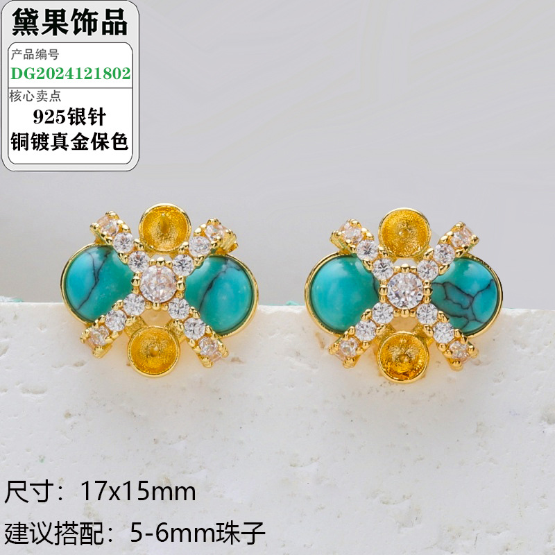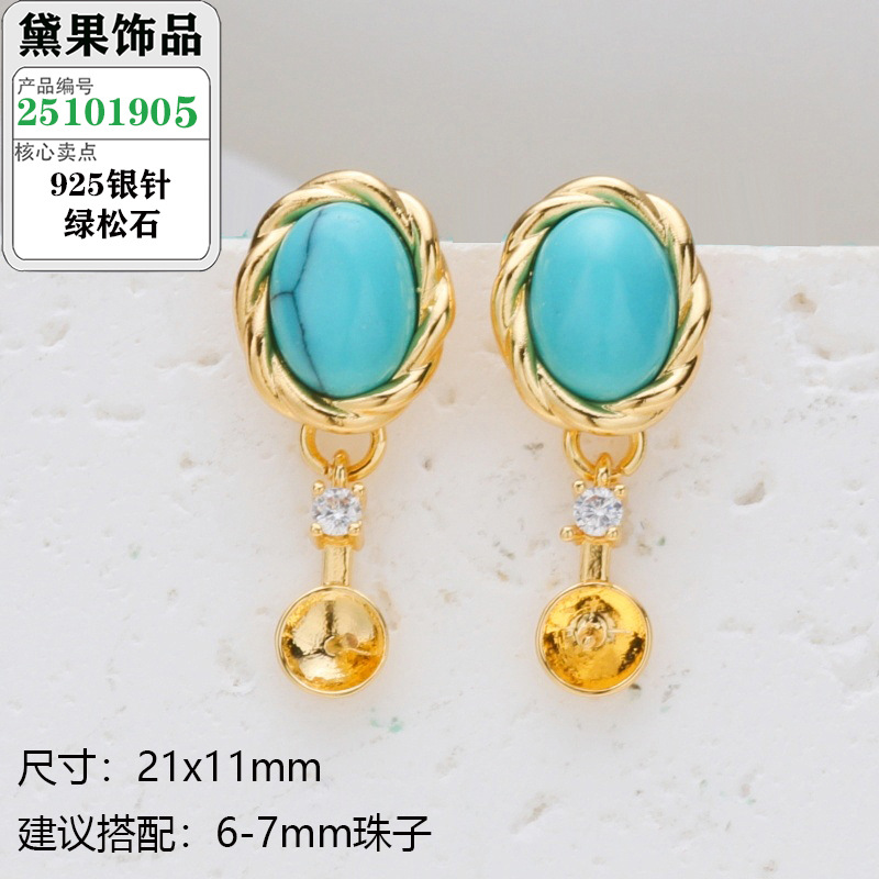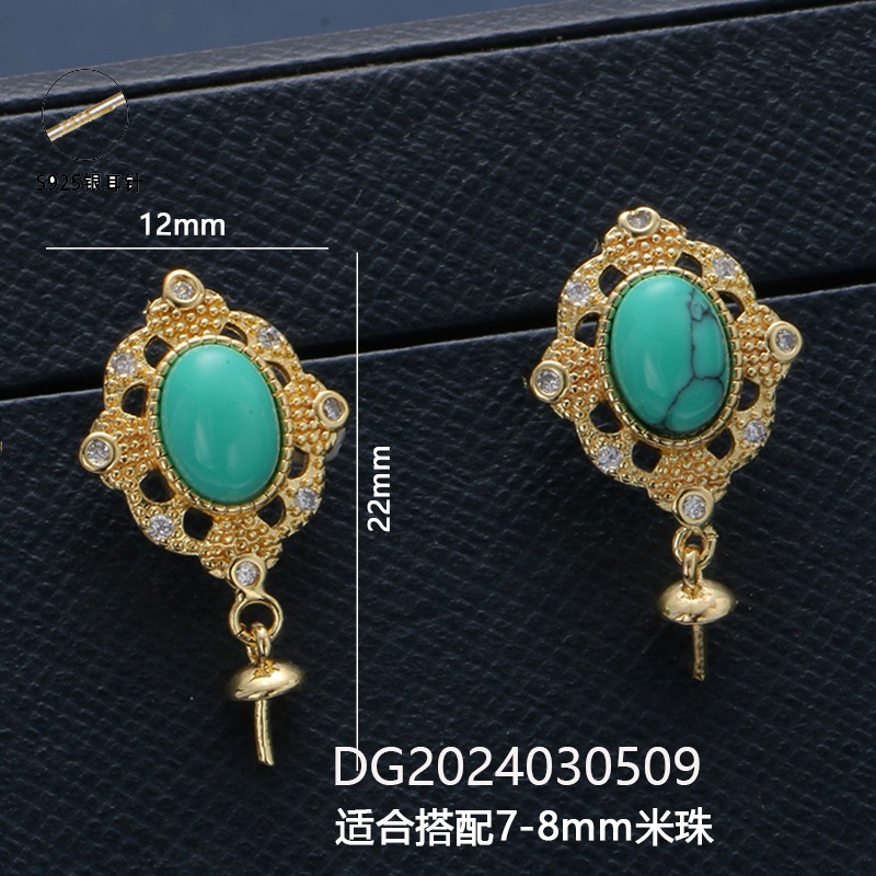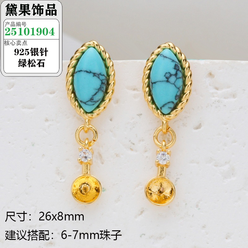 S925银针珍珠耳钉配件复古波西米亚风绿松石系列耳饰镶嵌类空托
