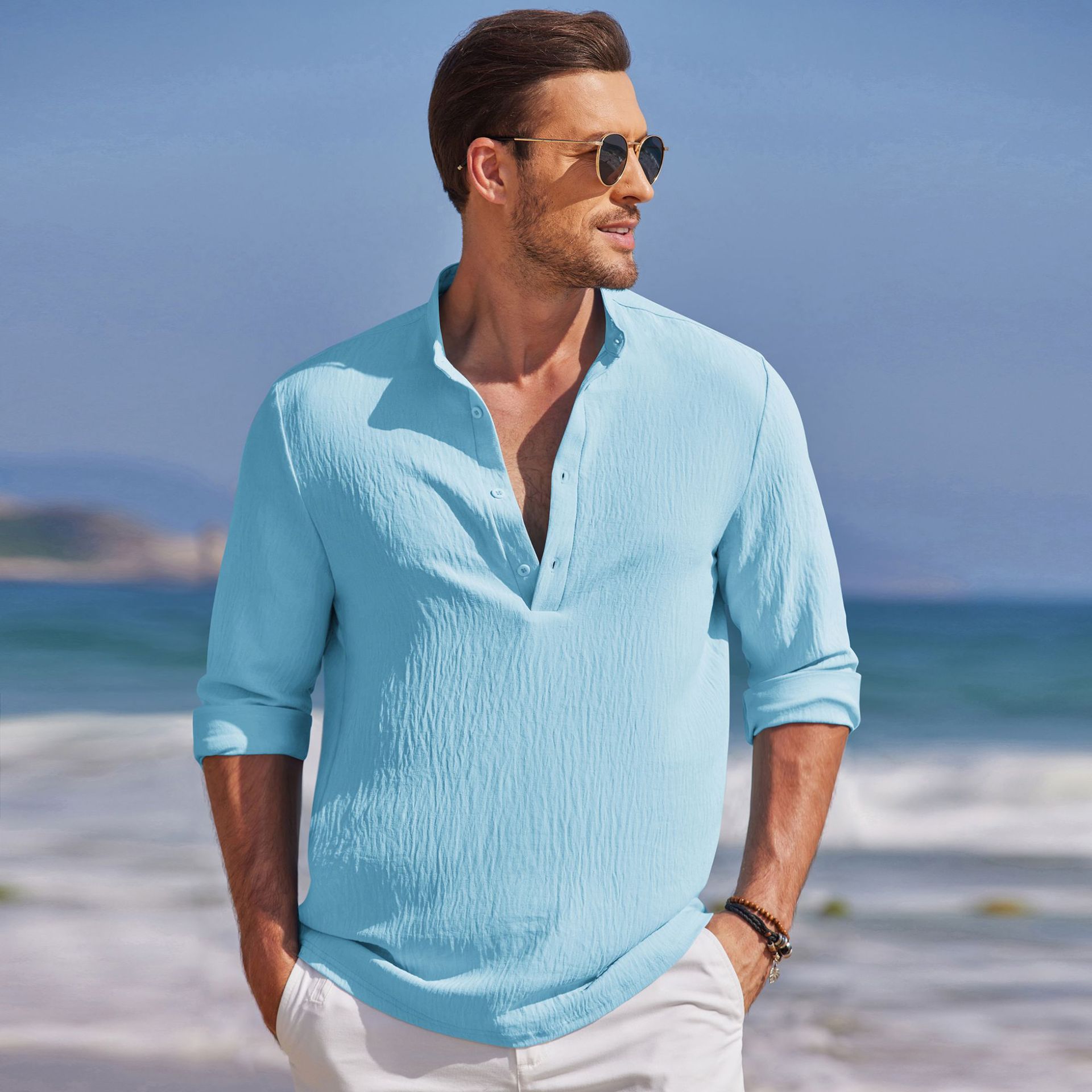 跨境亚马逊新款男式衬衫春秋高弹皱翻领长袖纯色商务衬衫上衣男装