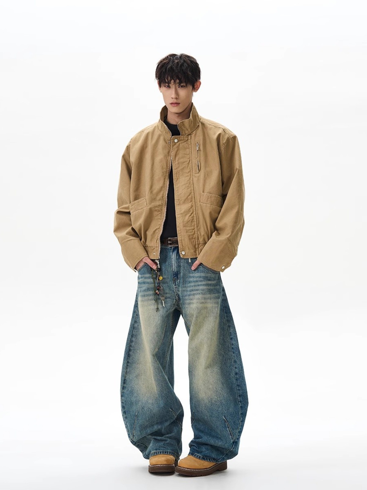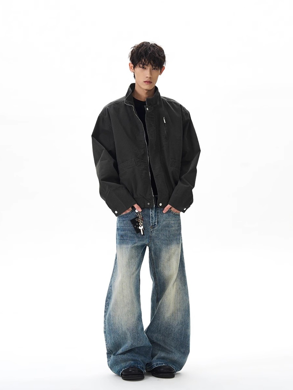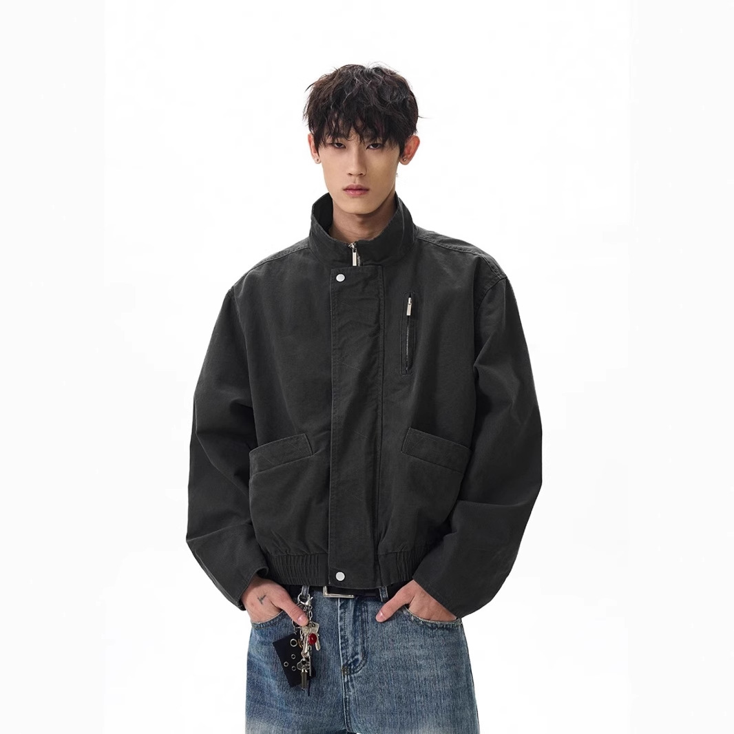 美式复古水洗做旧帆布立领飞行员夹克男女同款boxy巴恩风工装外套