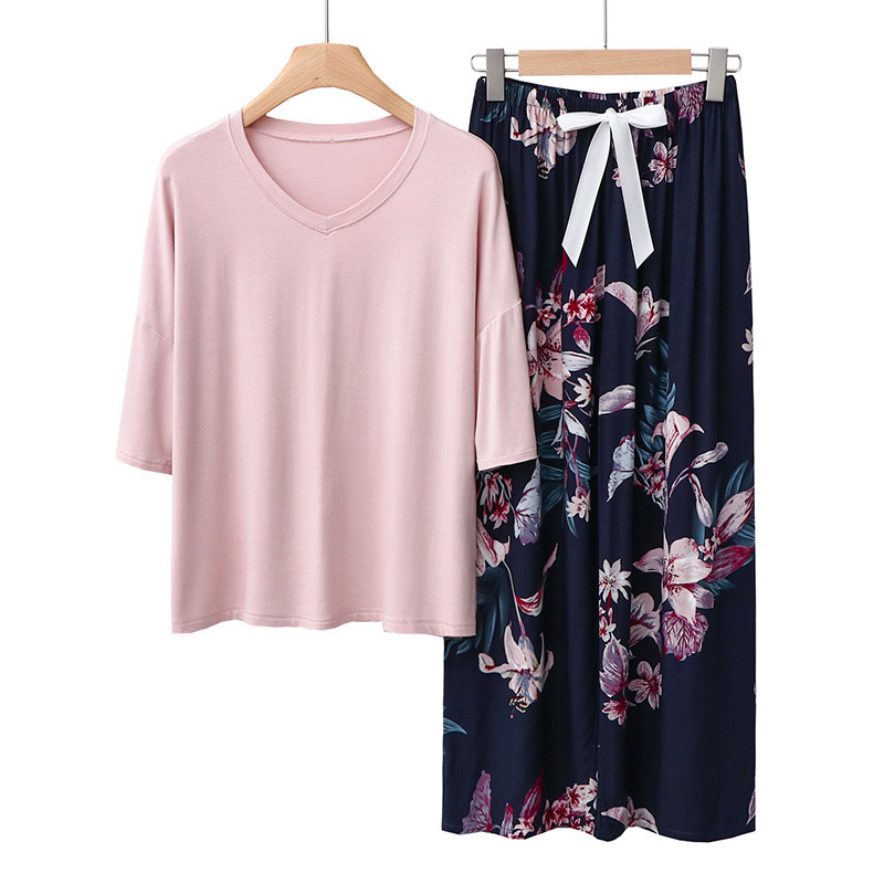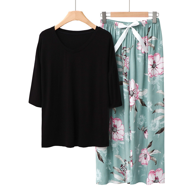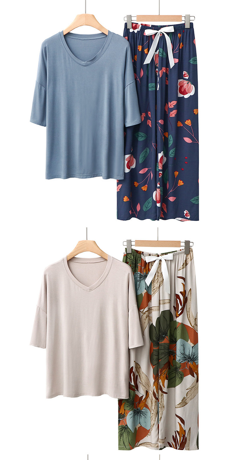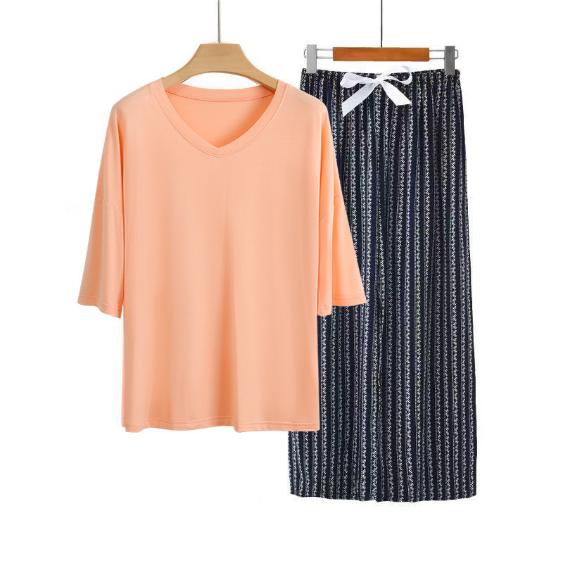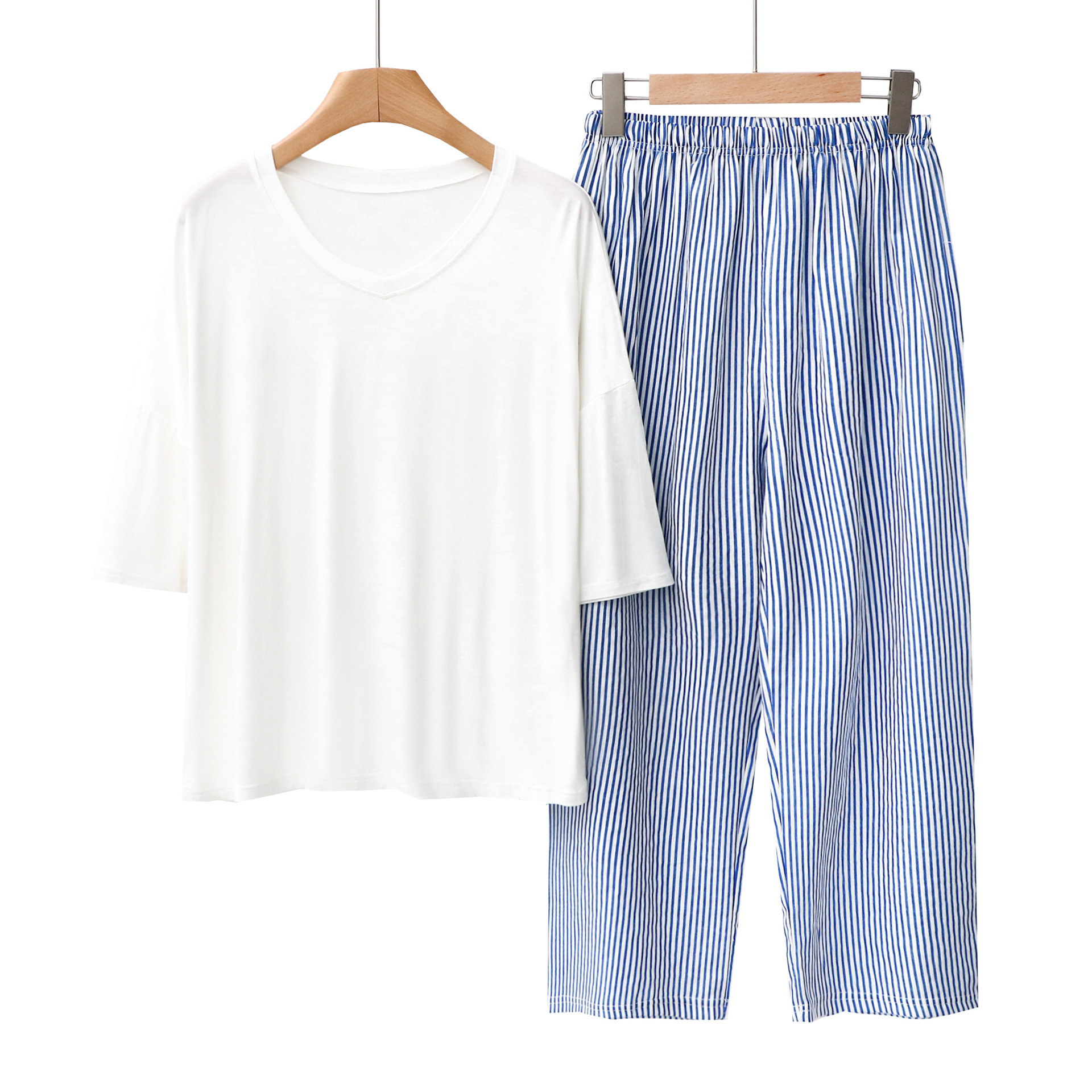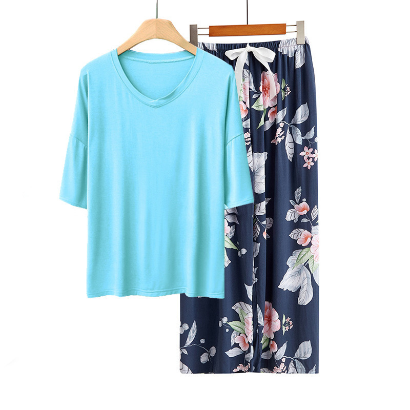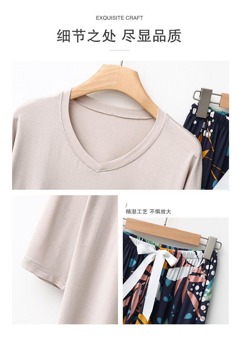 春夏舒适棉绸撞色女睡衣七分袖多色8分裤女士家居服批发简约休闲