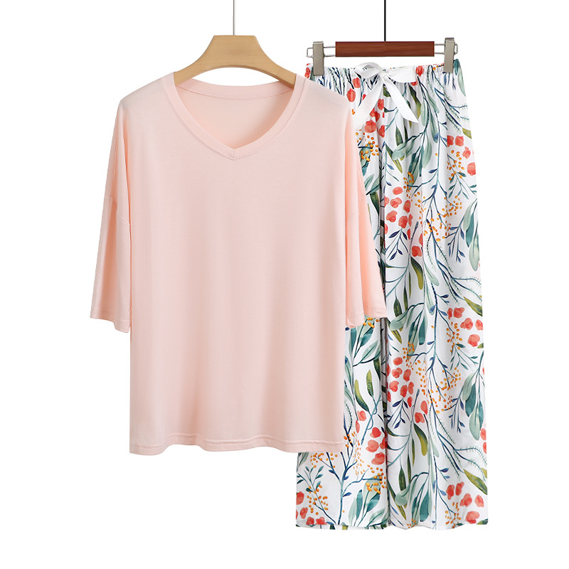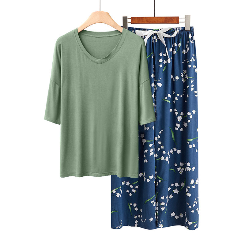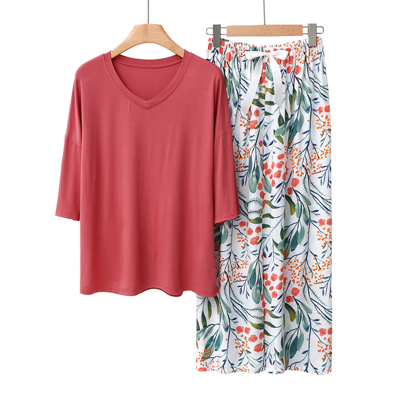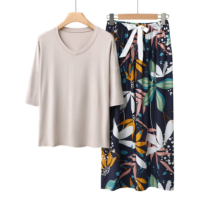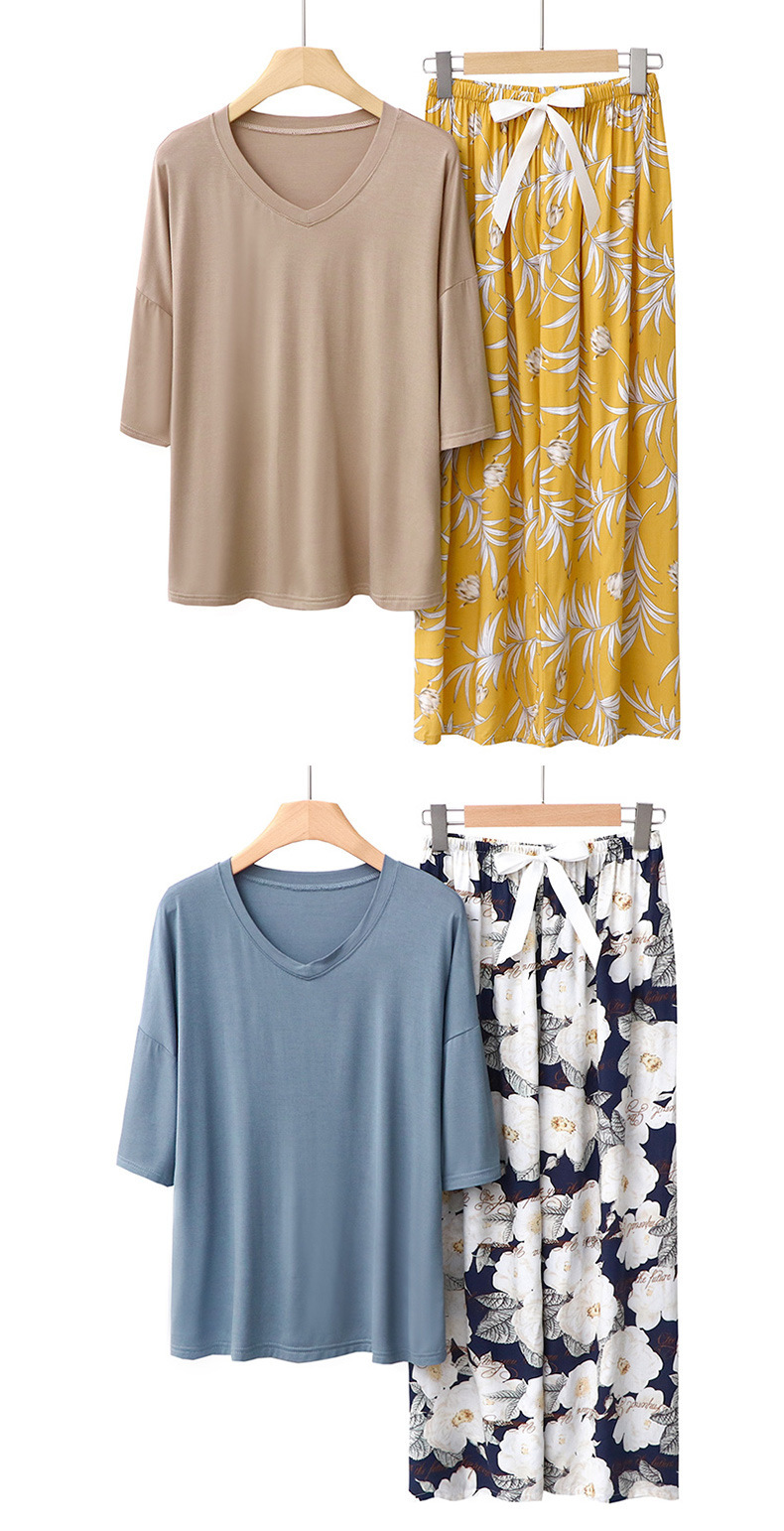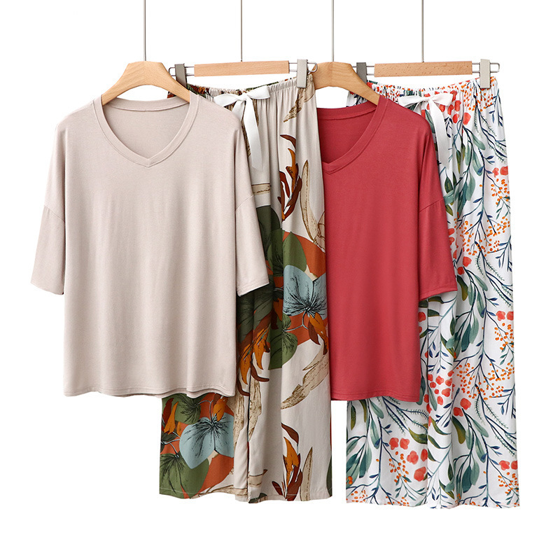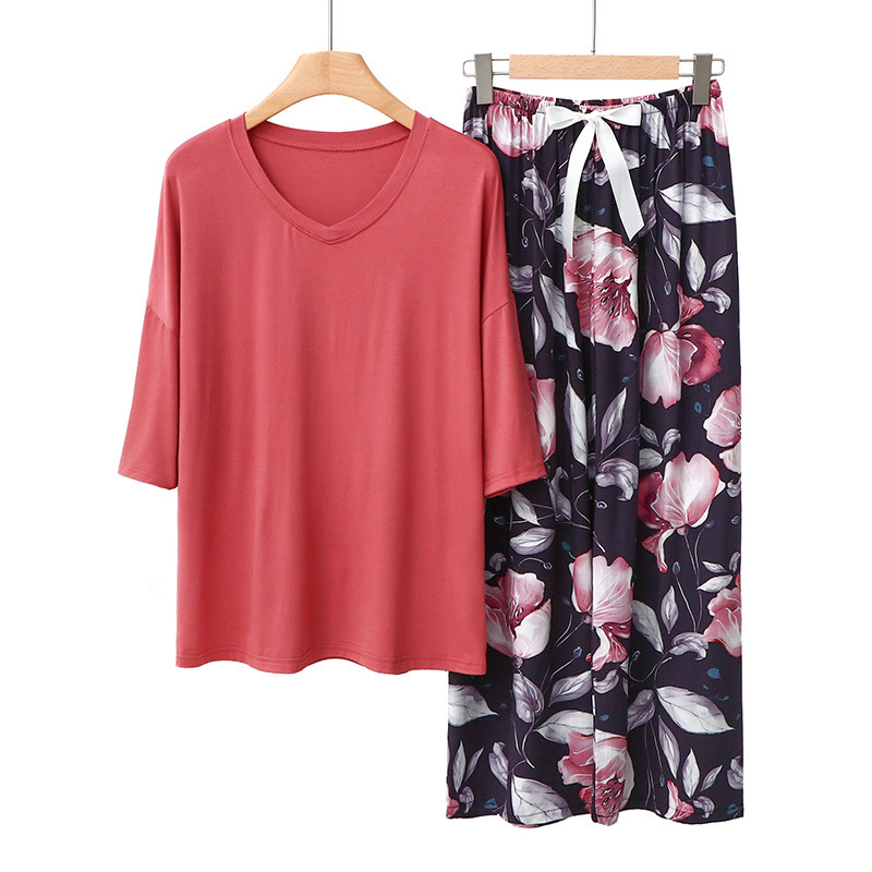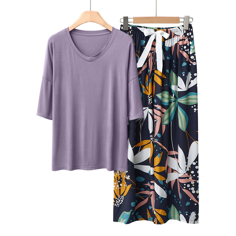 春夏舒适棉绸撞色女睡衣七分袖多色8分裤女士家居服批发简约休闲