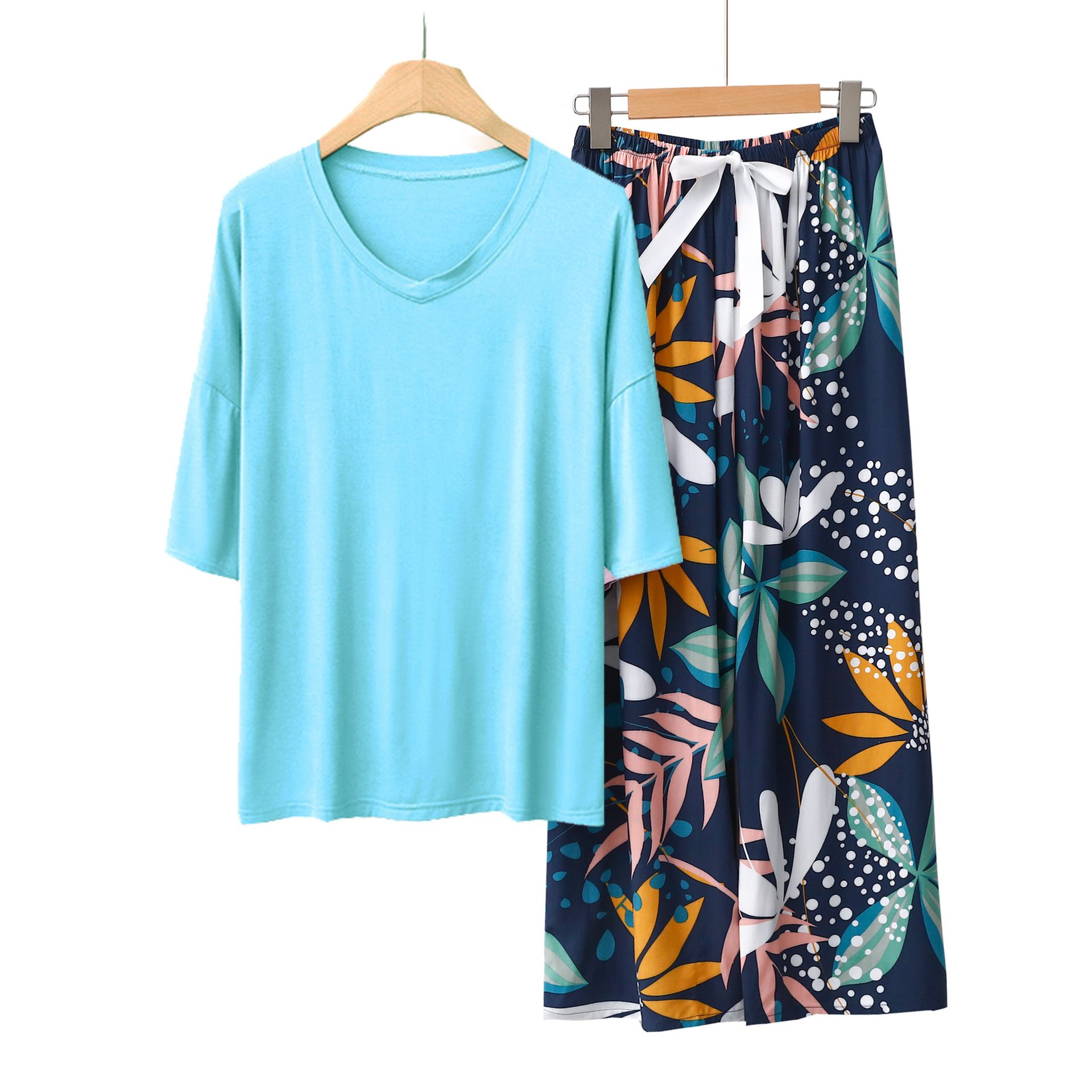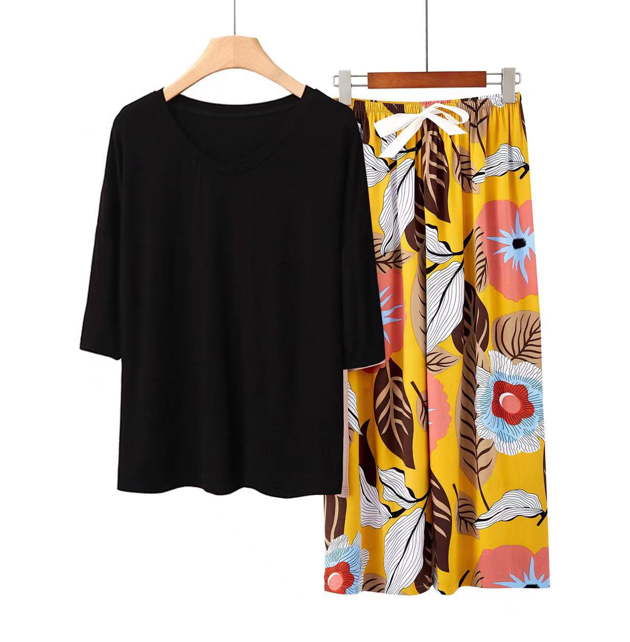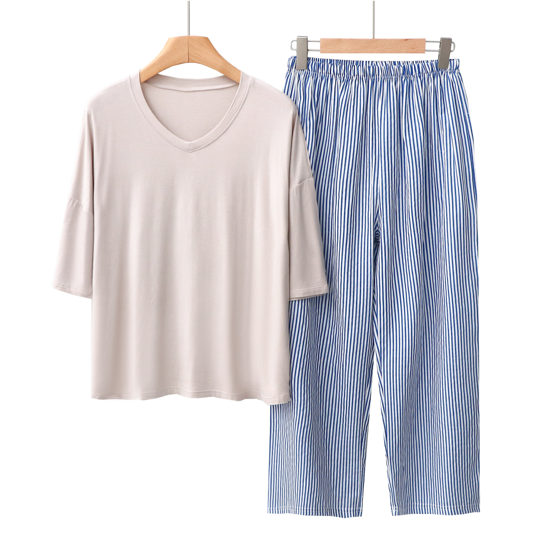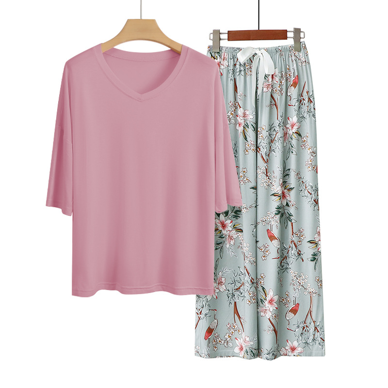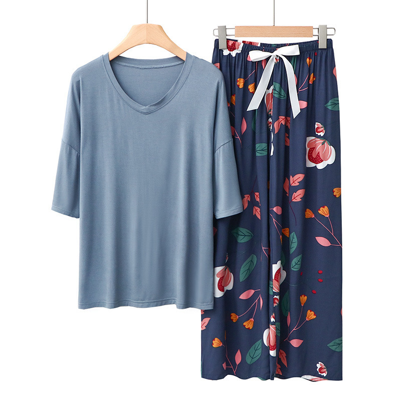 春夏舒适棉绸撞色女睡衣七分袖多色8分裤女士家居服批发简约休闲