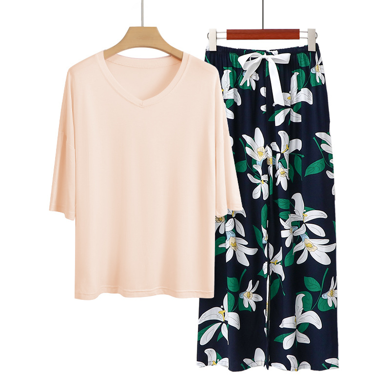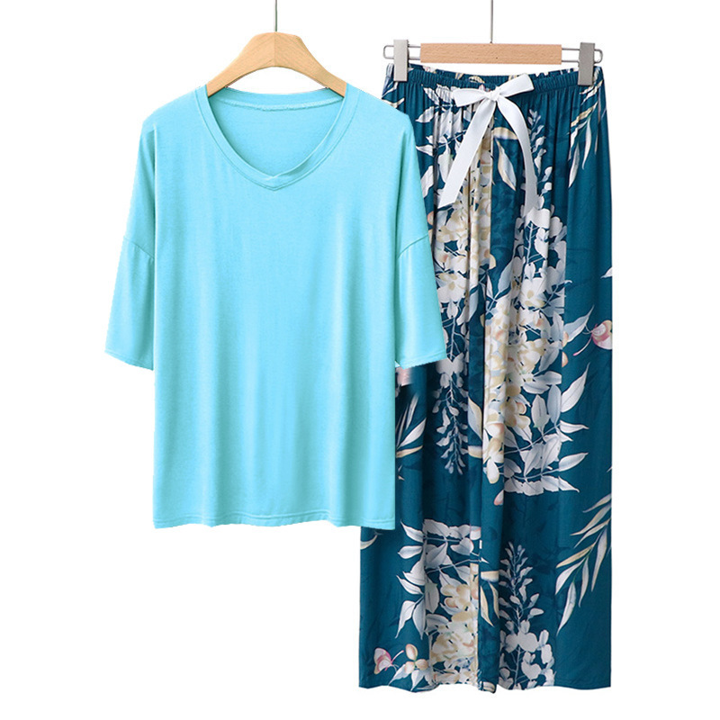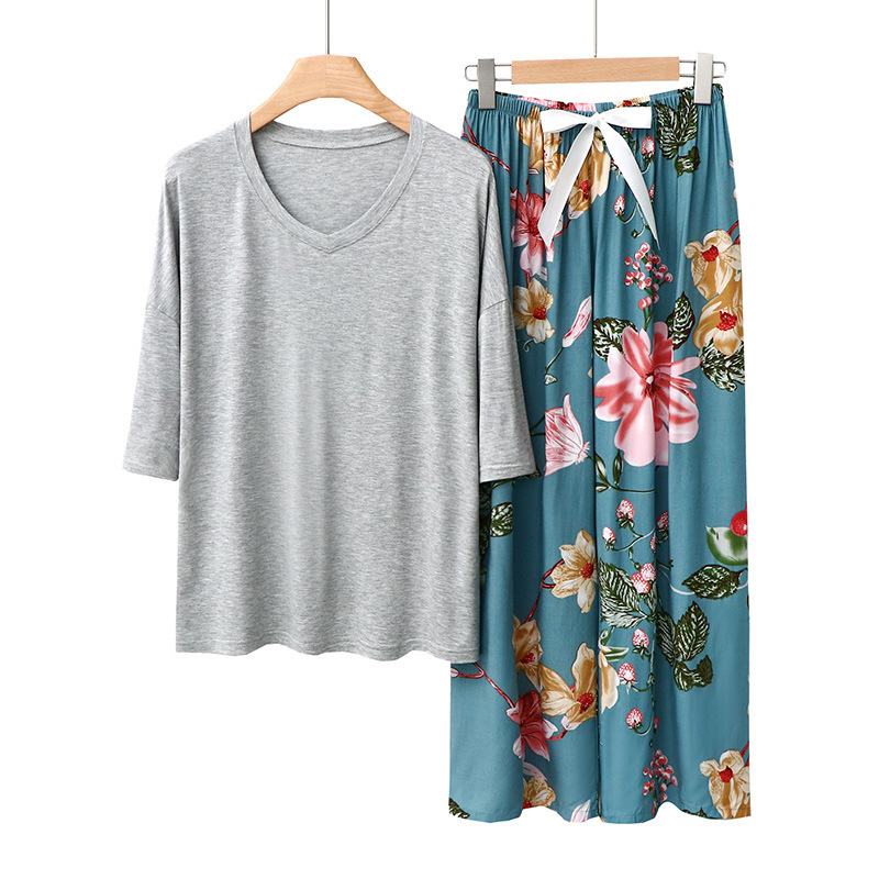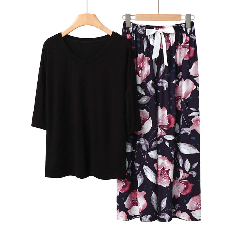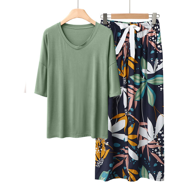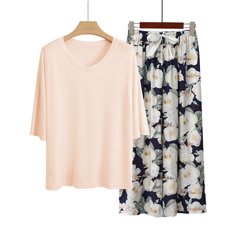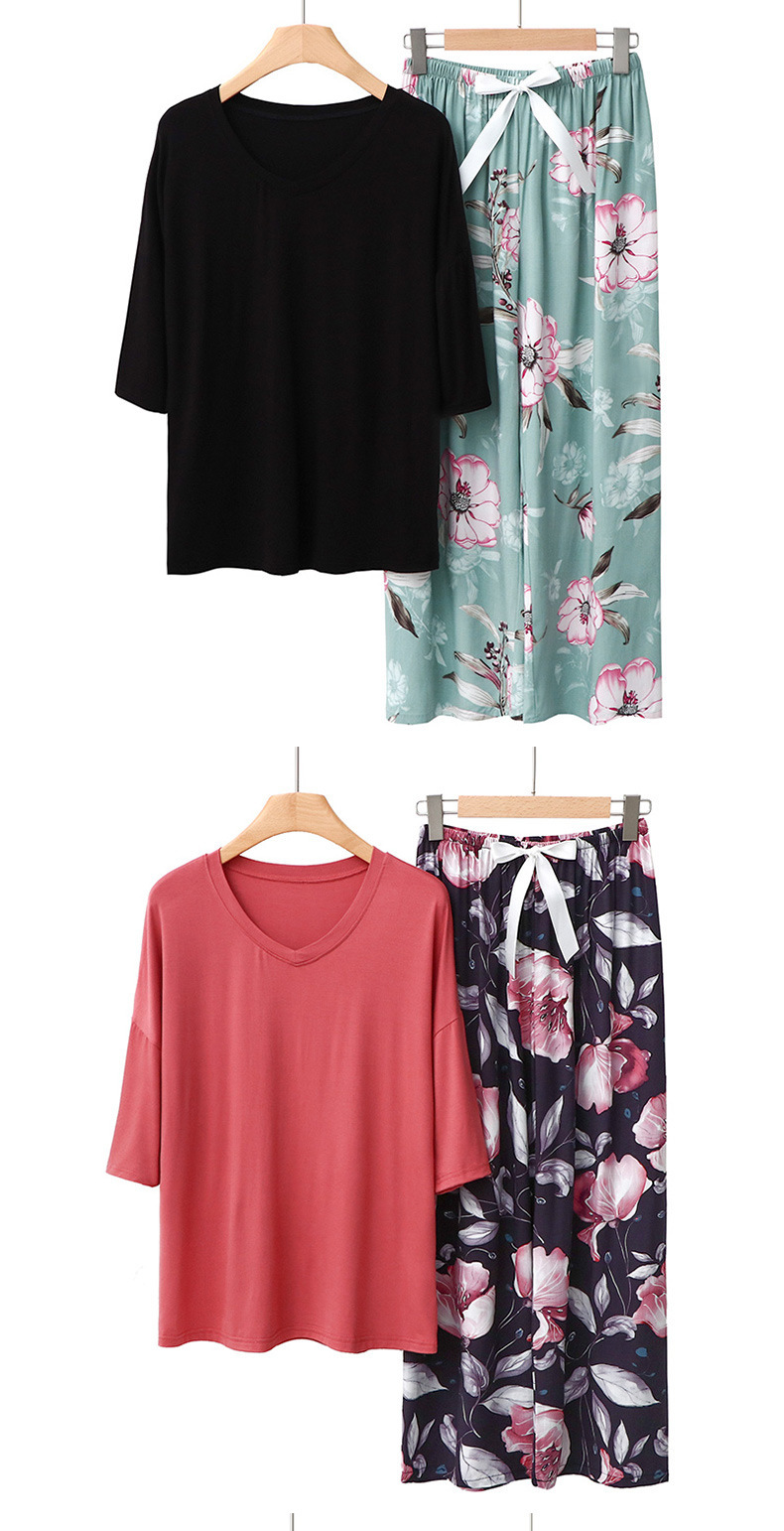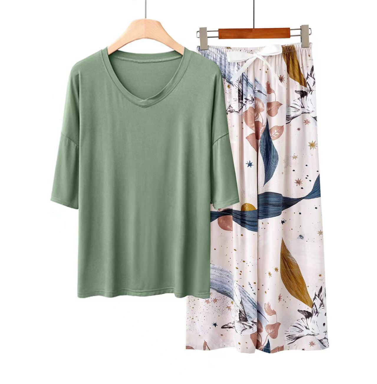 春夏舒适棉绸撞色女睡衣七分袖多色8分裤女士家居服批发简约休闲