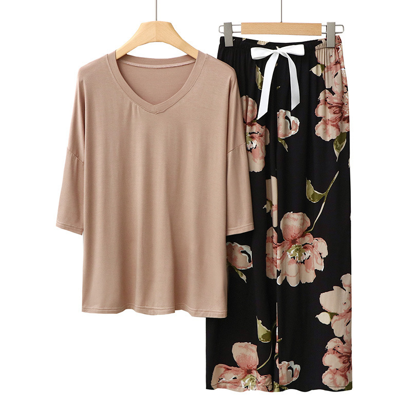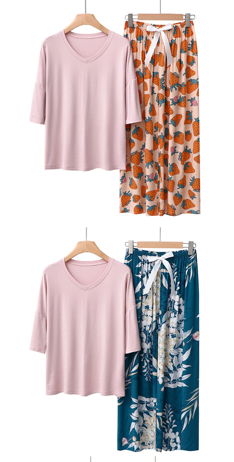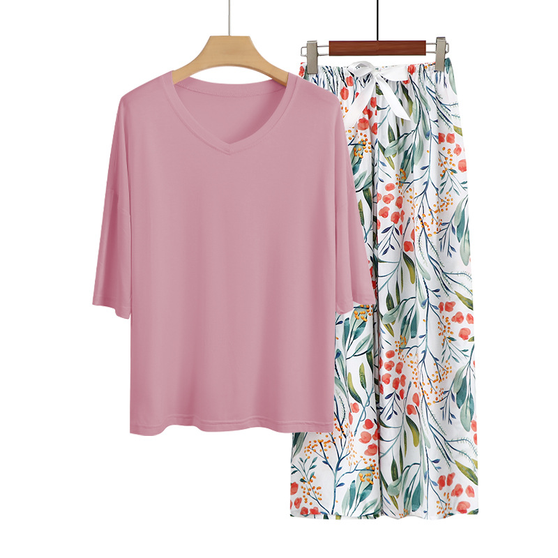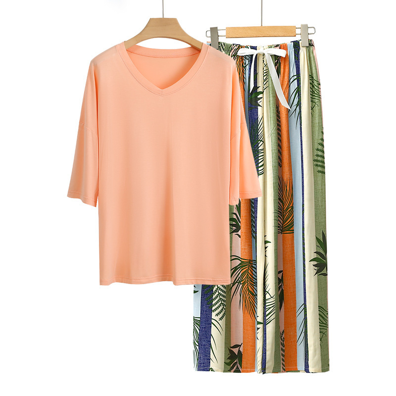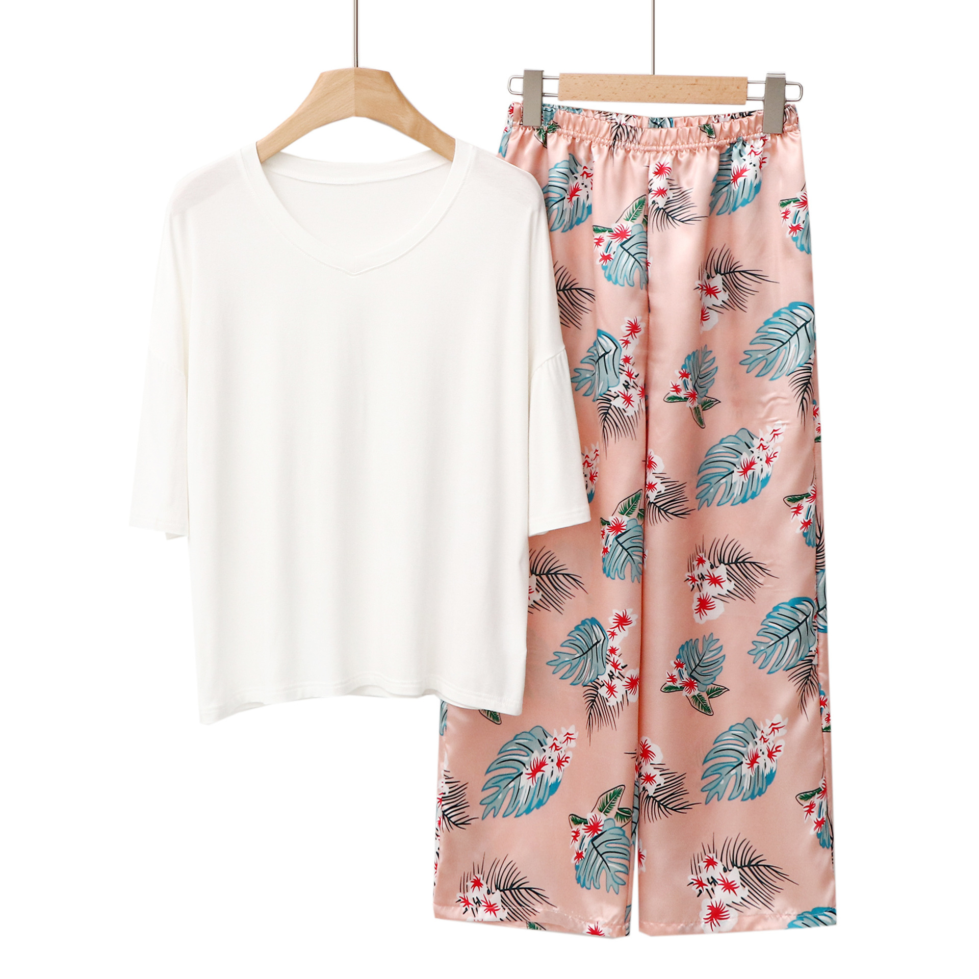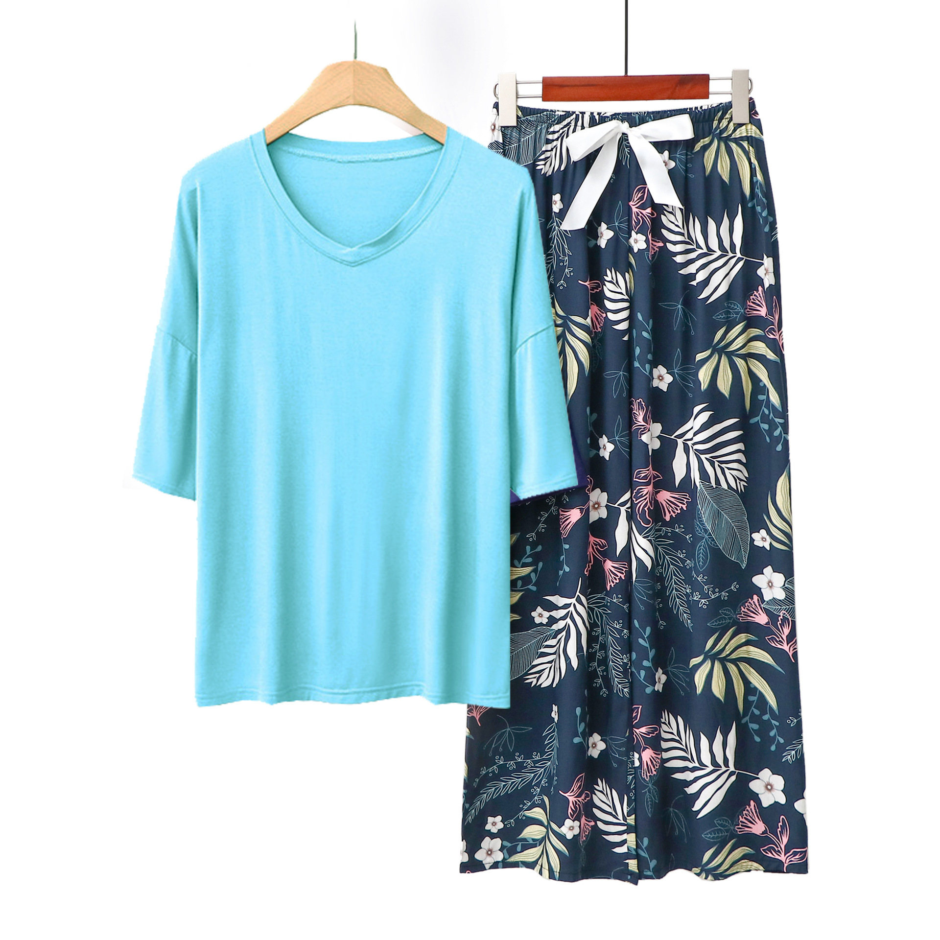 春夏舒适棉绸撞色女睡衣七分袖多色8分裤女士家居服批发简约休闲
