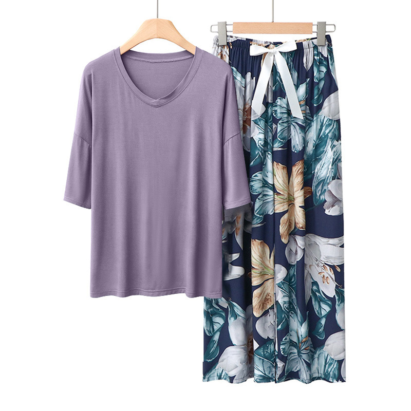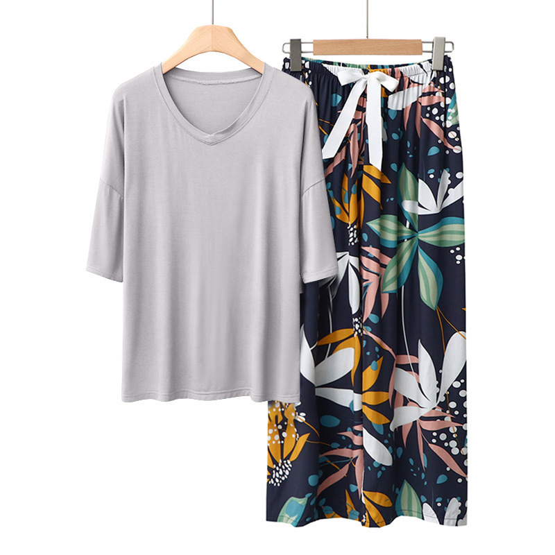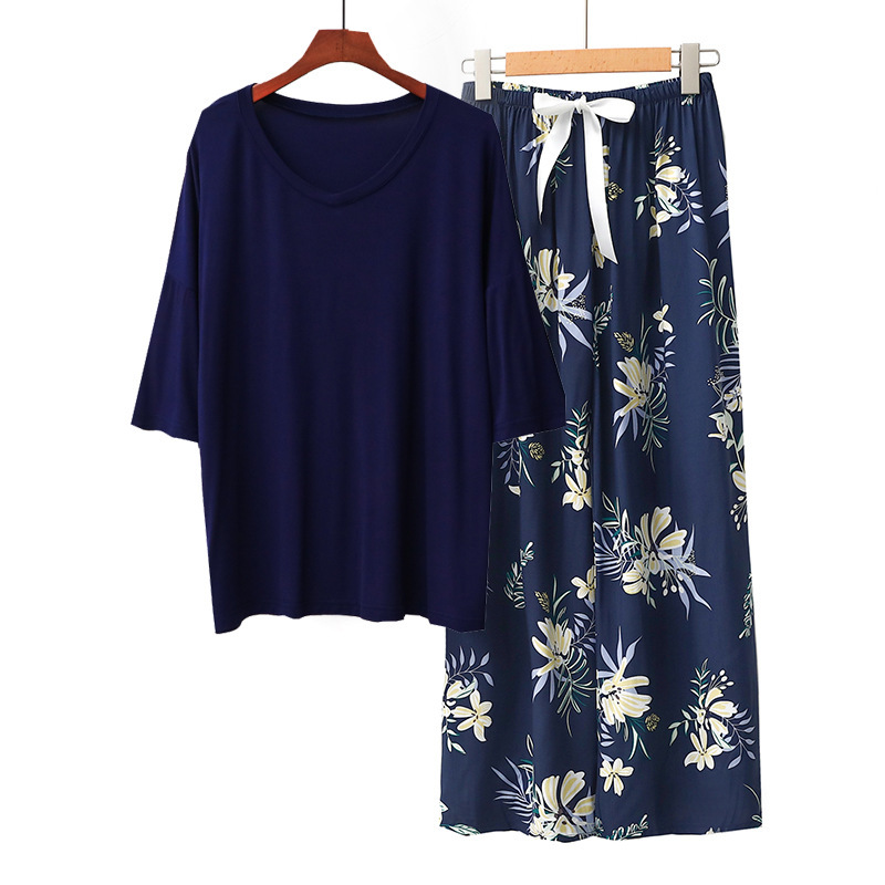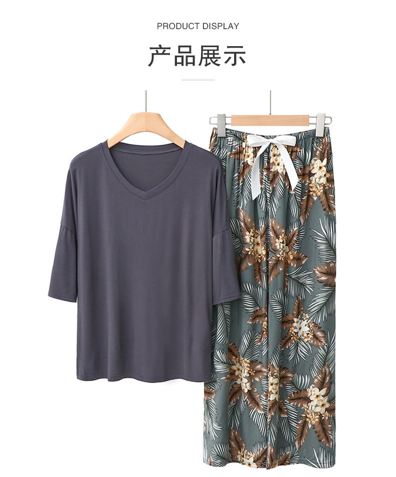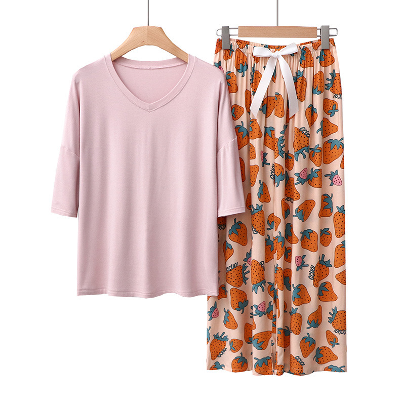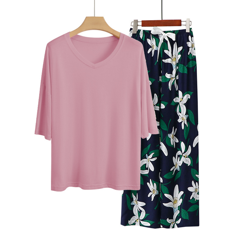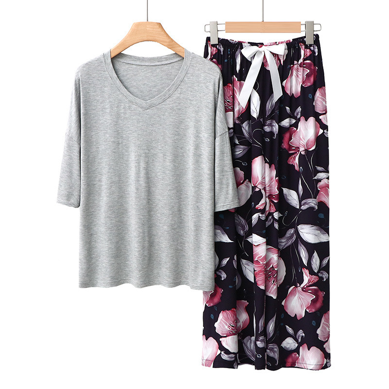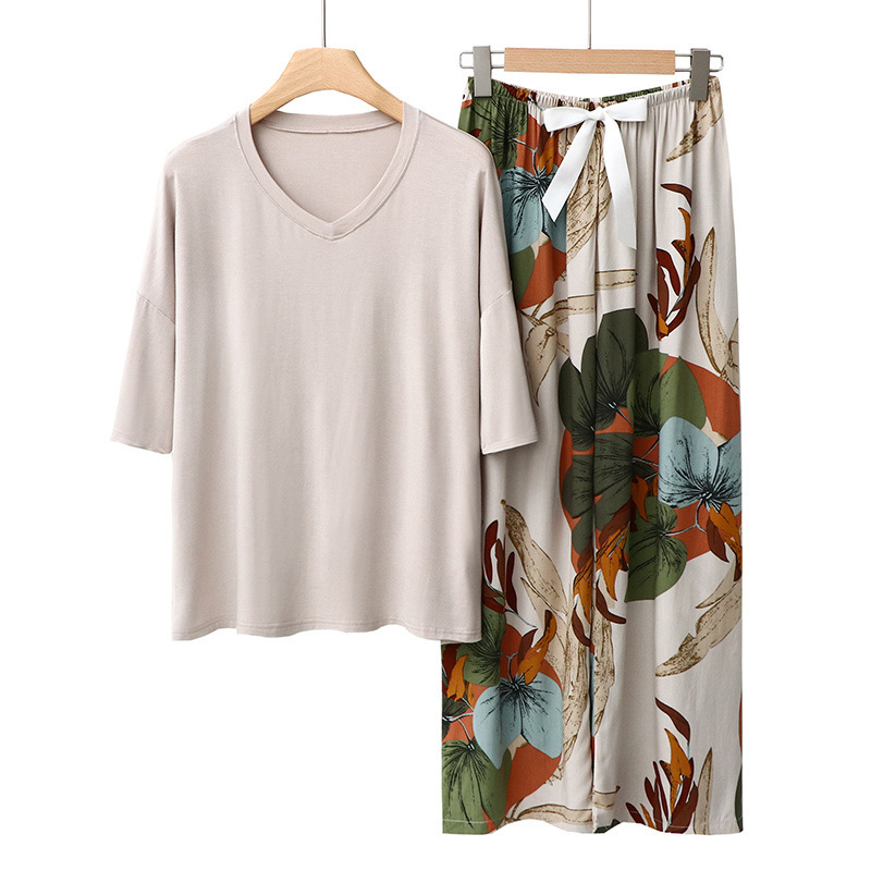 春夏舒适棉绸撞色女睡衣七分袖多色8分裤女士家居服批发简约休闲