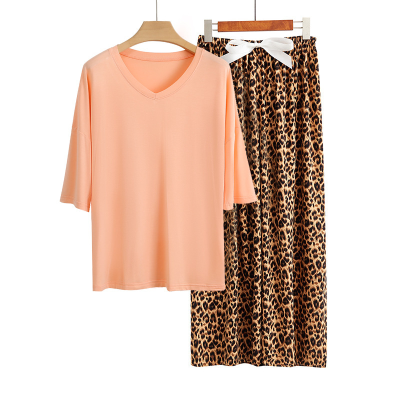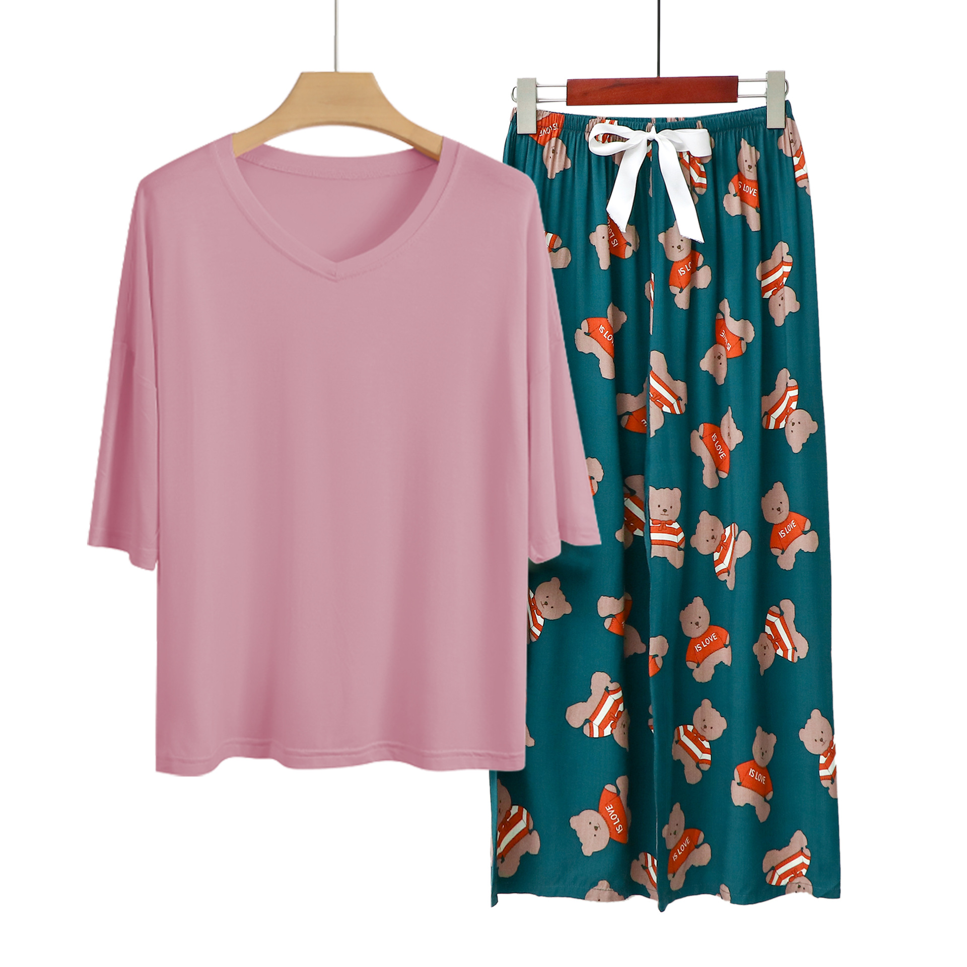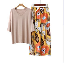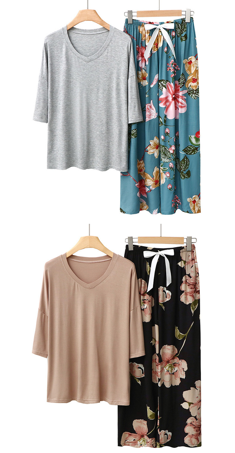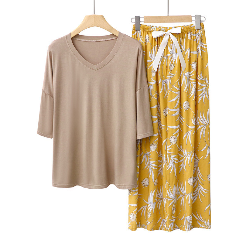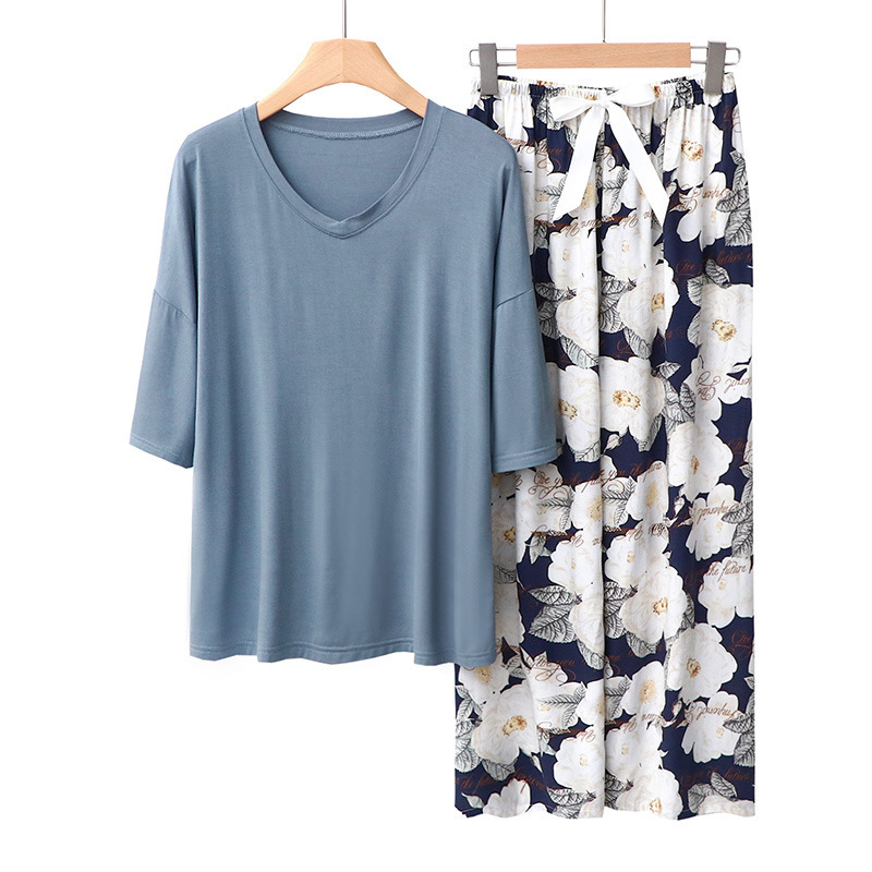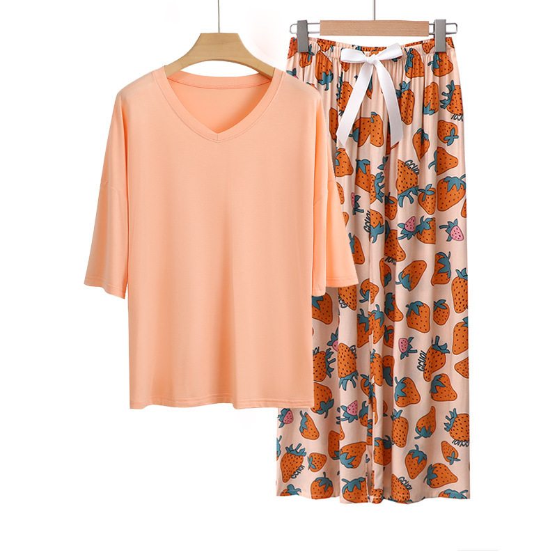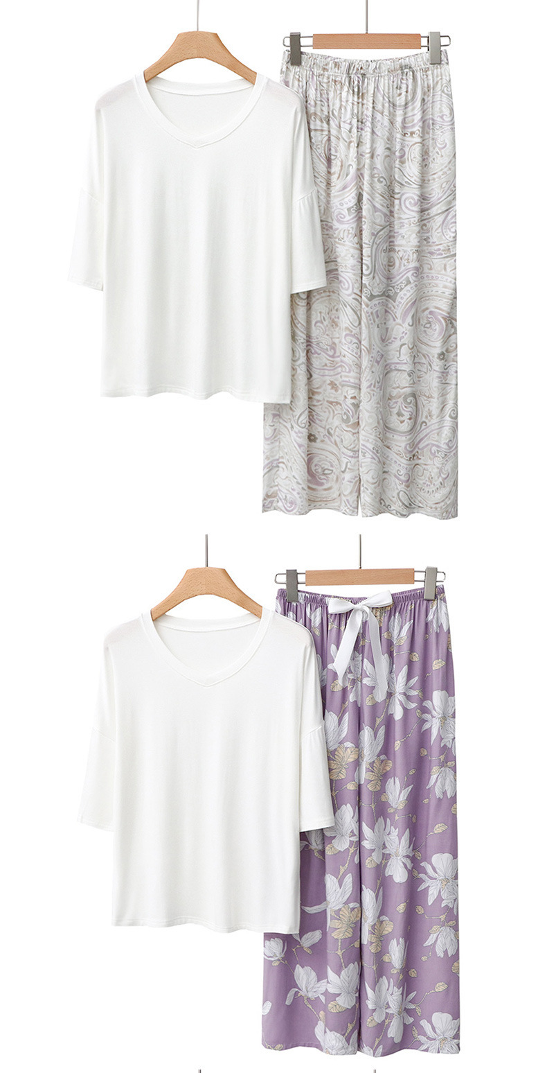春夏舒适棉绸撞色女睡衣七分袖多色8分裤女士家居服批发简约休闲