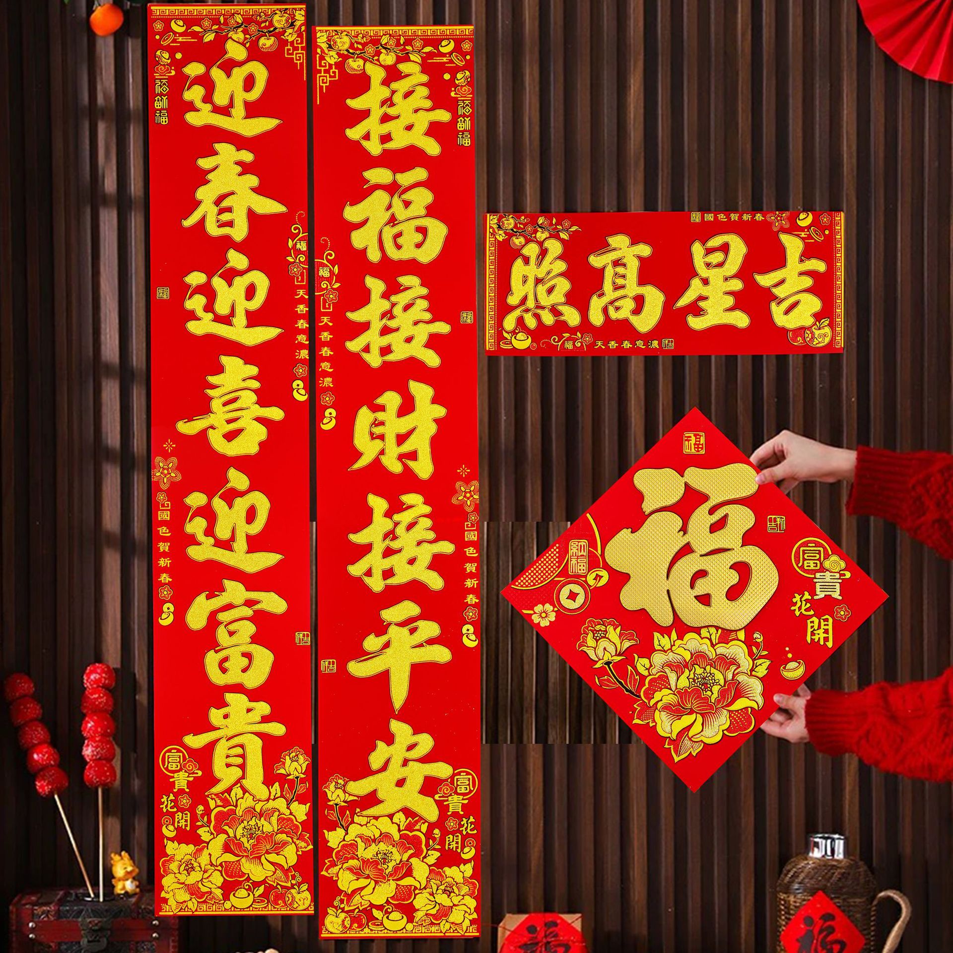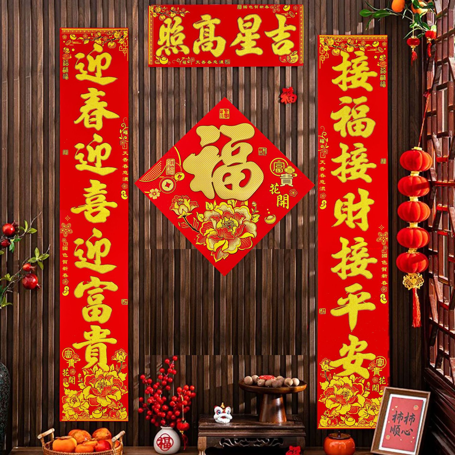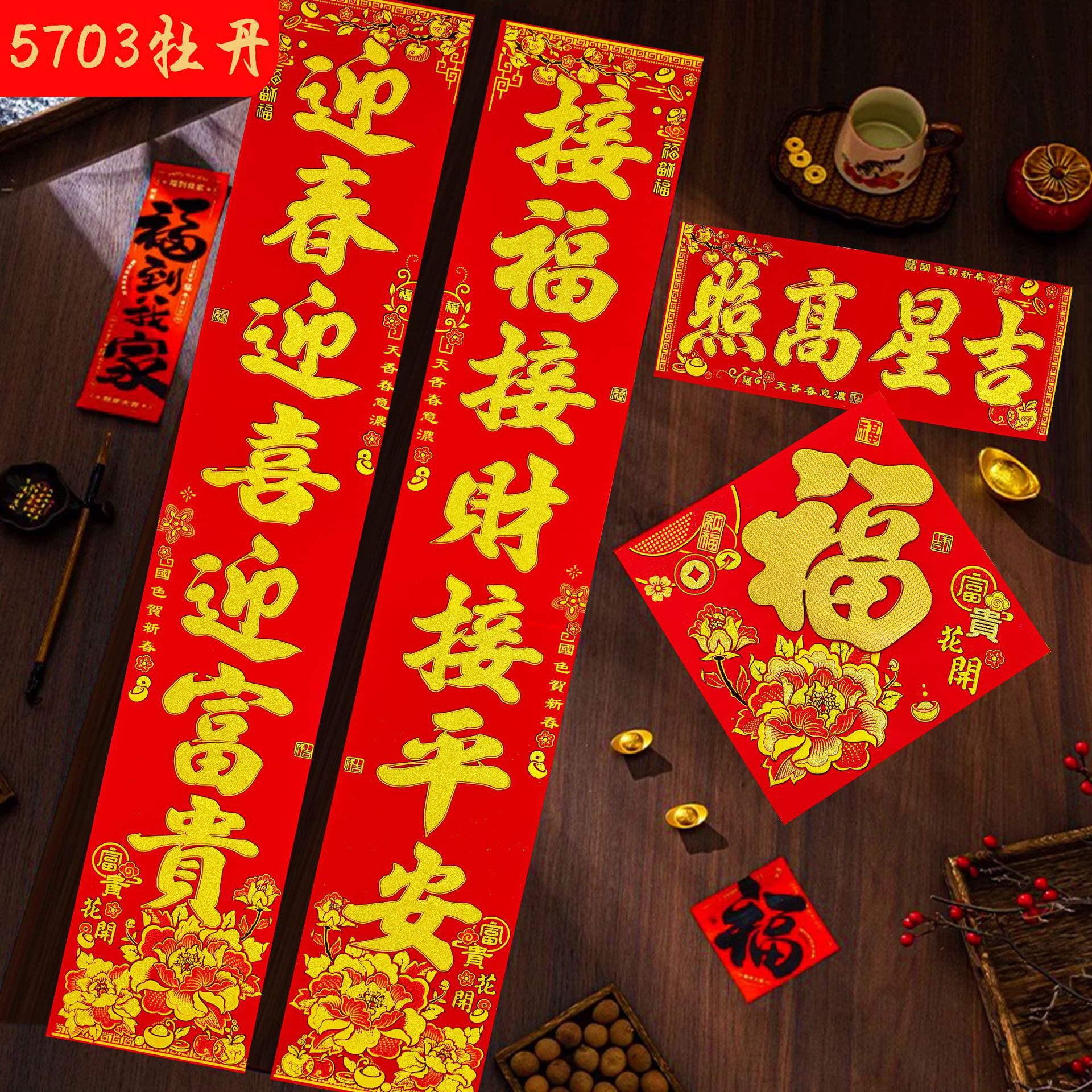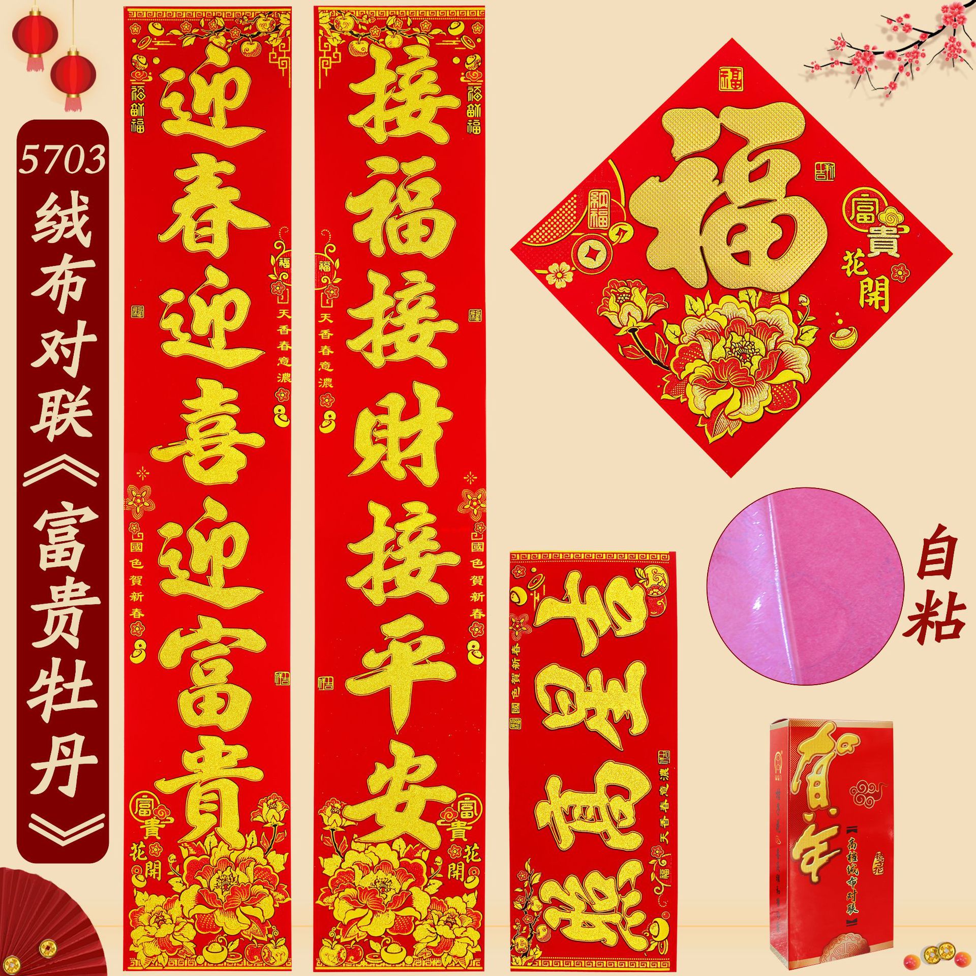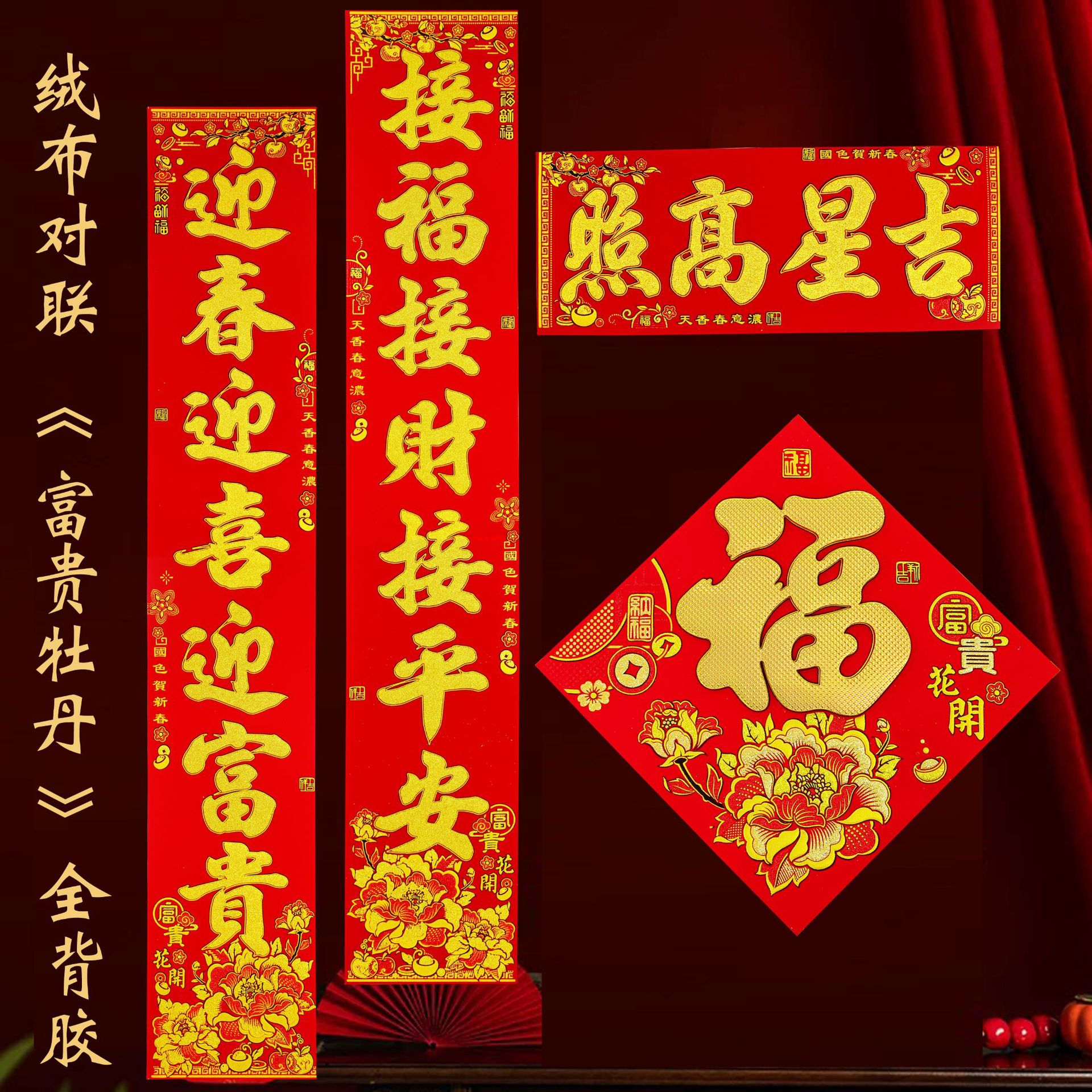 春节对联批发绒布春联2025年带背胶烫金字牡丹花开富贵春联大门