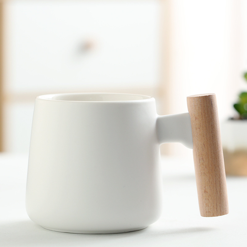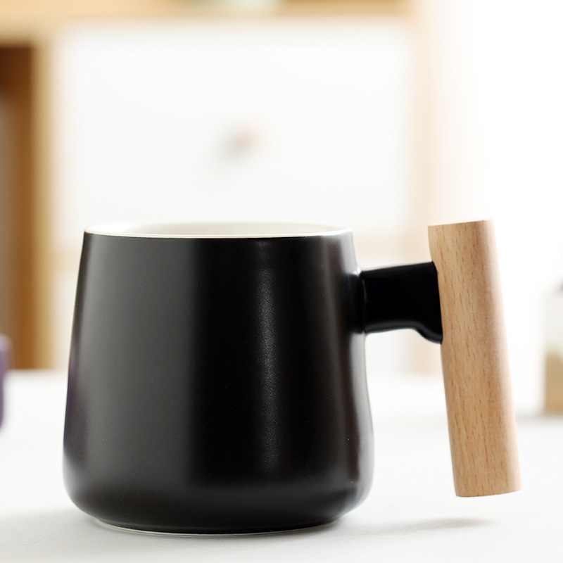 简约风陶瓷杯家用办公室木柄马克杯带盖个人水杯批发可定 制logo