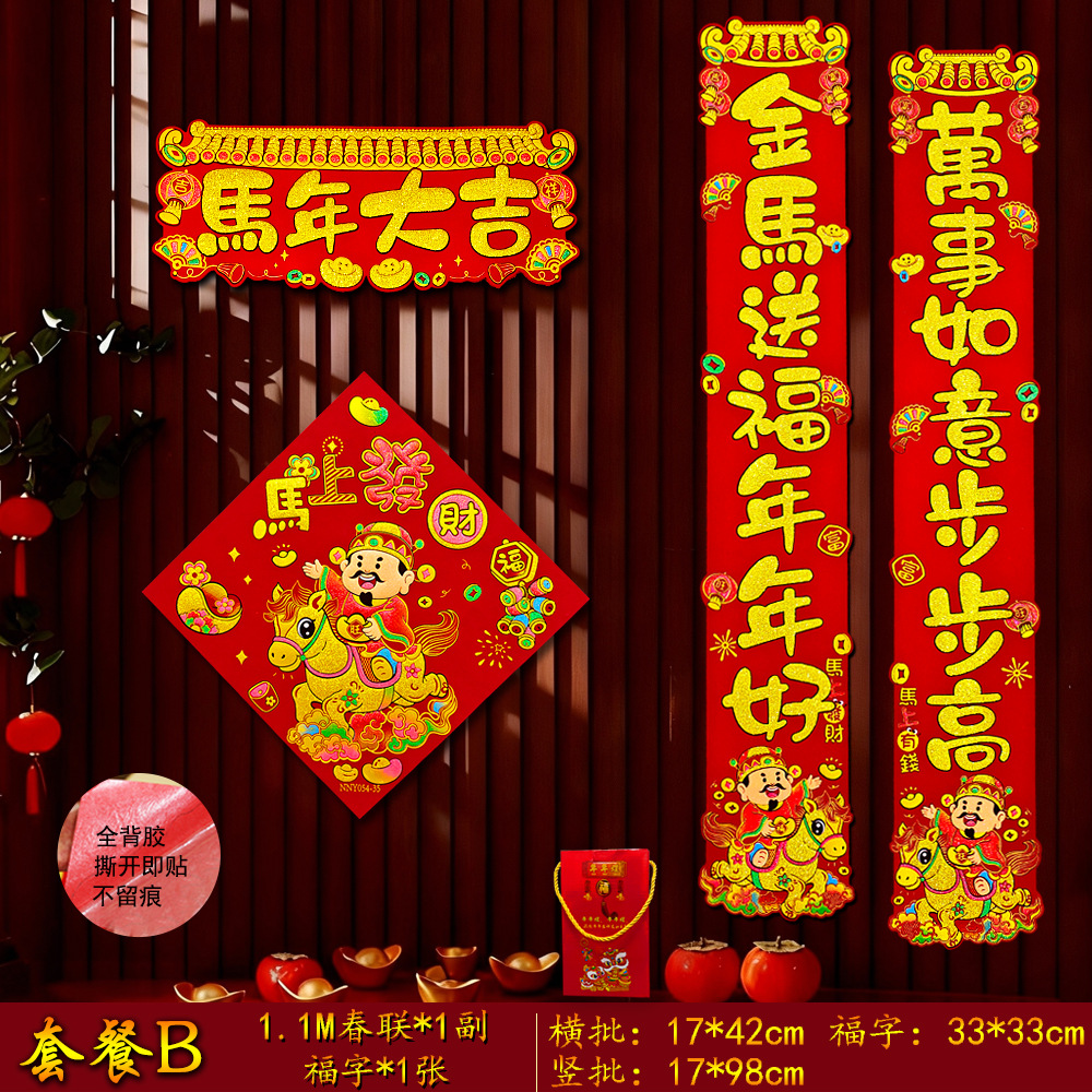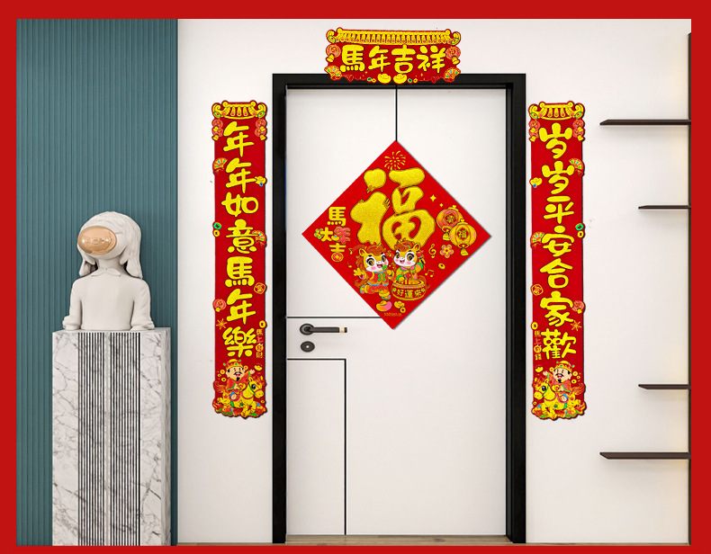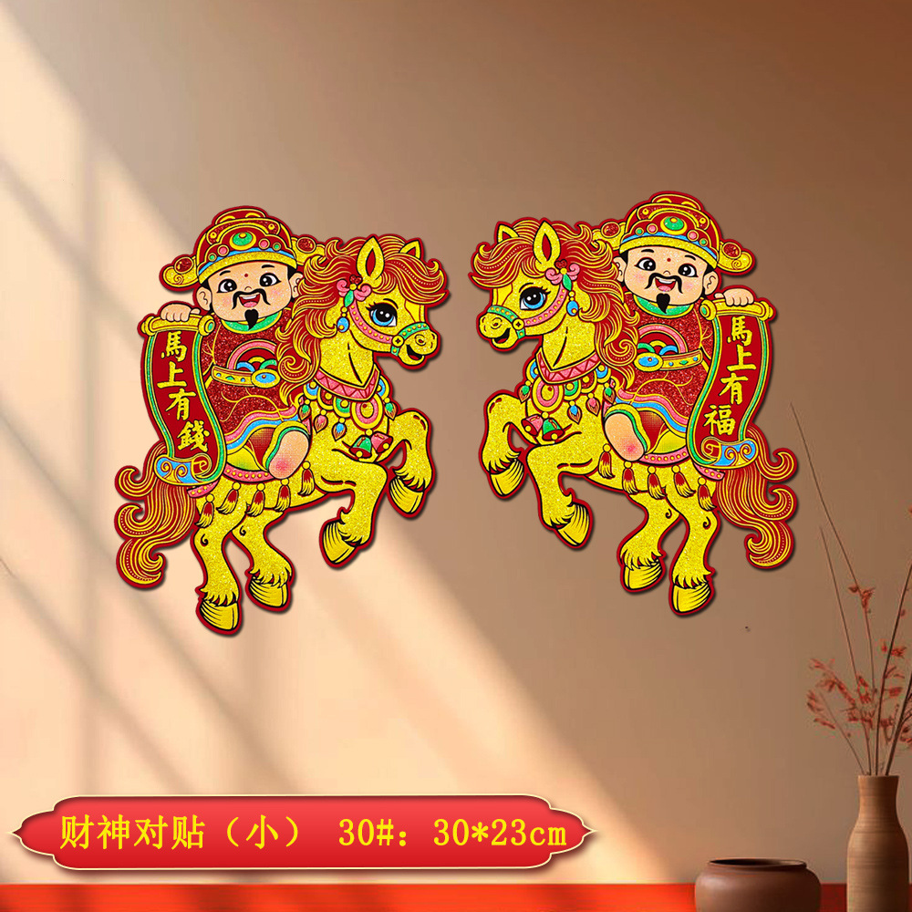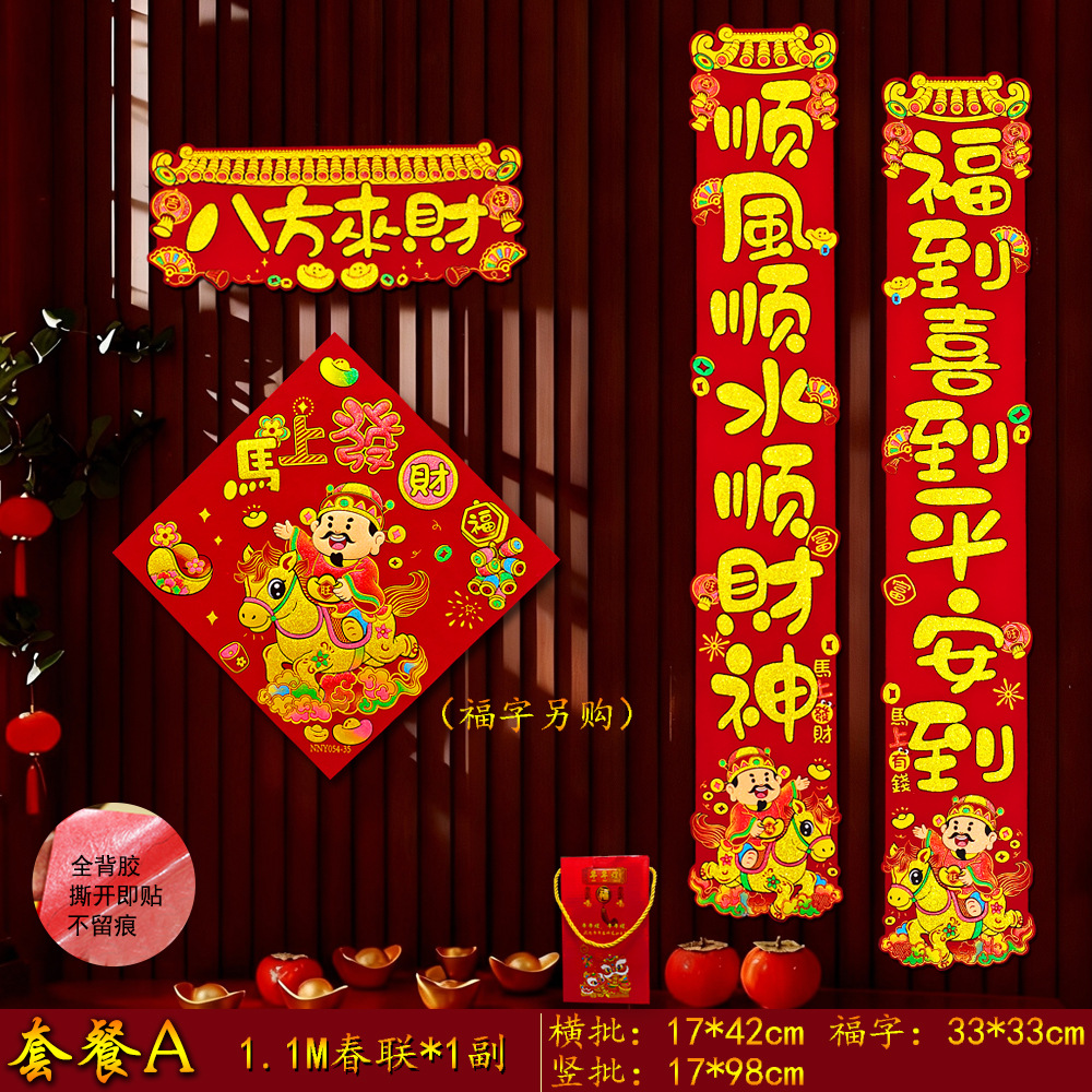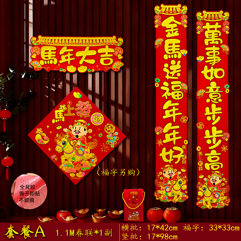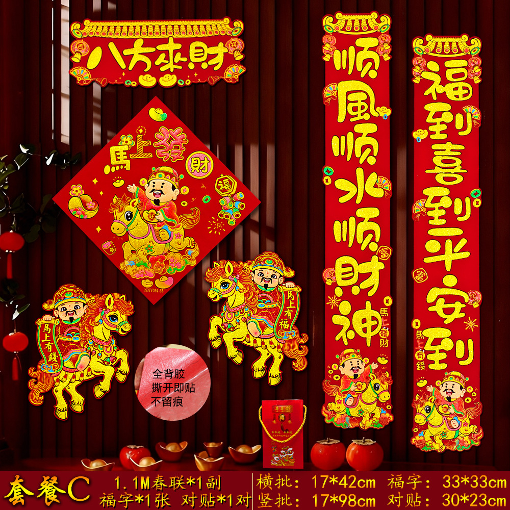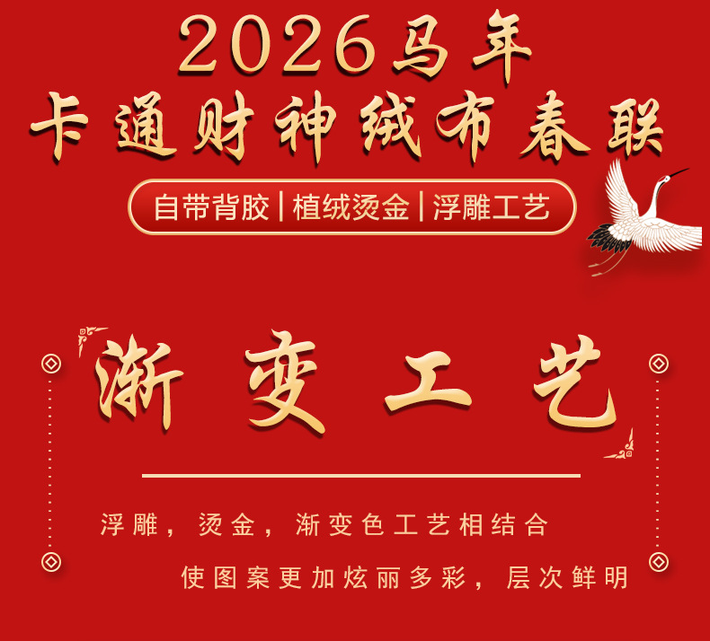 2026马年新款新年对联装饰创意卡通财神绒布自粘春联春节用品礼盒