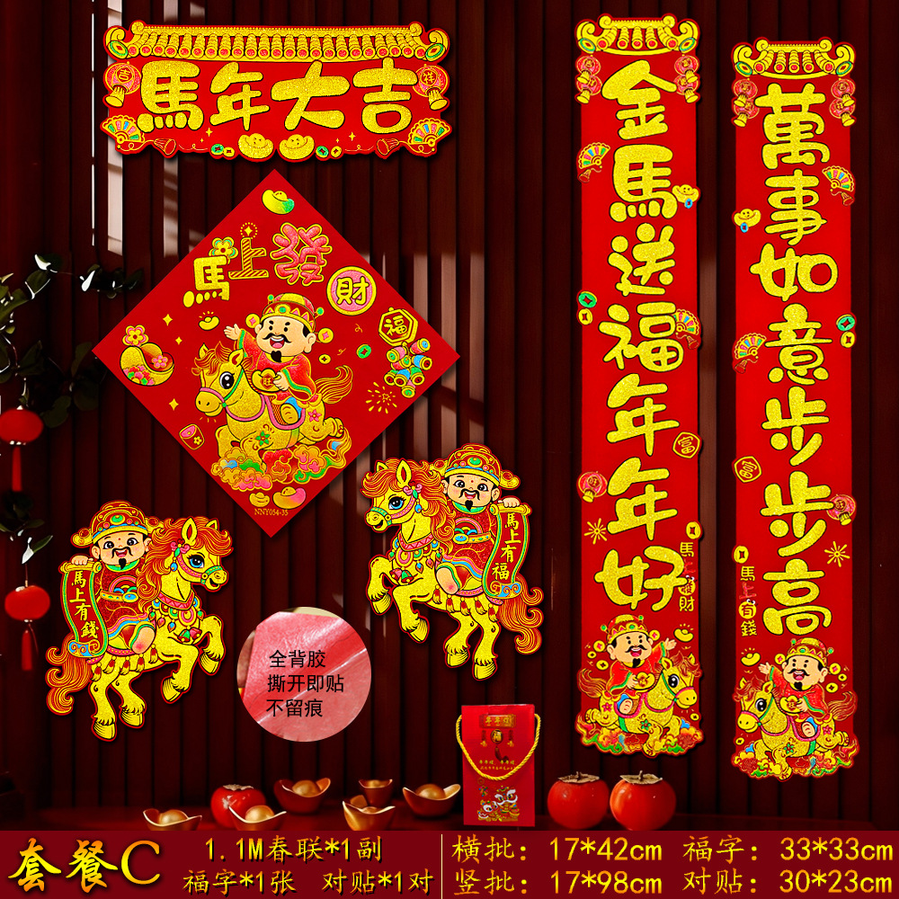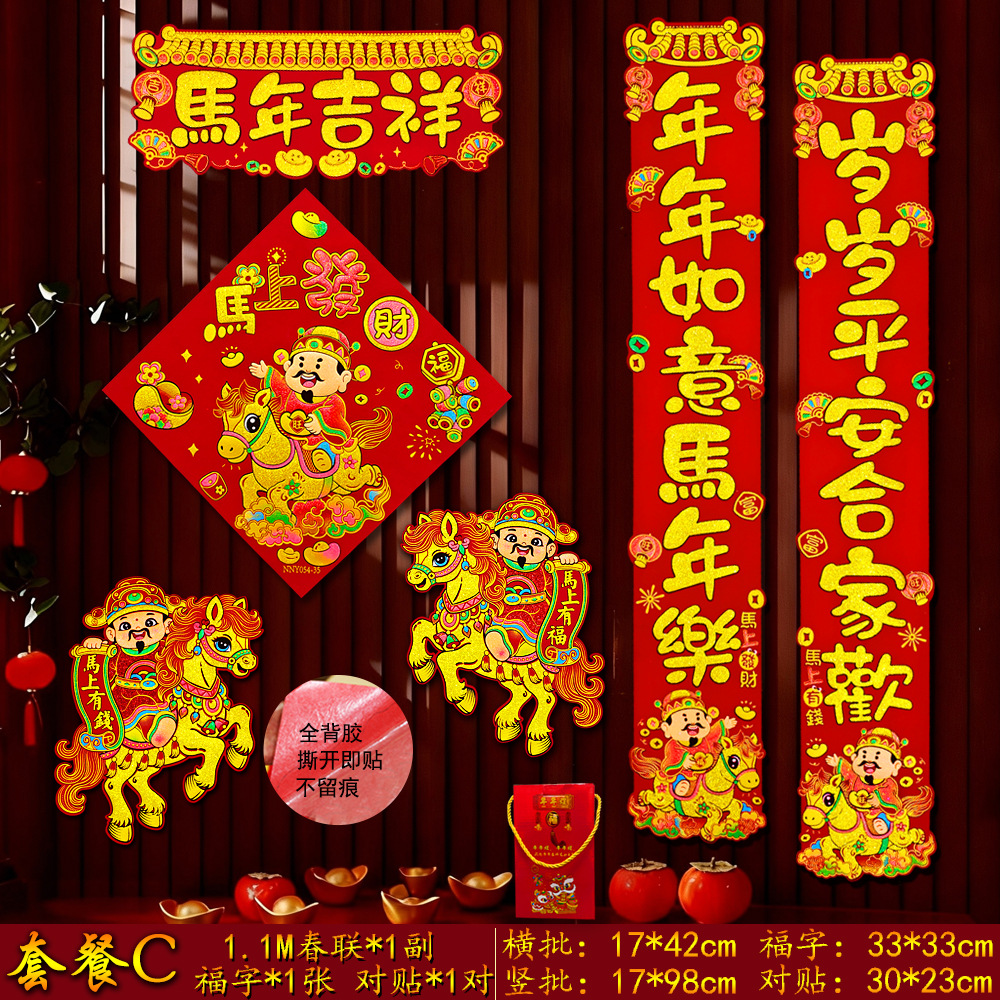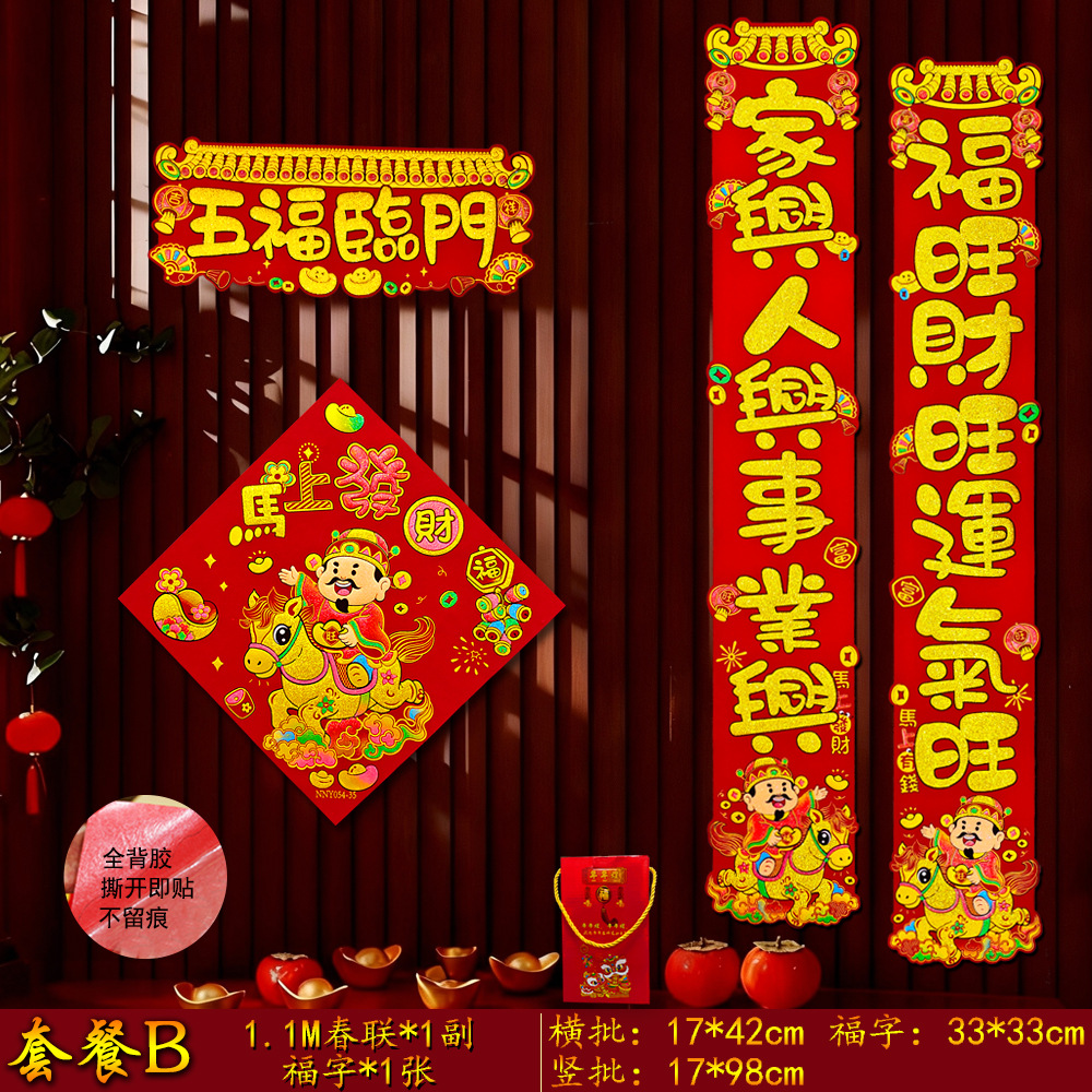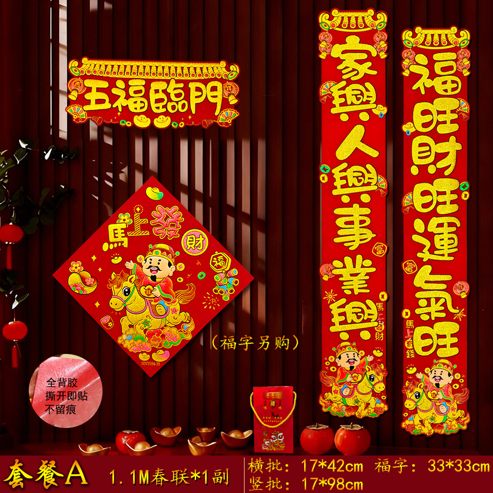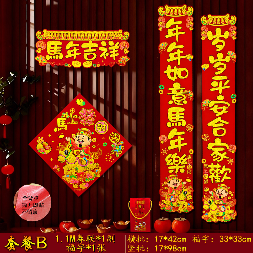 2026马年新款新年对联装饰创意卡通财神绒布自粘春联春节用品礼盒