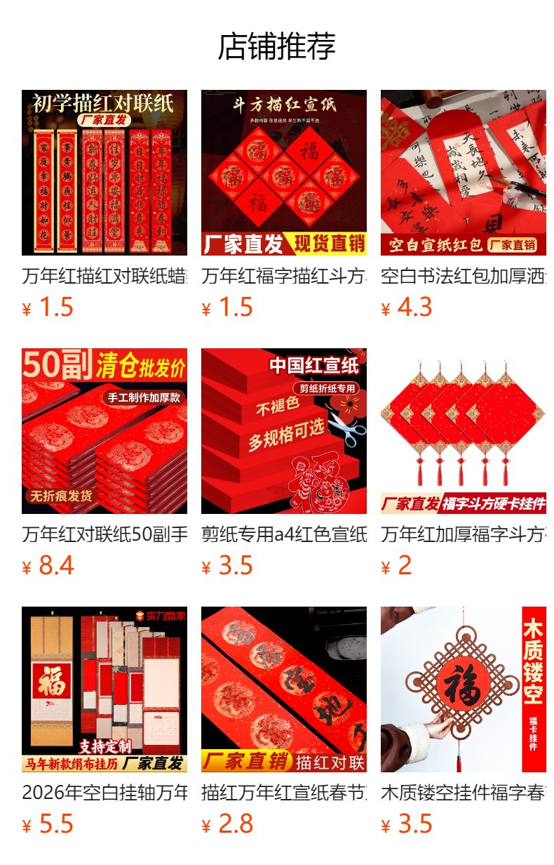 | 万年红加厚对联纸 | USD $3.04 | 9999 bag available |