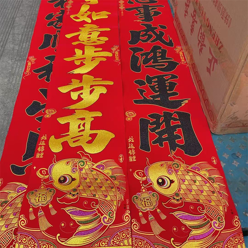 鸿年旺绒布对联全背胶自粘撒金粉黑粉发泡盒装鱼款春联春节带背胶