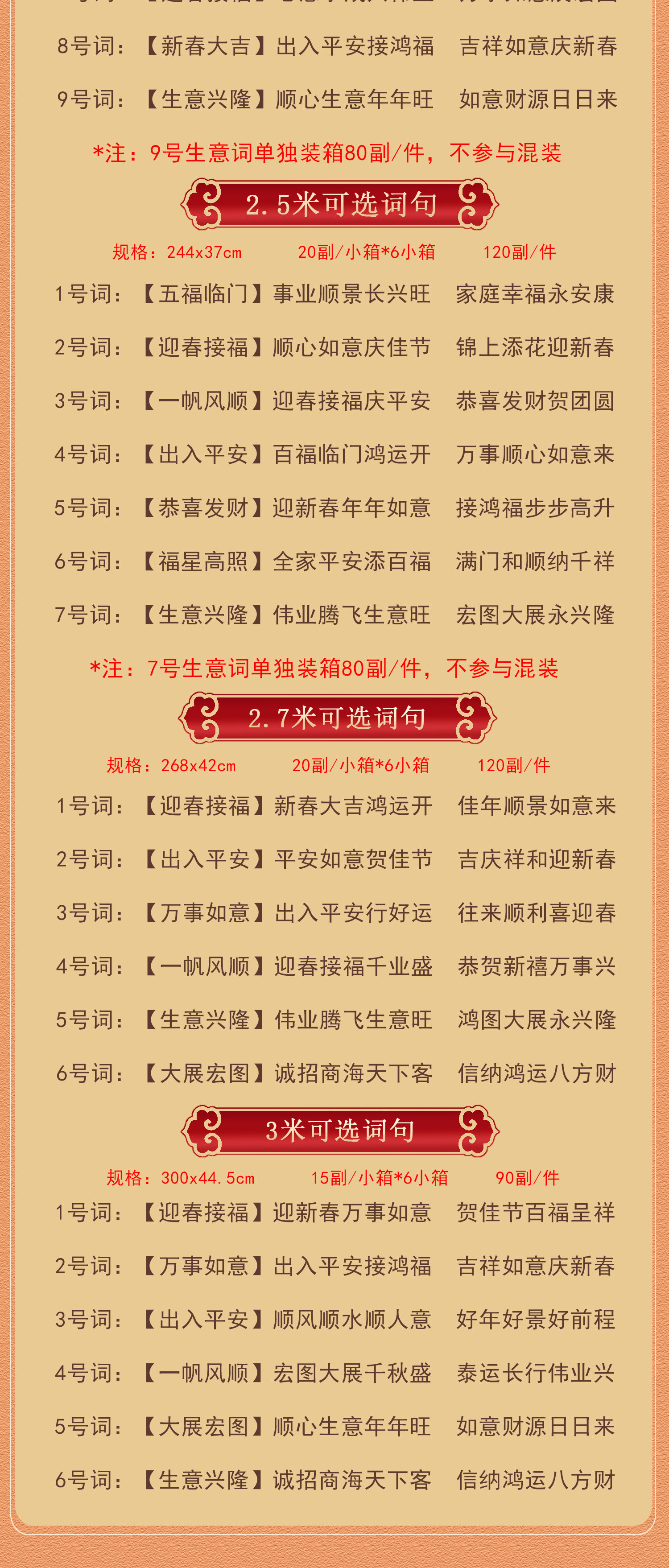| 1.8米⑥号词 事业顺景长兴旺 家庭幸福永安康 横批:出入平安 | USD $1.15 | 390 pair available |