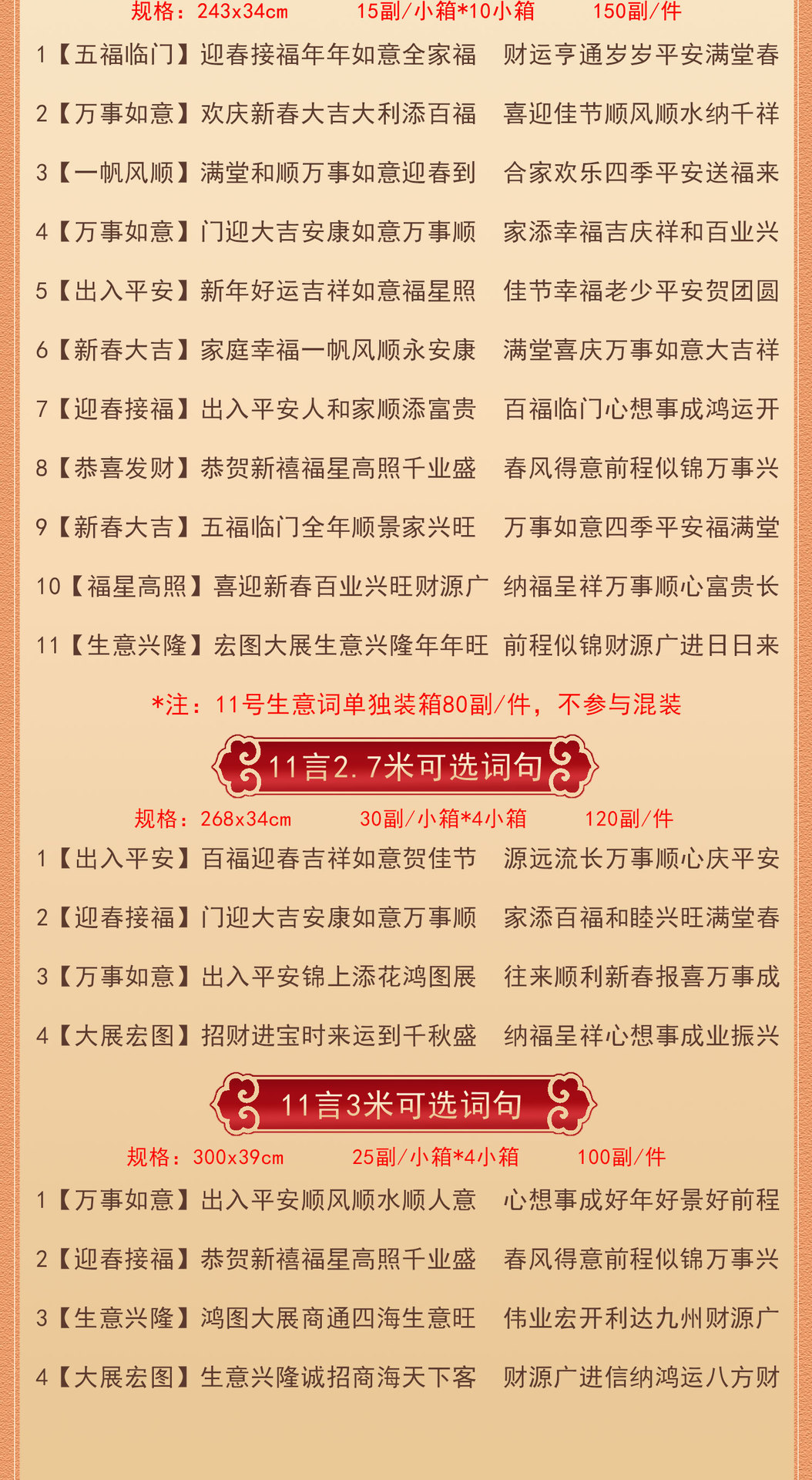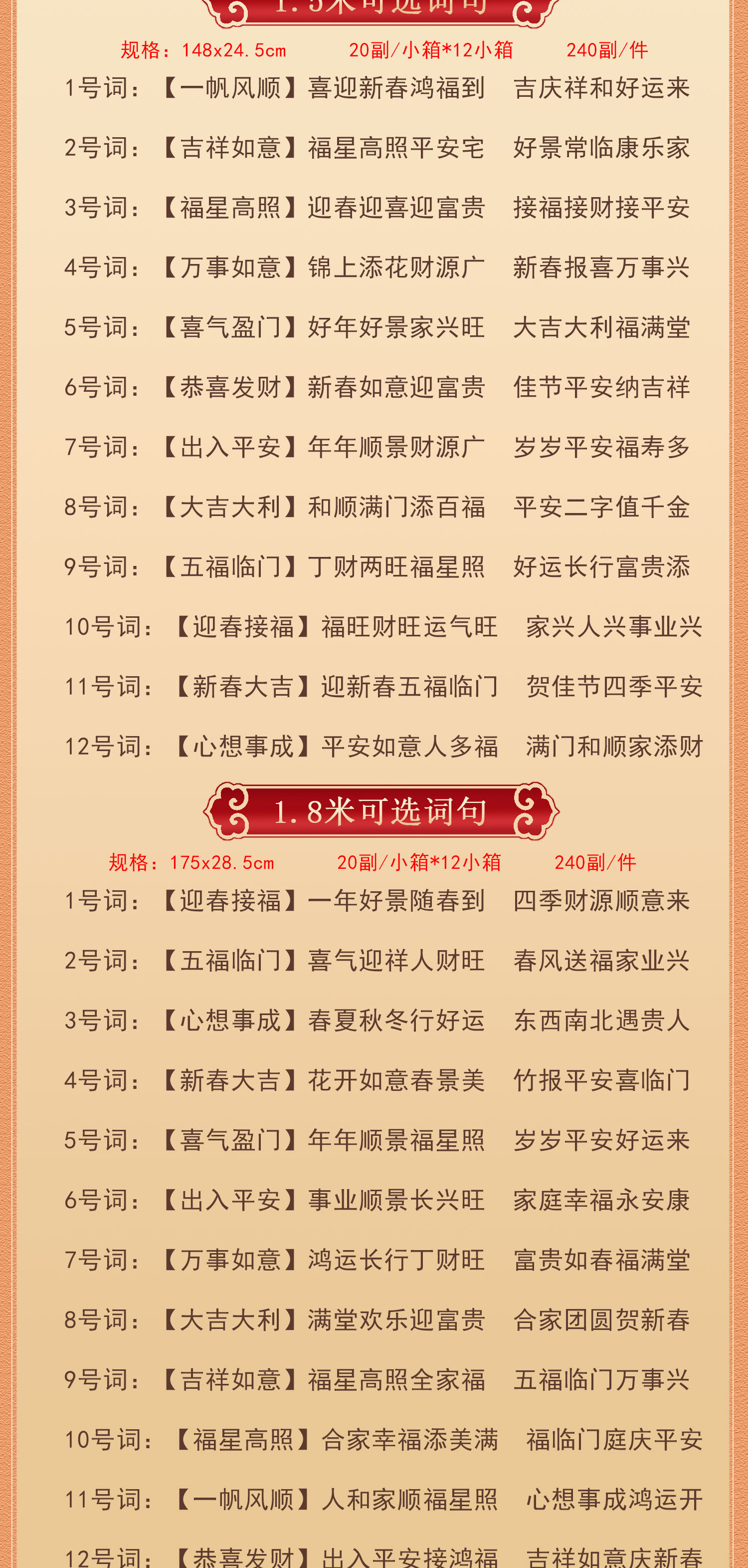 | 1.5米10号词 福旺财旺运气旺 家兴人兴事业兴 横批:迎春接福 | USD $0.94 | 350 pair available |