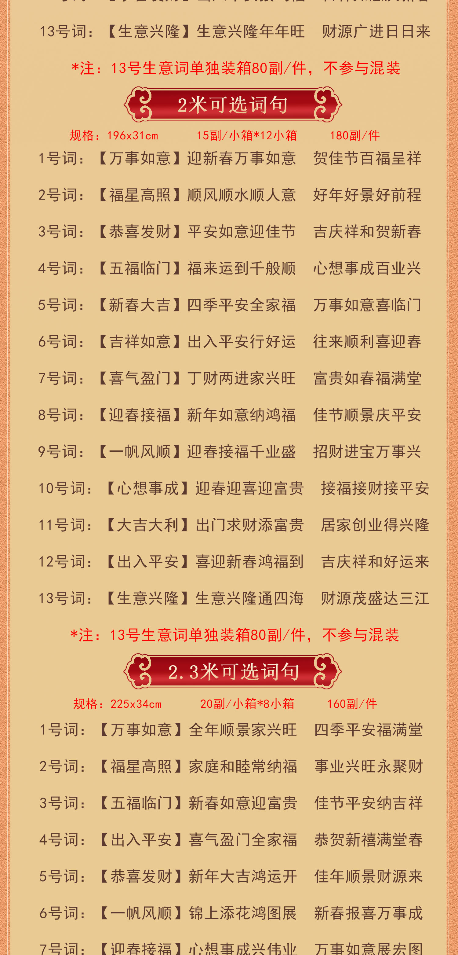 | 1.8米13号词 生意兴隆年年旺 财源广进日日来 横批:生意兴隆 | USD $1.15 | 370 pair available |