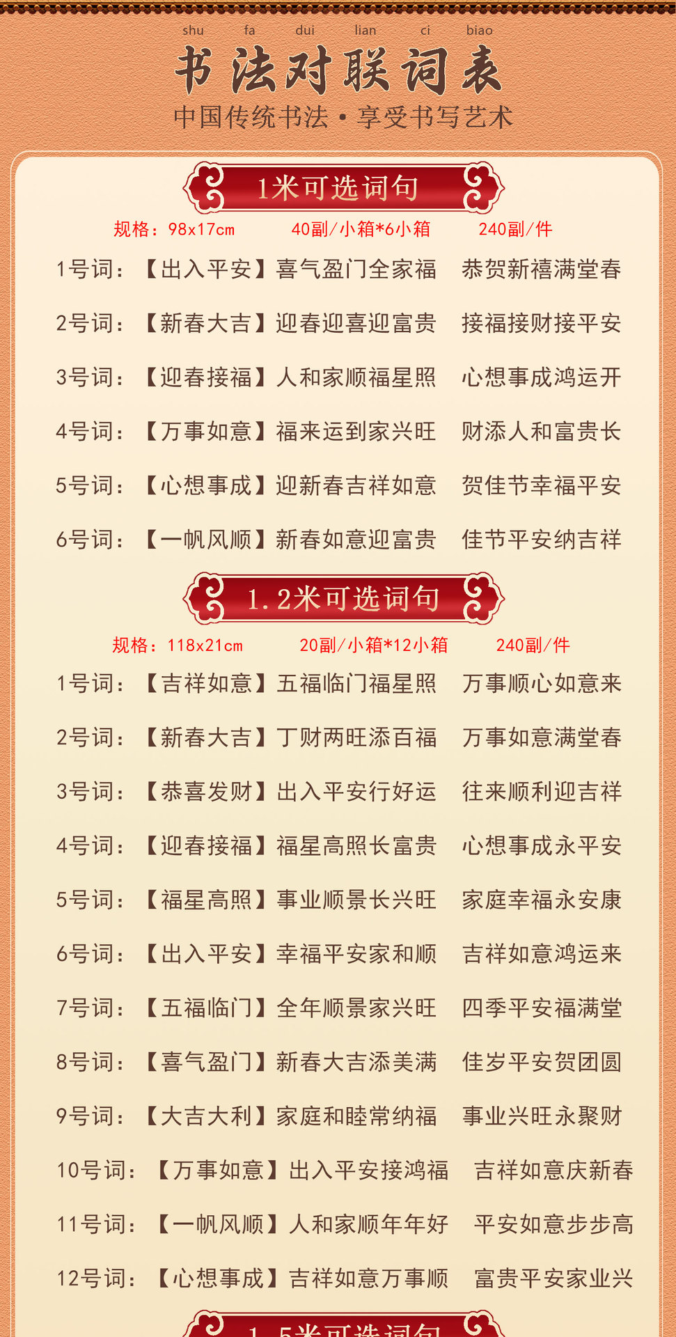 | 1.2米10号词 出入平安接鸿福 吉祥如意庆新春 横批:万事如意 | USD $0.73 | 410 pair available |