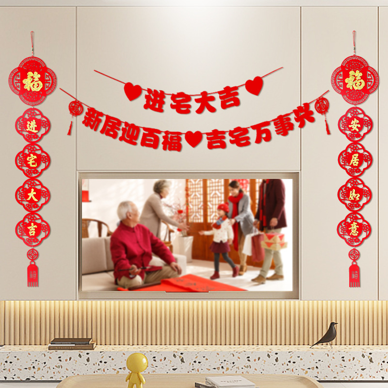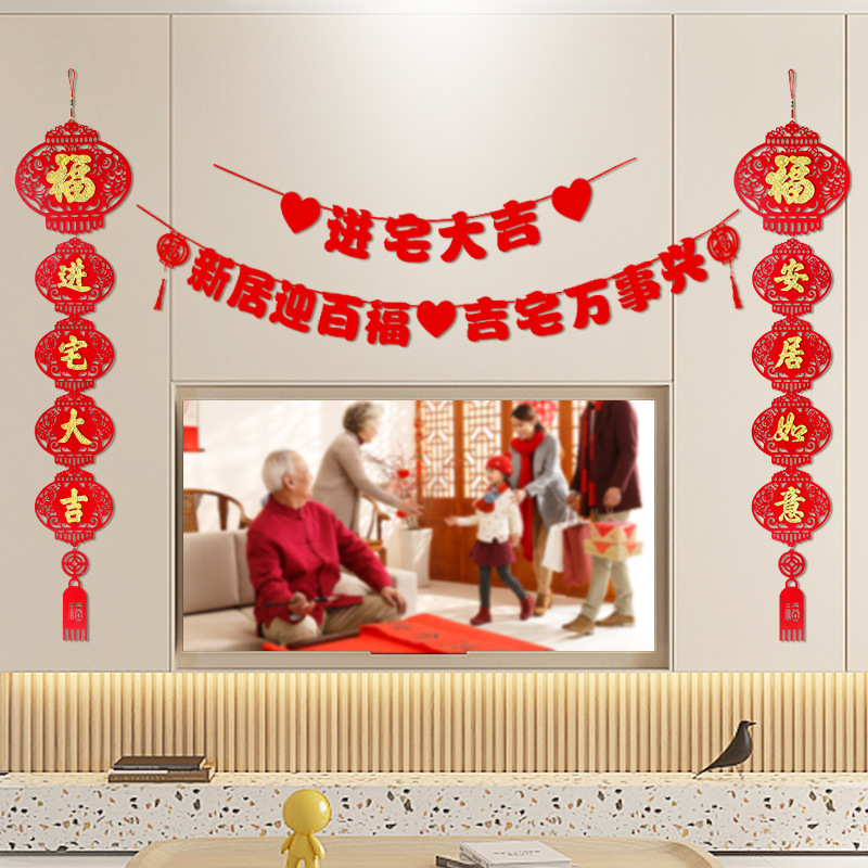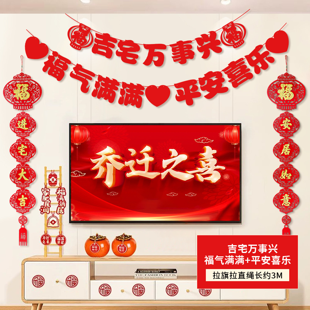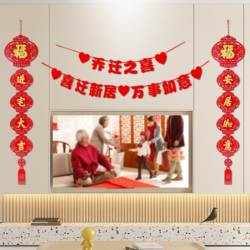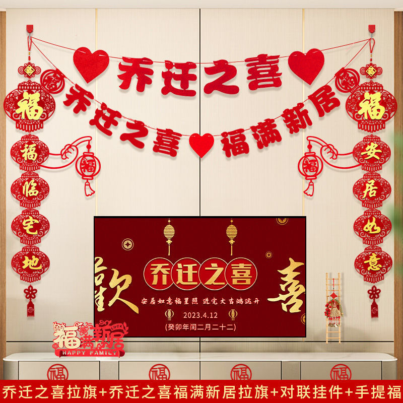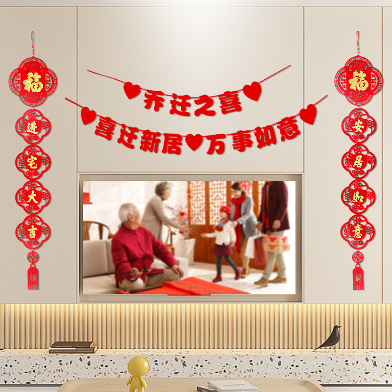 乔迁之喜装饰客厅电视背景墙布置用品大全新居入宅新居拉旗对联套