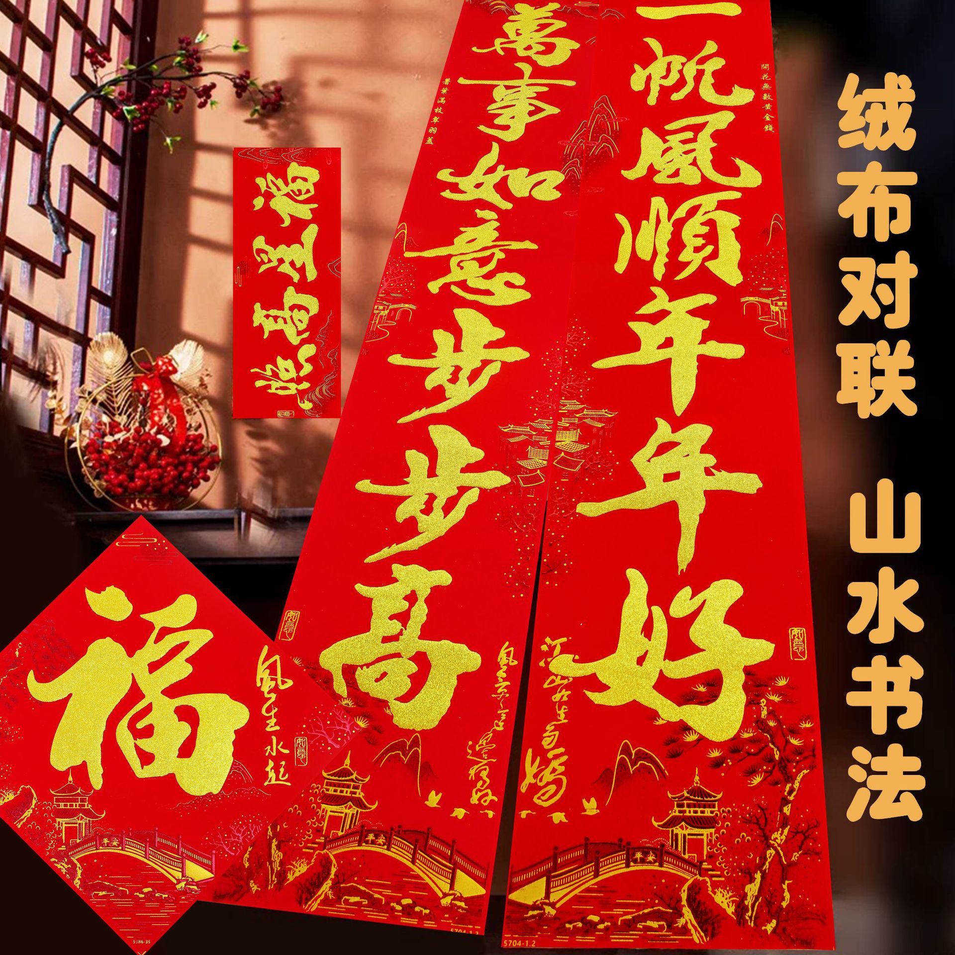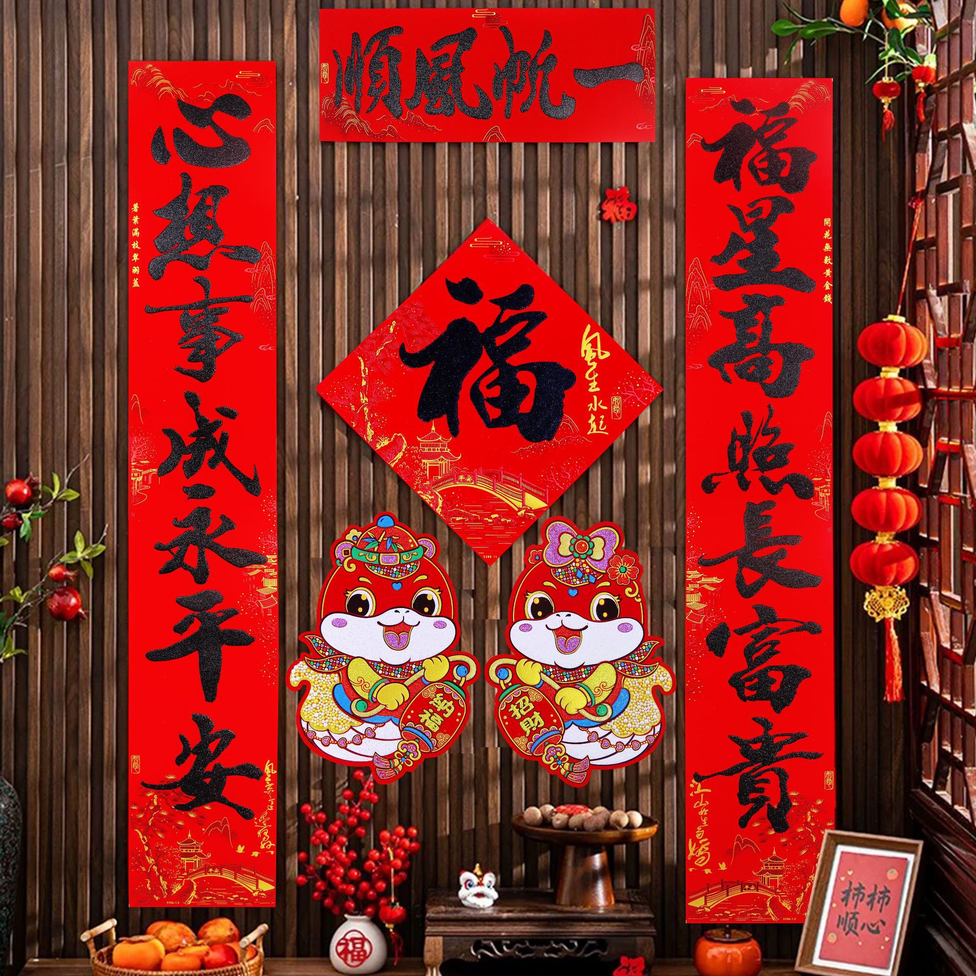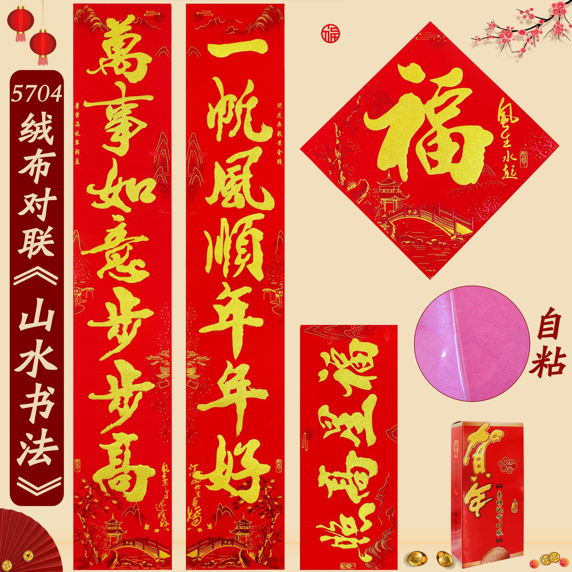 2025春联蛇年绒布全背胶金字山水书法黑金粉对联过年入户大门新年