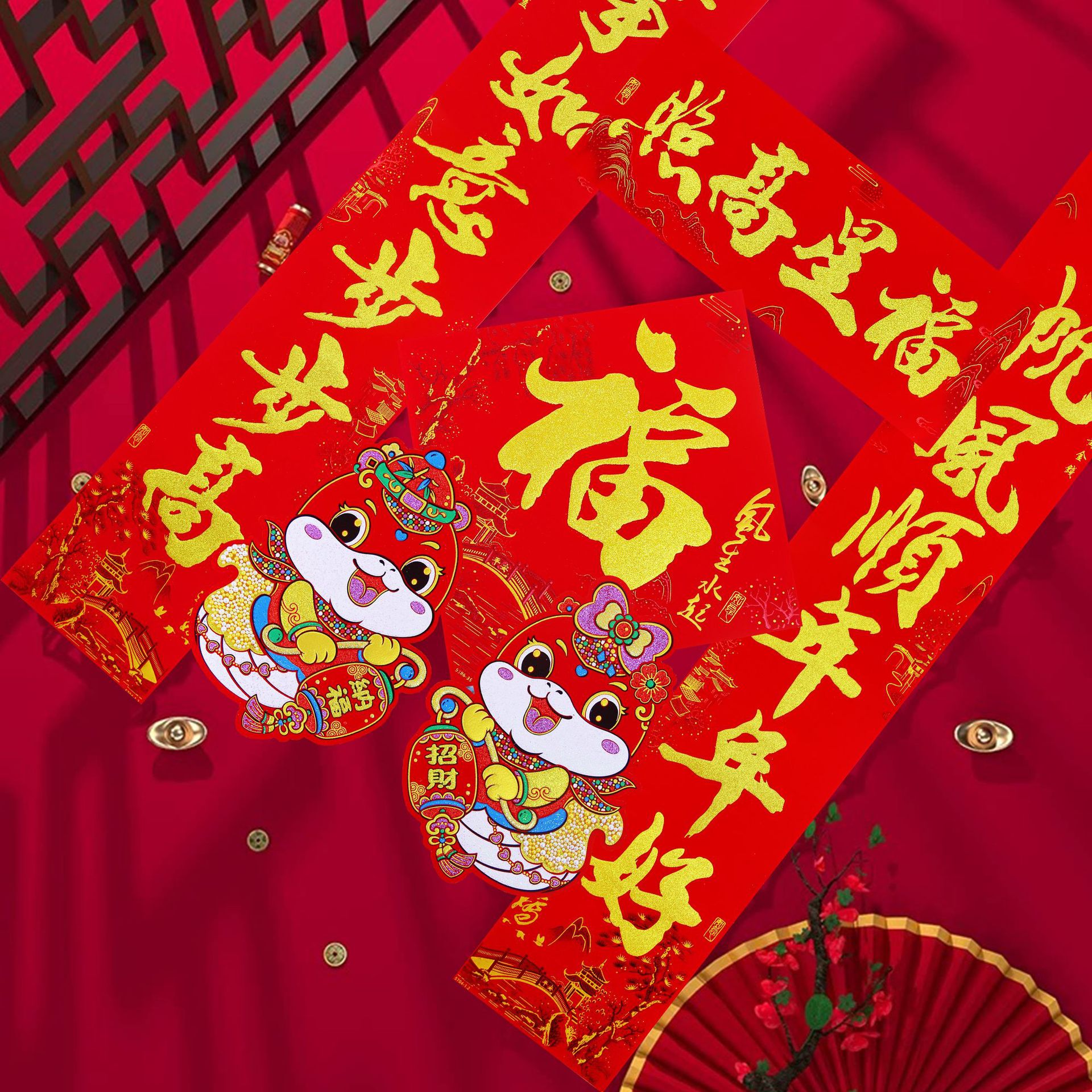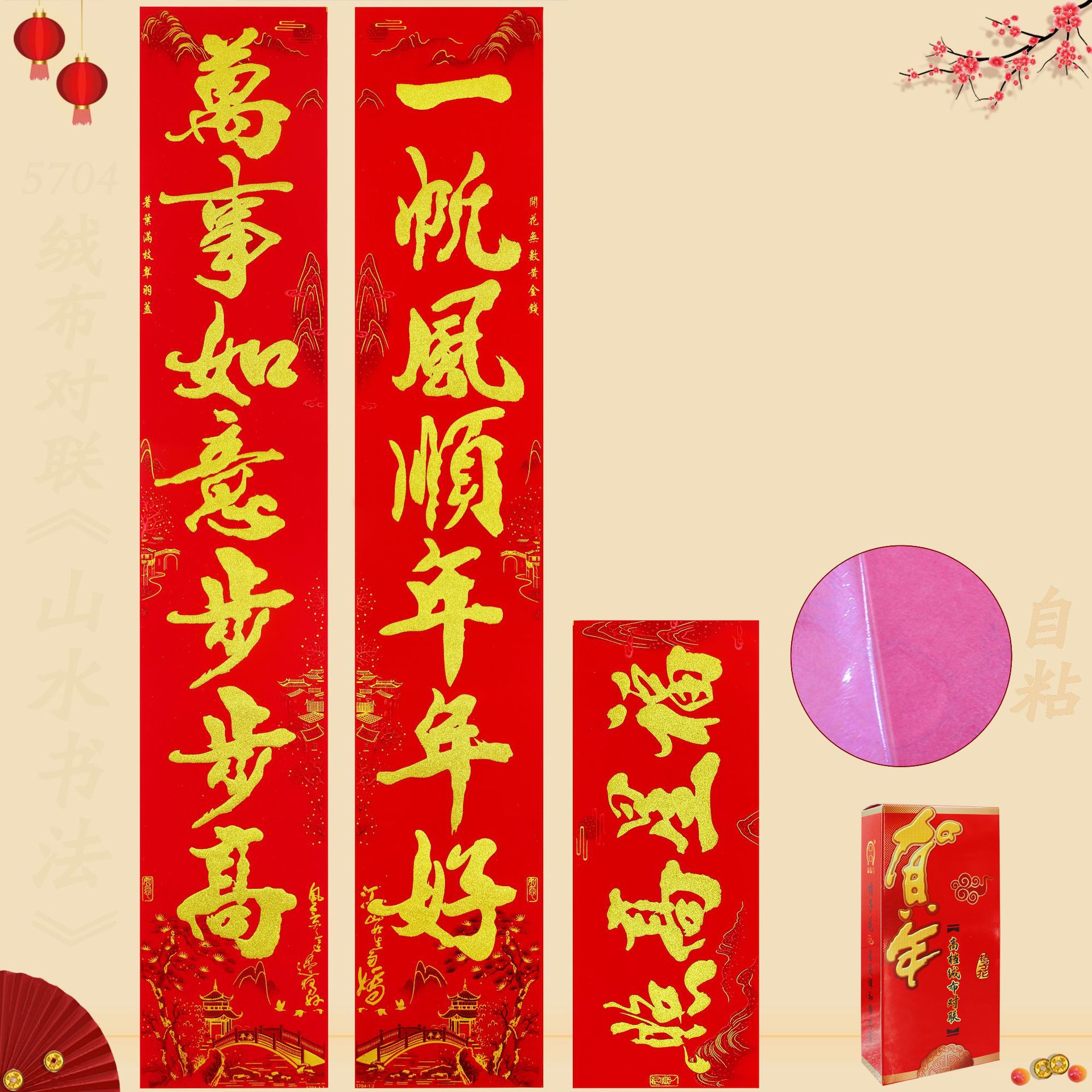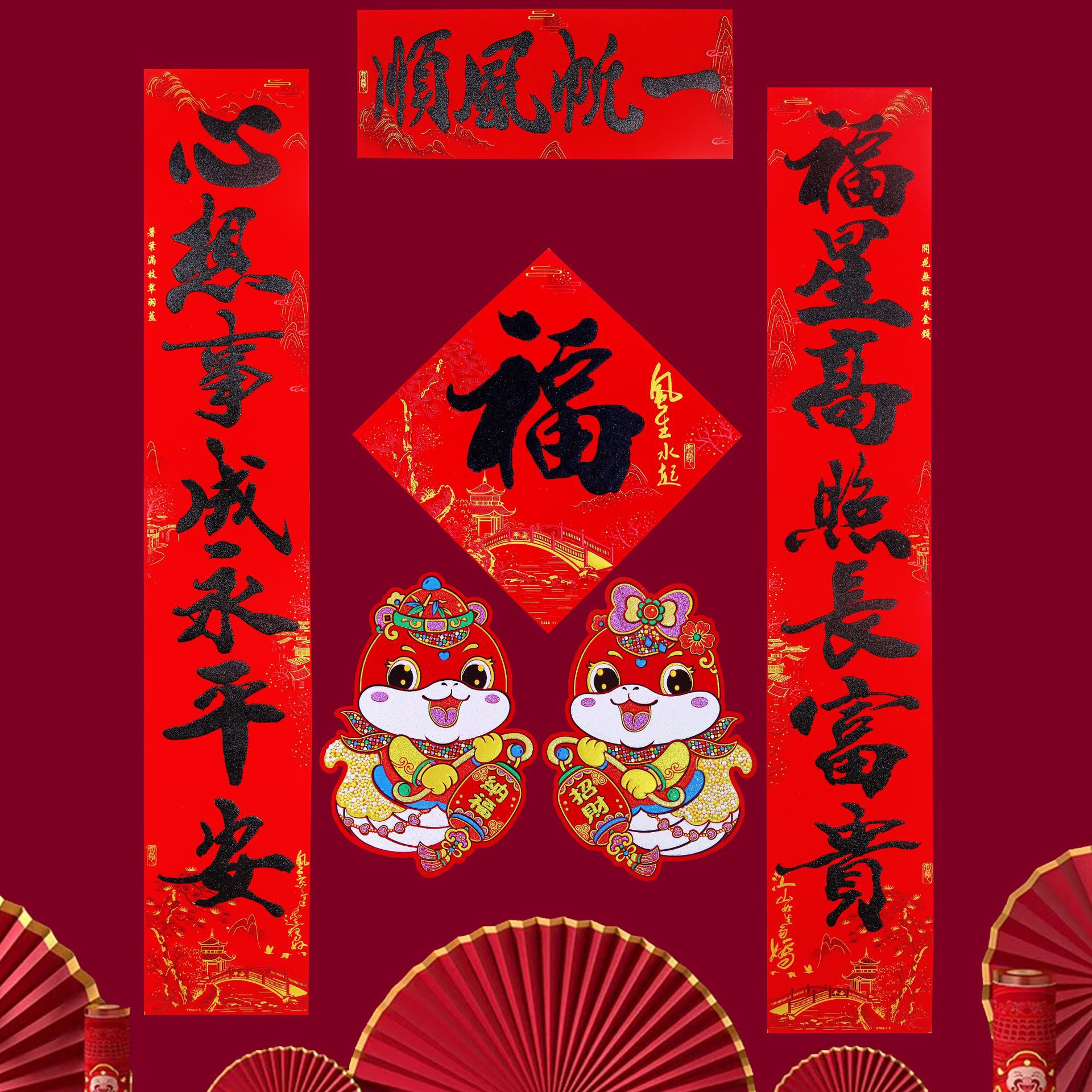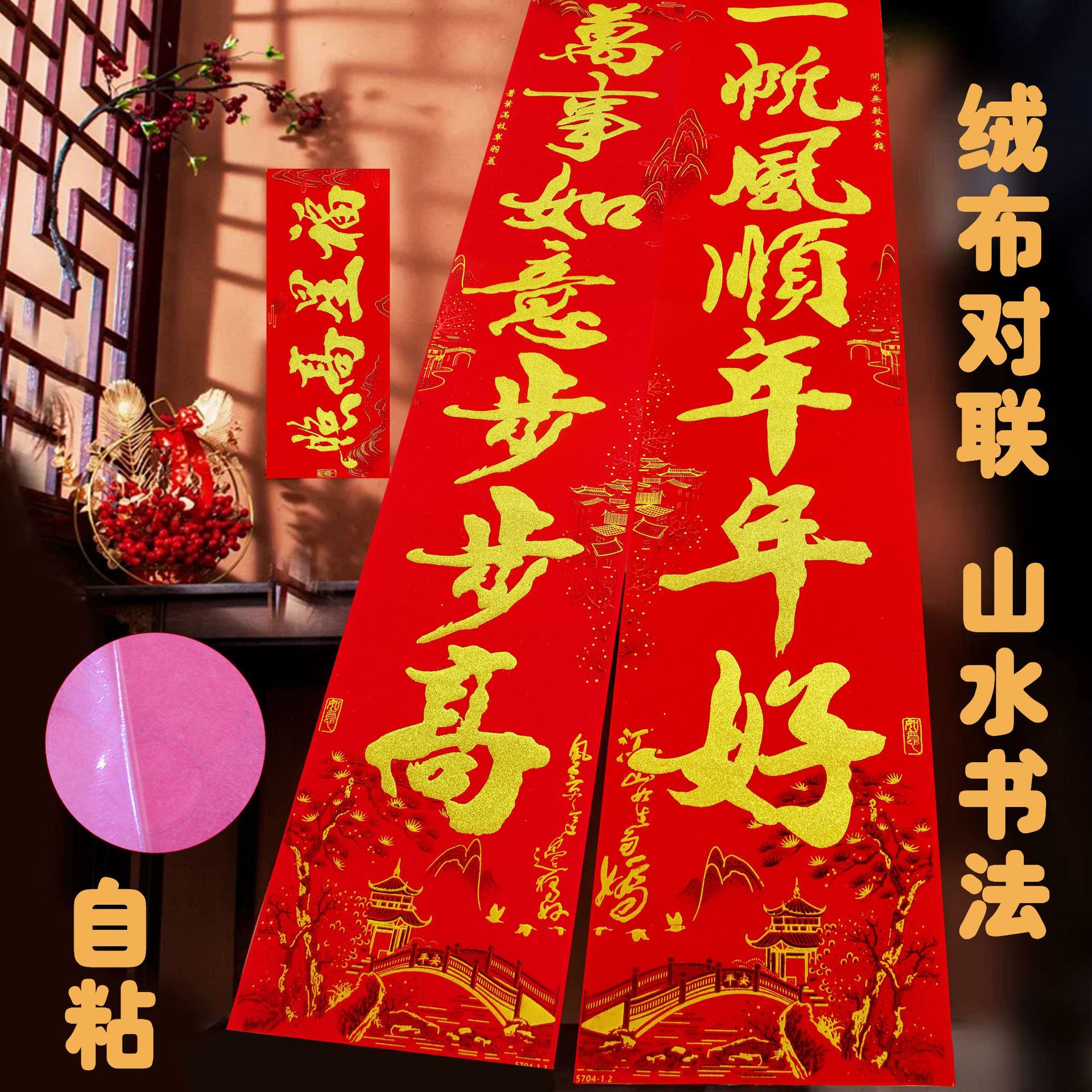2025春联蛇年绒布全背胶金字山水书法黑金粉对联过年入户大门新年