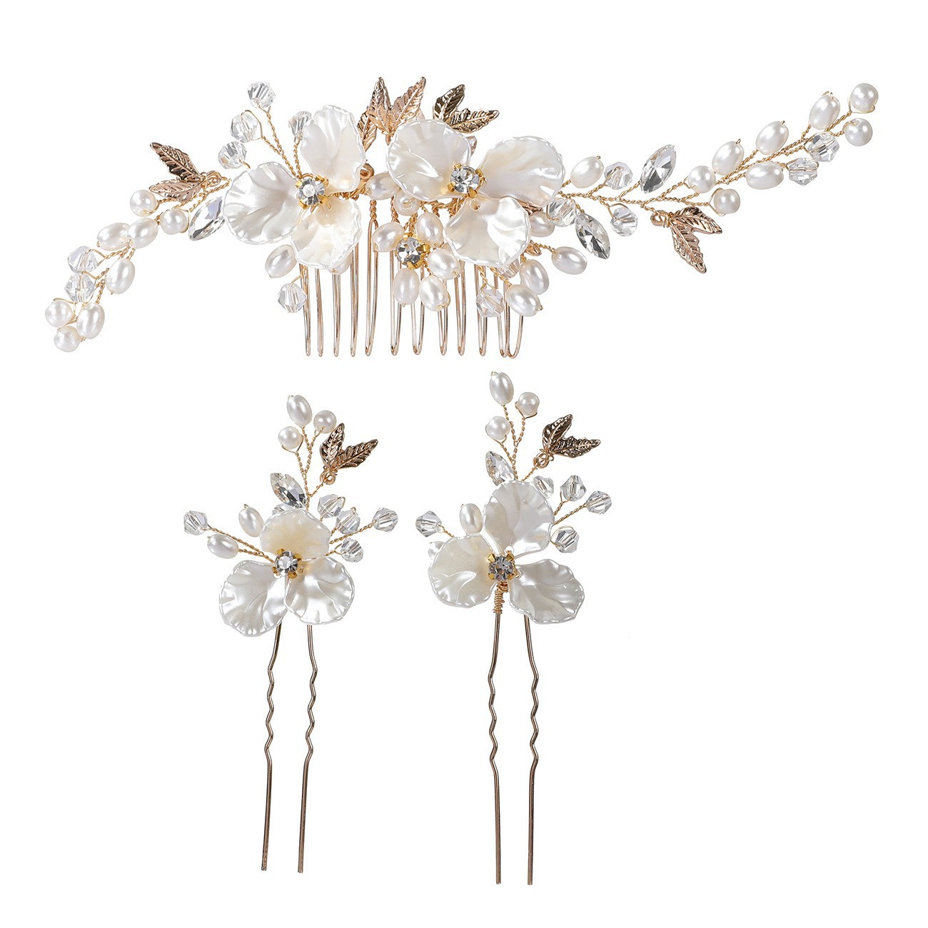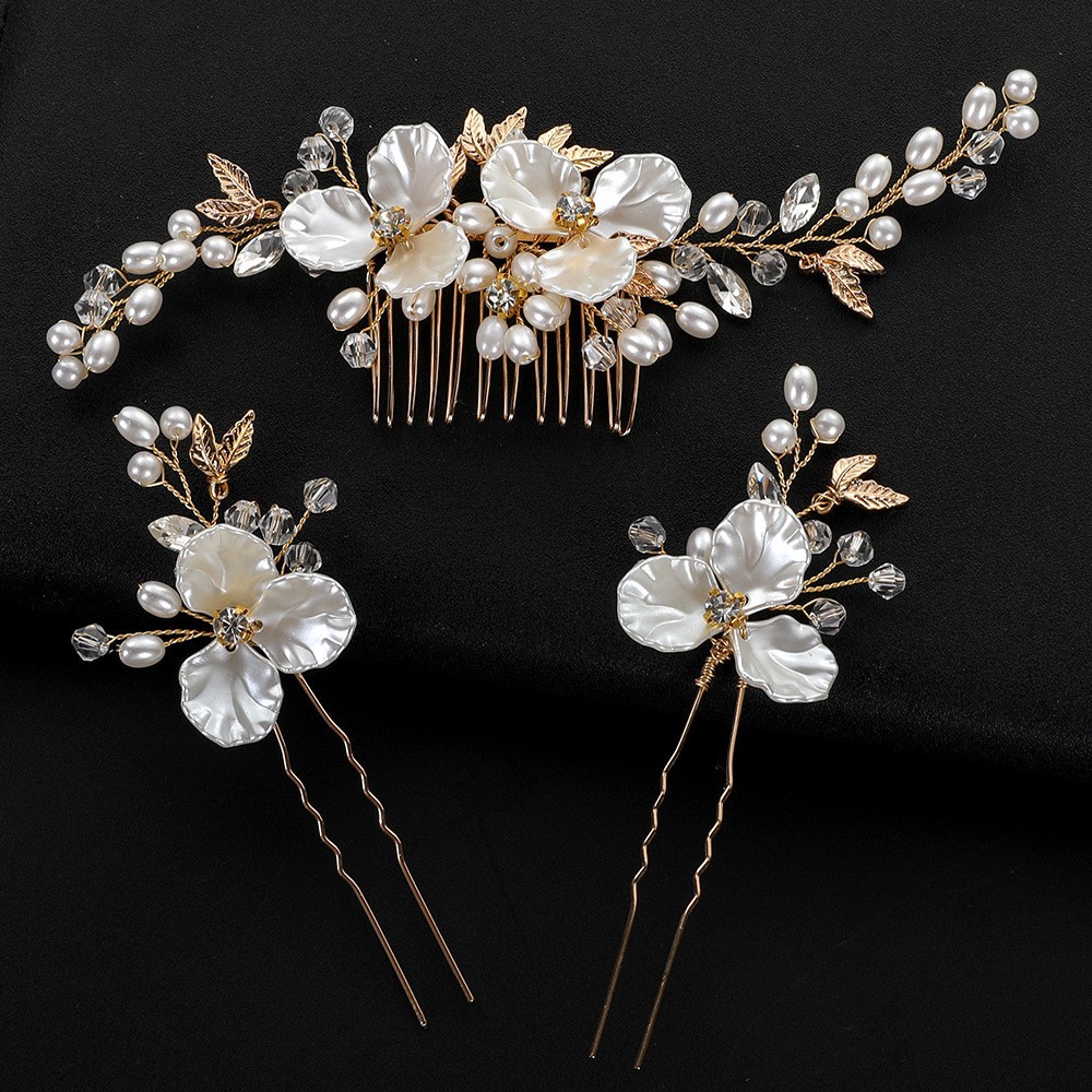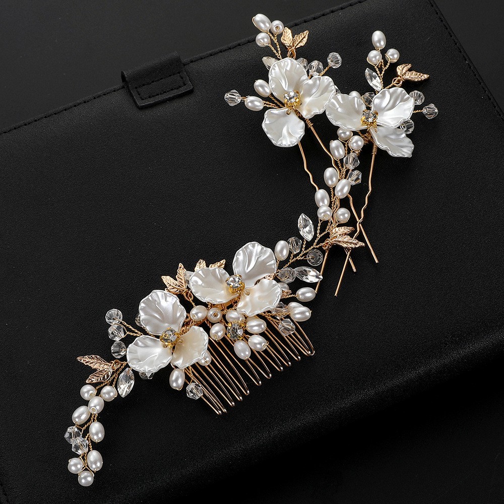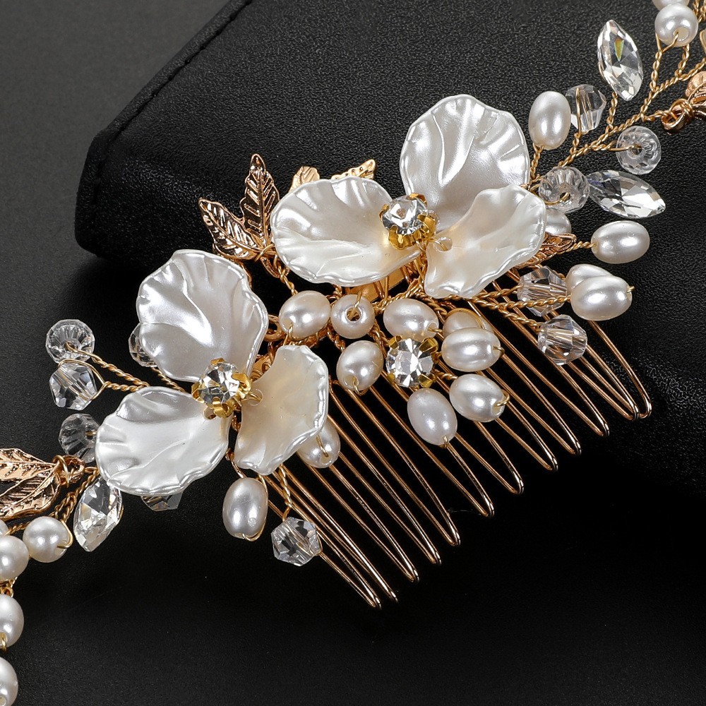欧美跨境新款珍珠花朵头饰婚纱礼服配饰精致金色叶子发梳新娘头饰