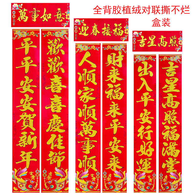 全背胶撕不烂植绒金粉对联新款春节农村大门春联免胶高端防水对联