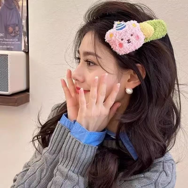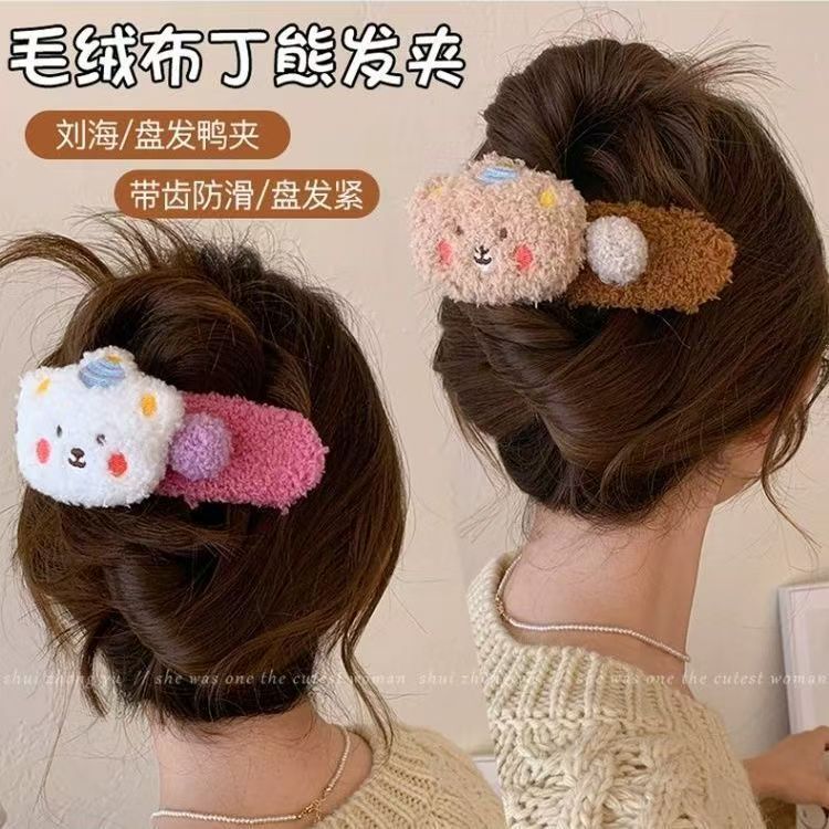 新款秋冬毛绒鸭嘴夹甜美气质小熊卡通发夹女发量少发抓发卡头饰