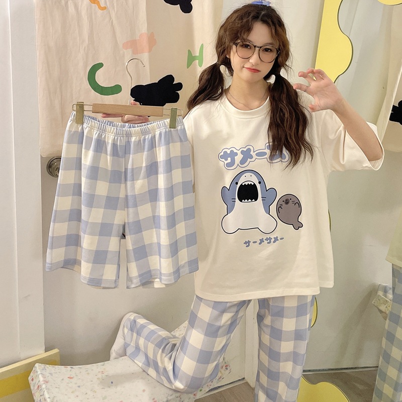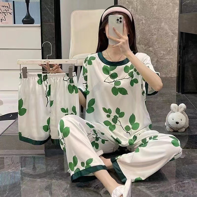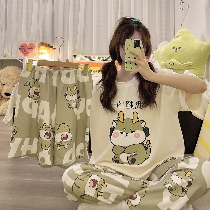 新款睡衣女夏季薄款短袖长裤2025年甜美卡通三件套装家居服可外穿
