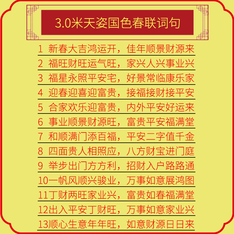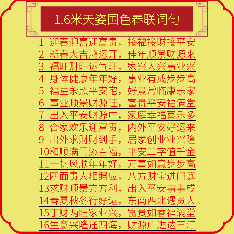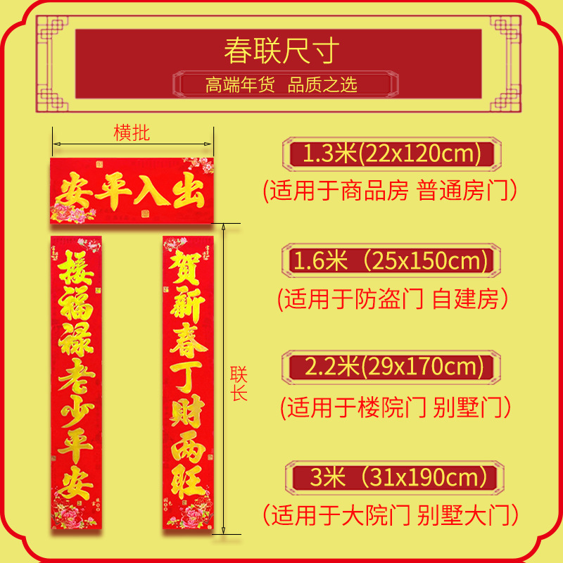 | 3米#字句4.迎春迎喜迎富贵,接福接财接平安(实长190*31CM) | USD $1.85 | 51 pair available |