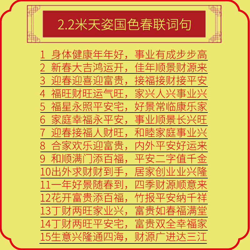 | 2.2米#字句3.迎春迎喜迎富贵,接福接财接平安(实长170*29CM) | USD $1.65 | 47 pair available |
