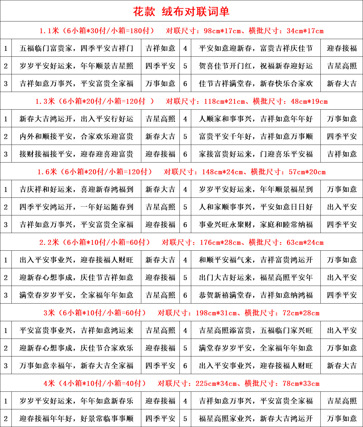 | 加厚(绒布全背胶花款)对联1.6# | USD $4.1 | 12120 pair available |