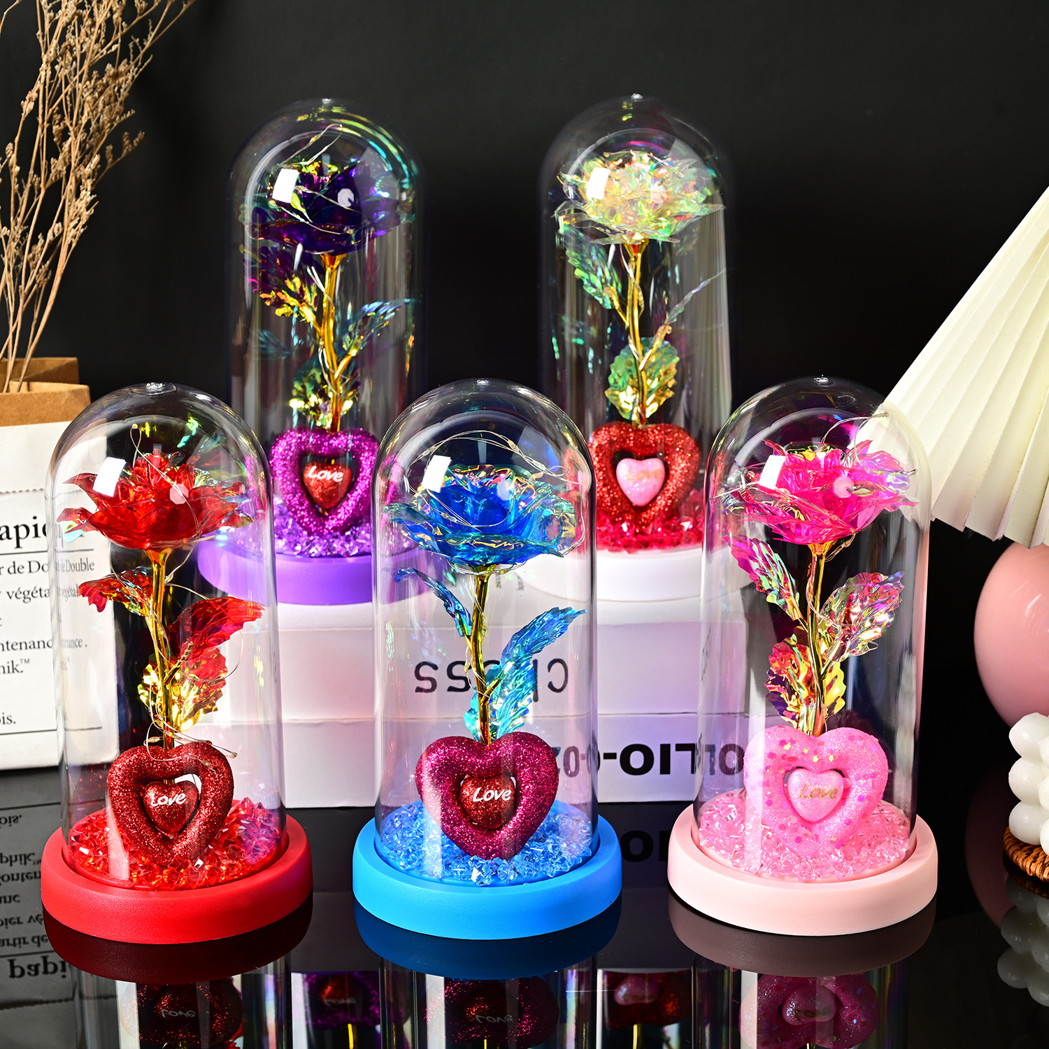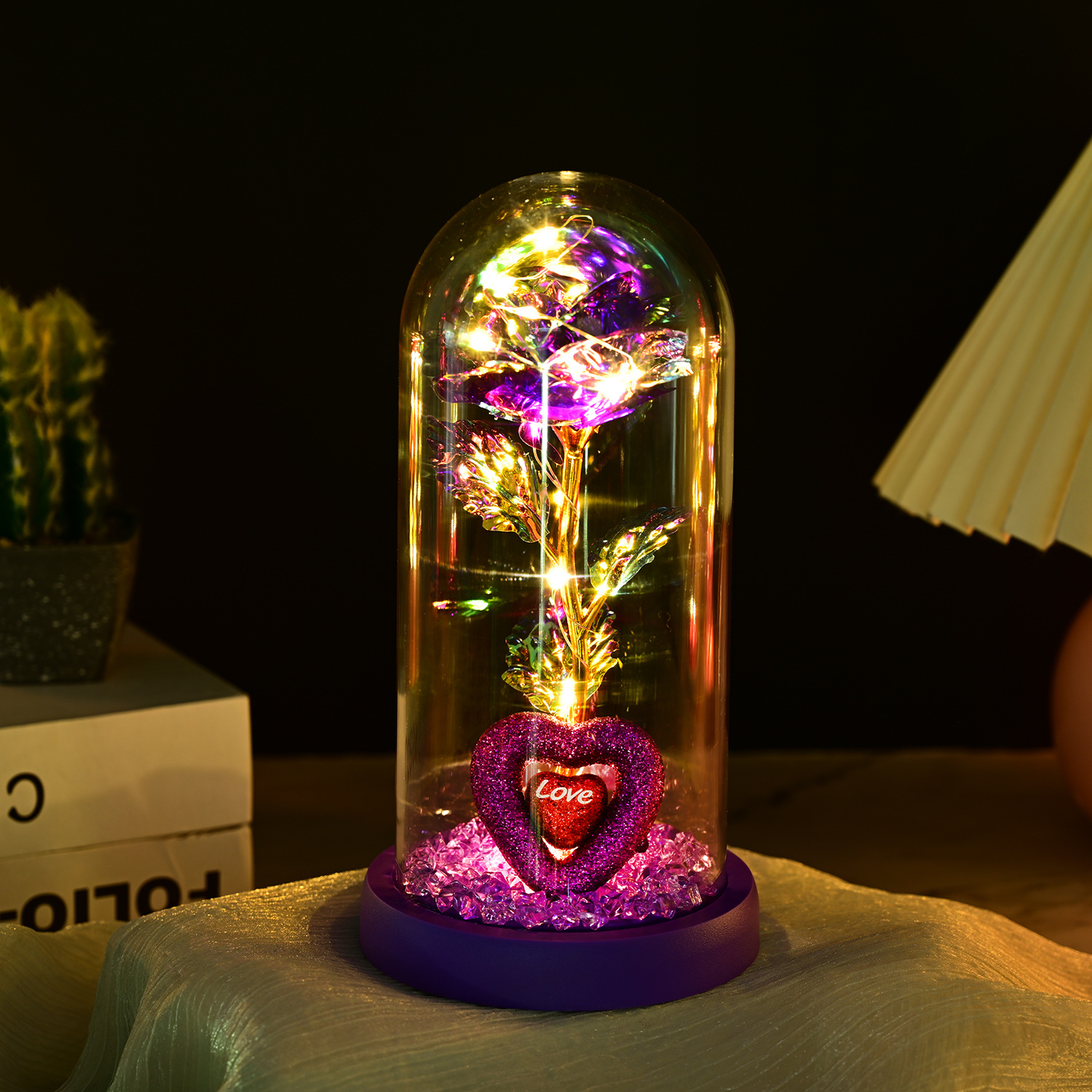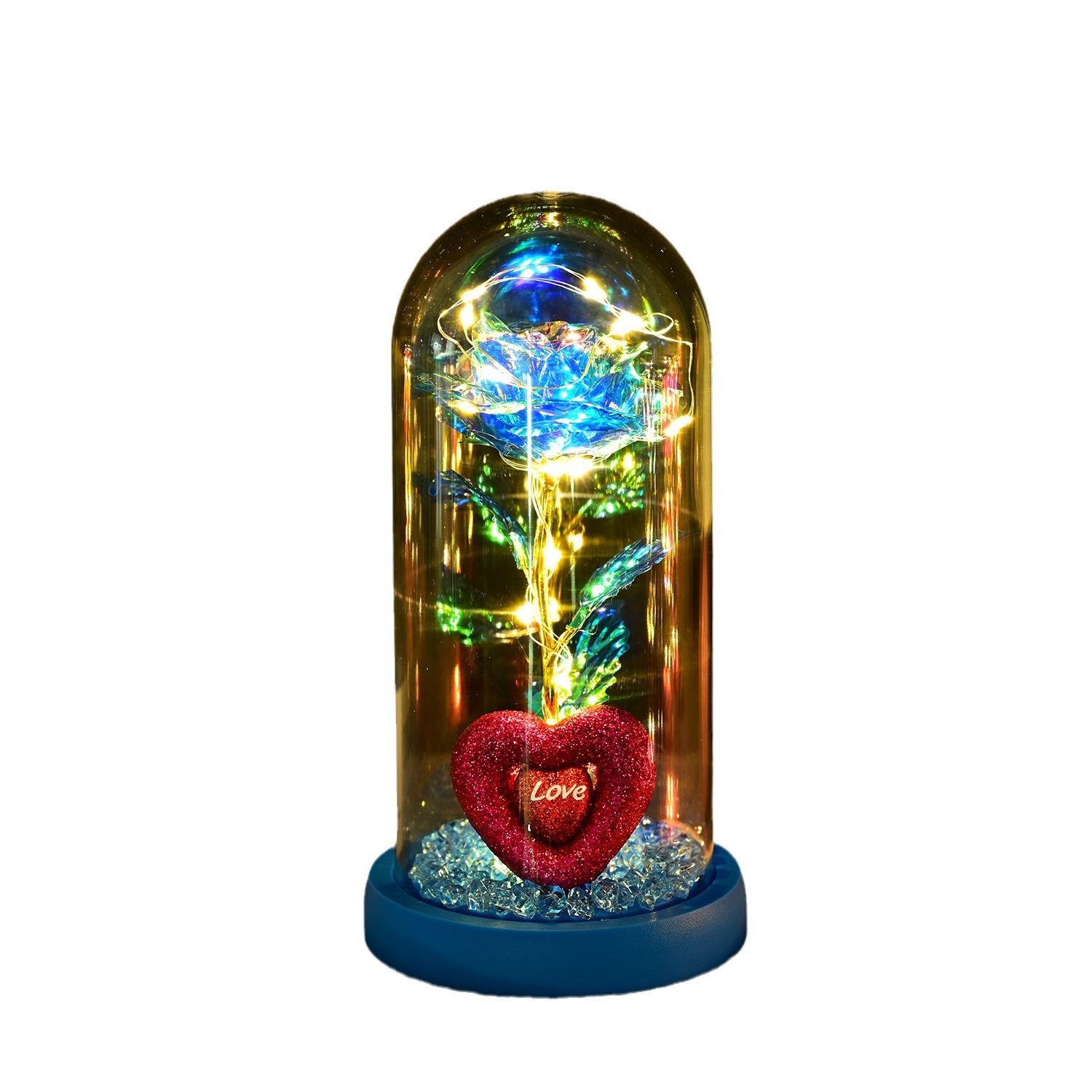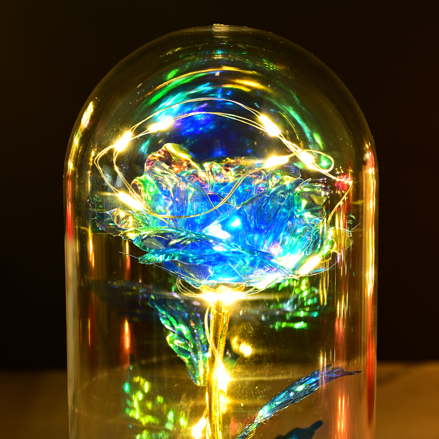 永生玫瑰花玻璃罩情人节礼品生日礼物七彩金箔花彩金仿真带灯摆件