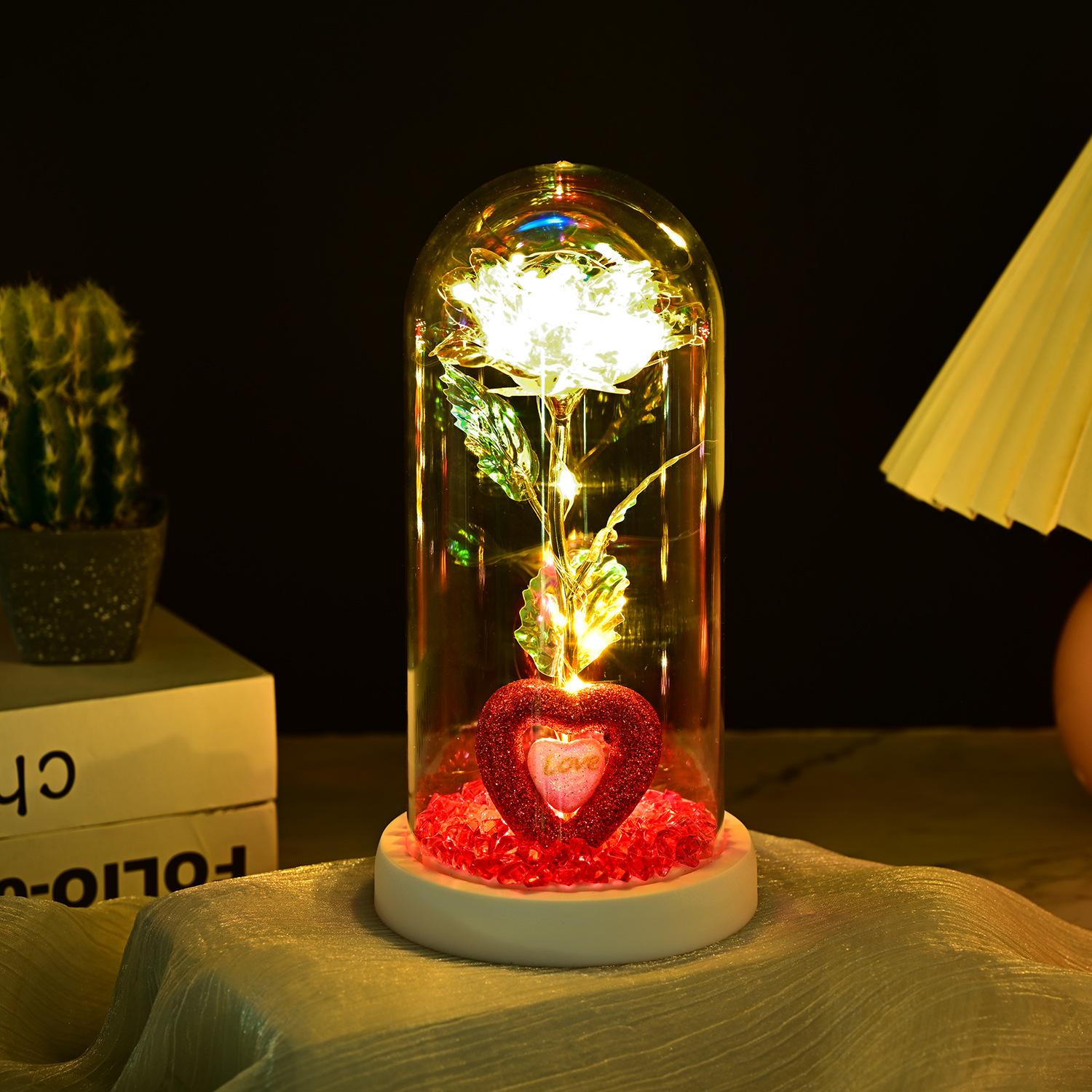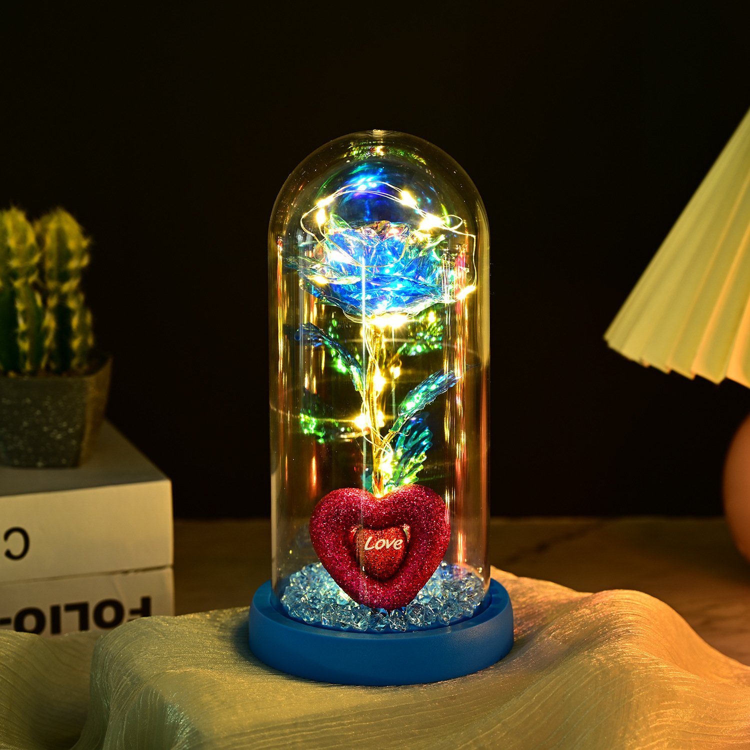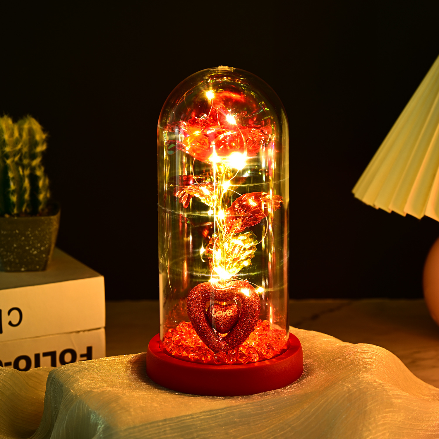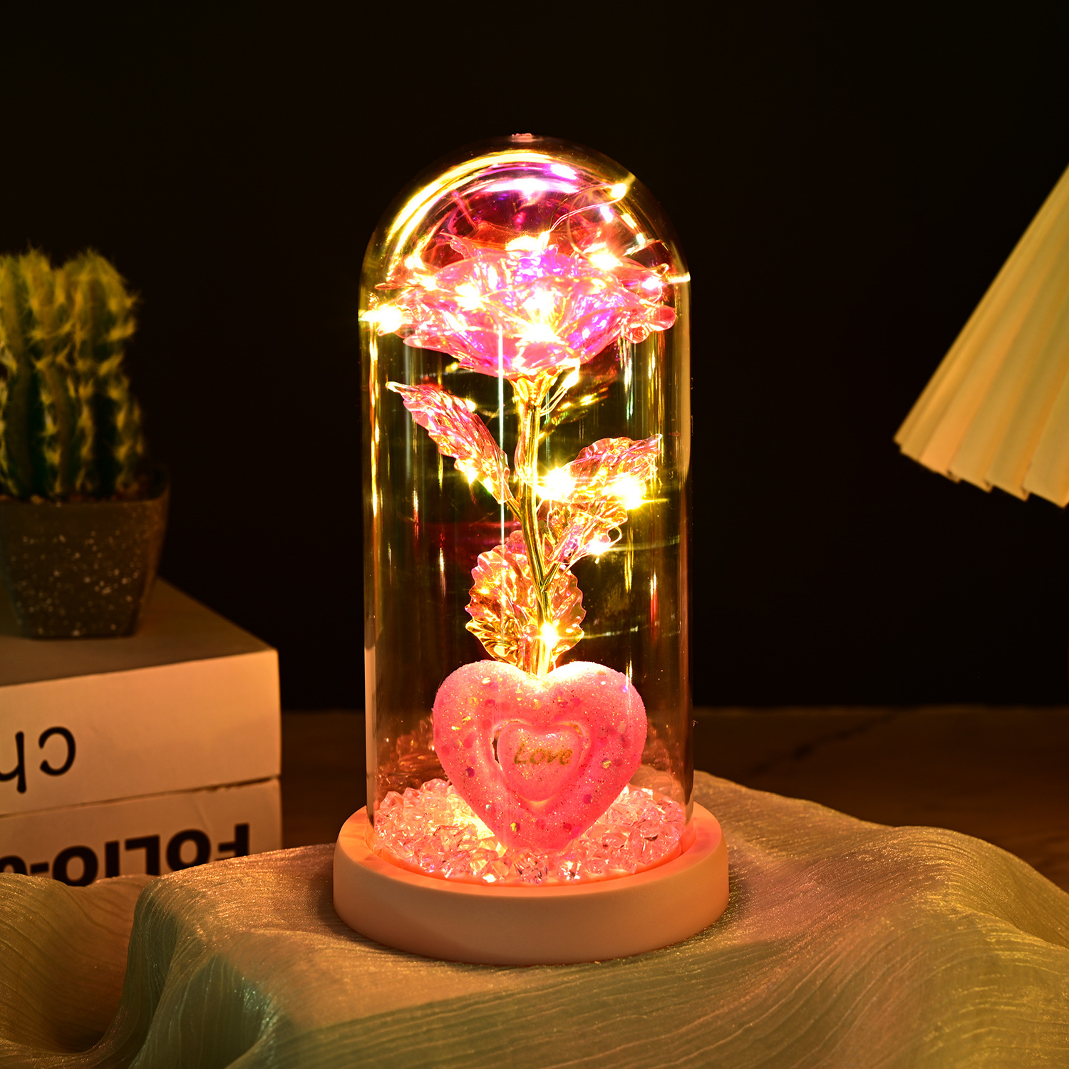 永生玫瑰花玻璃罩情人节礼品生日礼物七彩金箔花彩金仿真带灯摆件