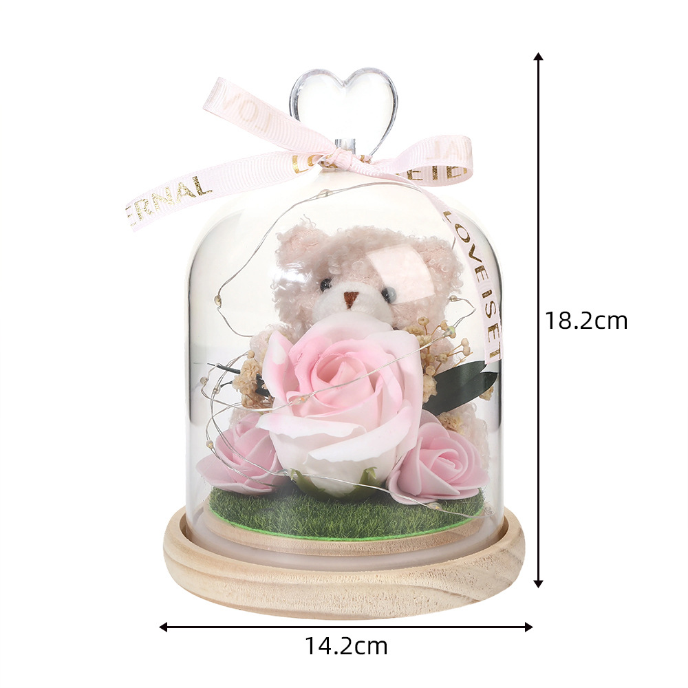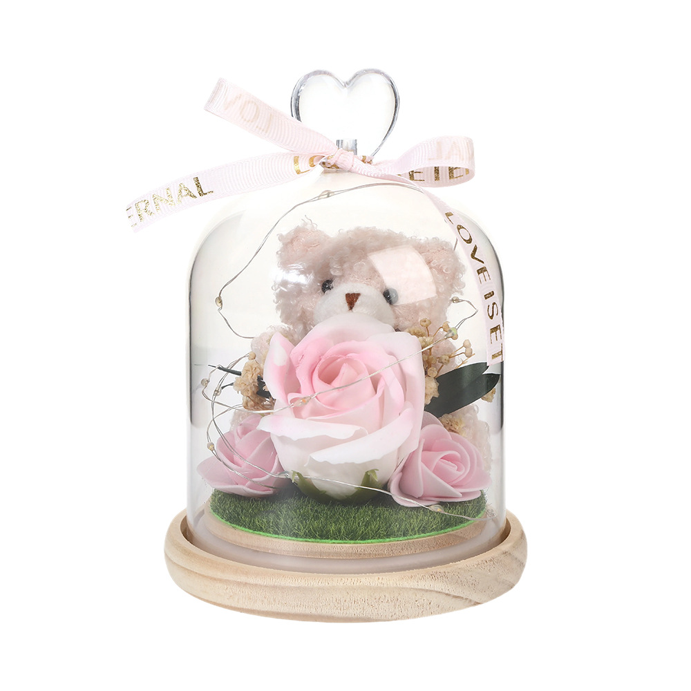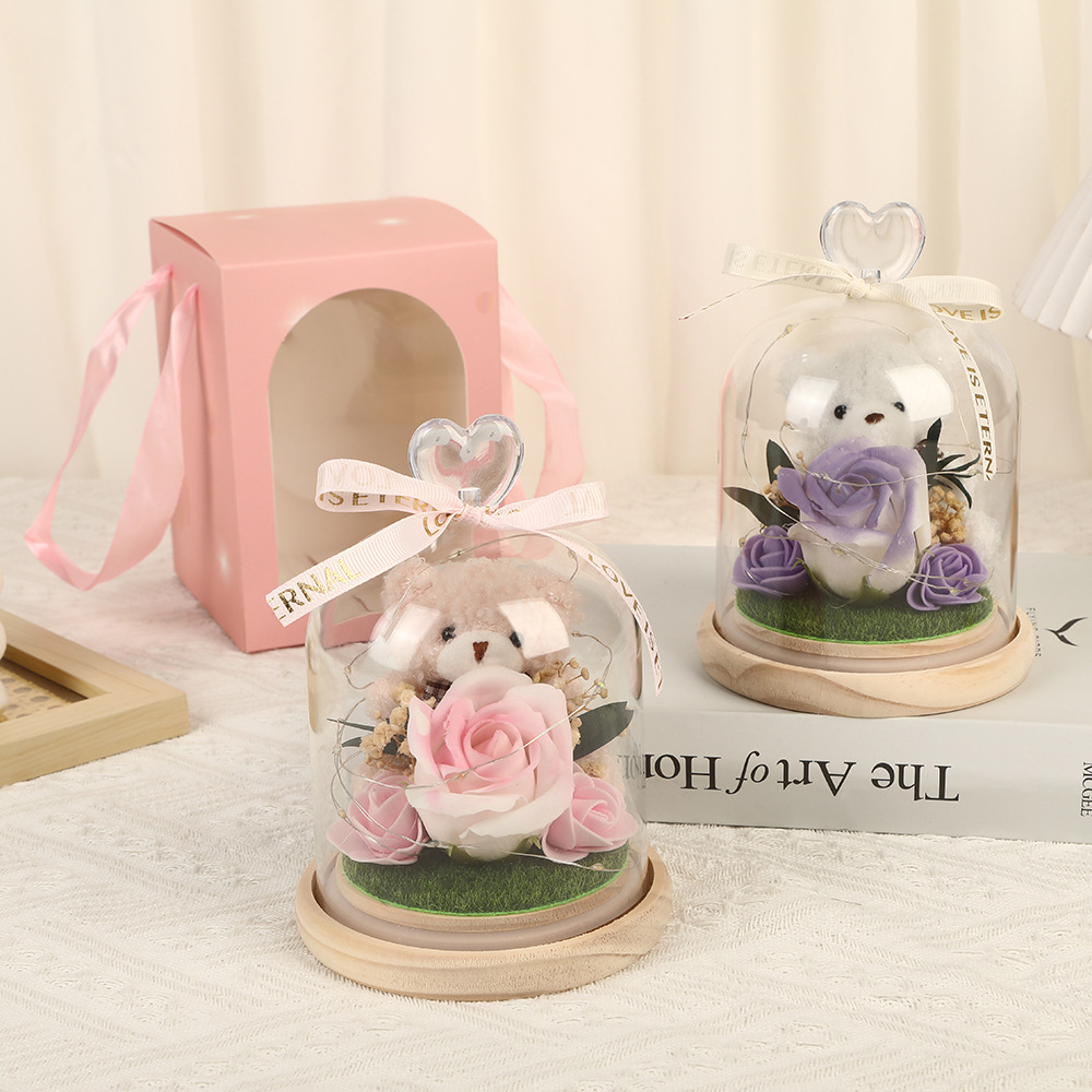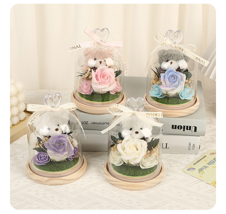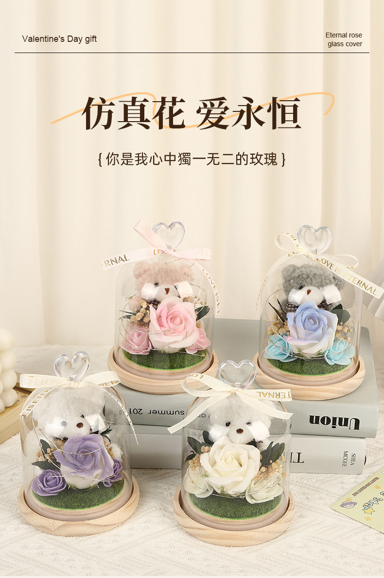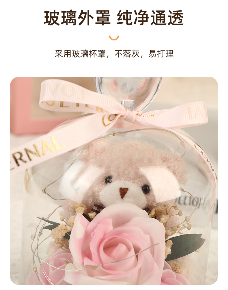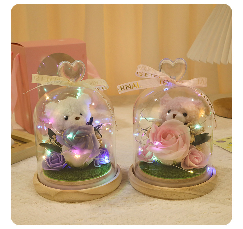 新款仿真花玻璃罩塑料罩礼品可爱风小熊情人节礼物高级感花灯批发