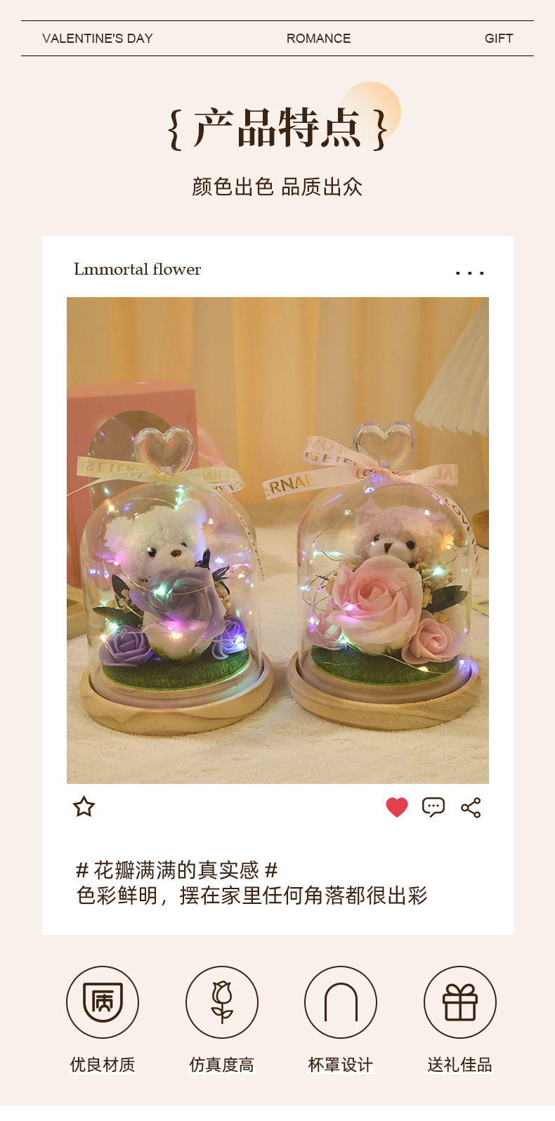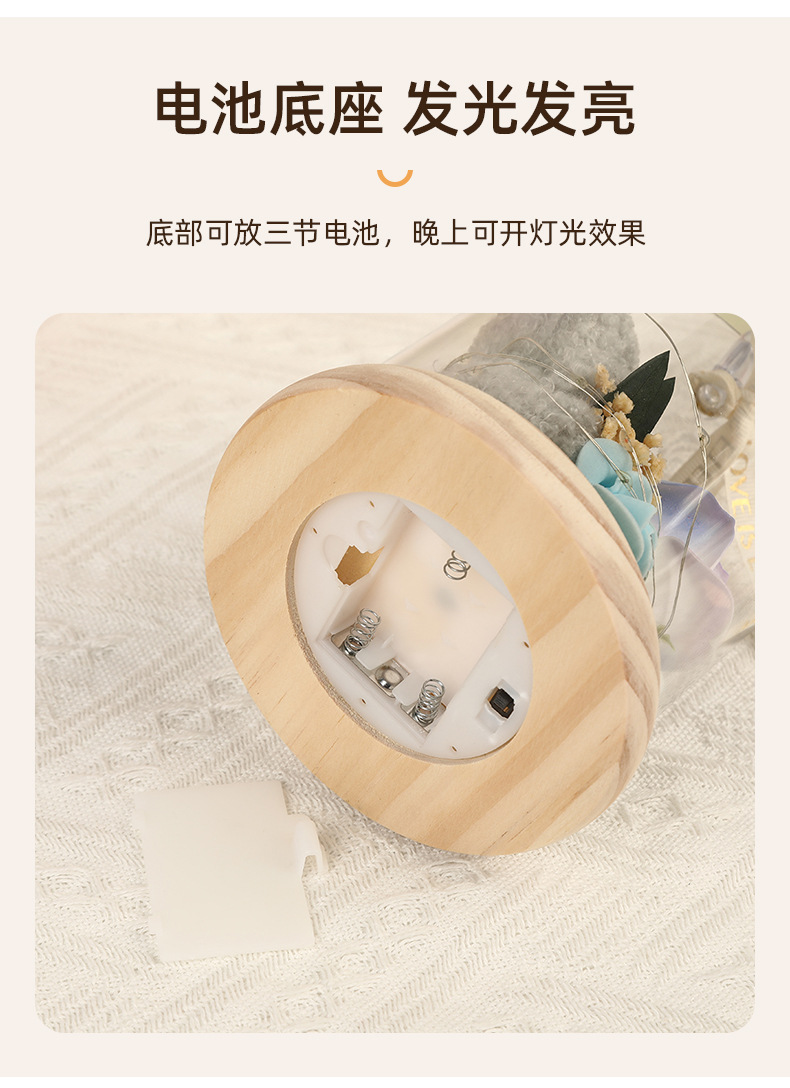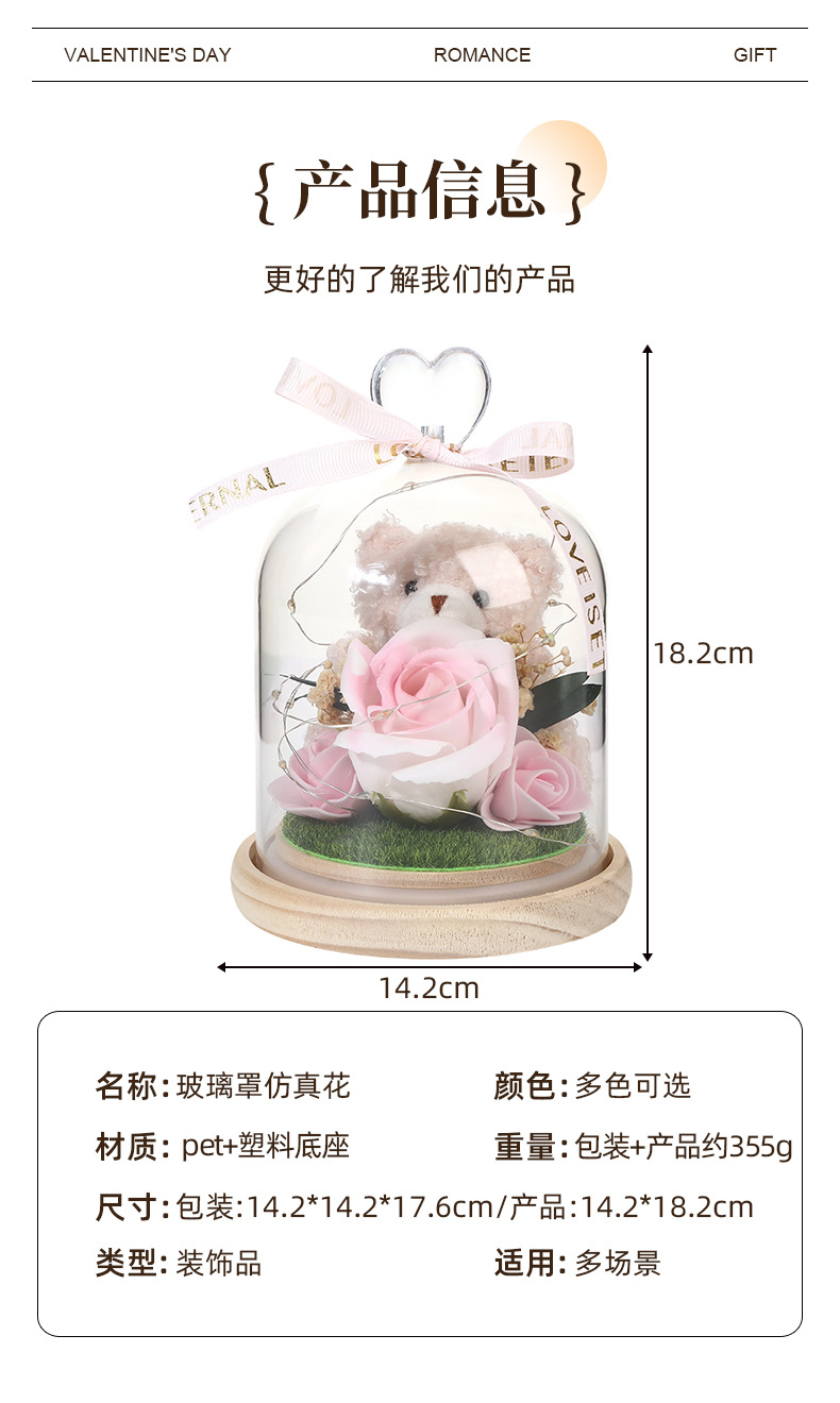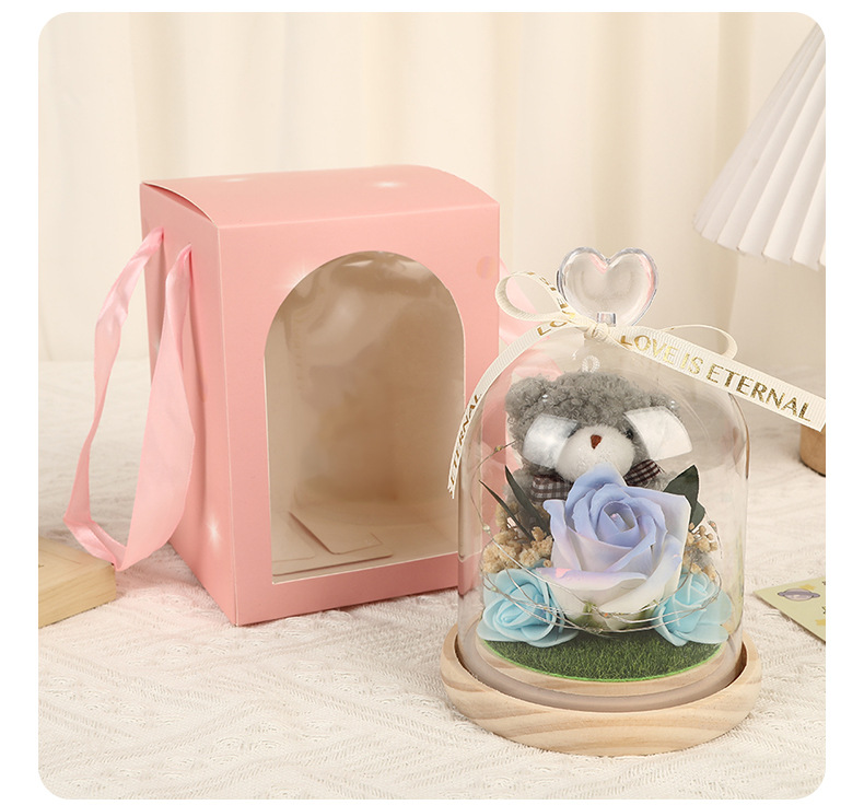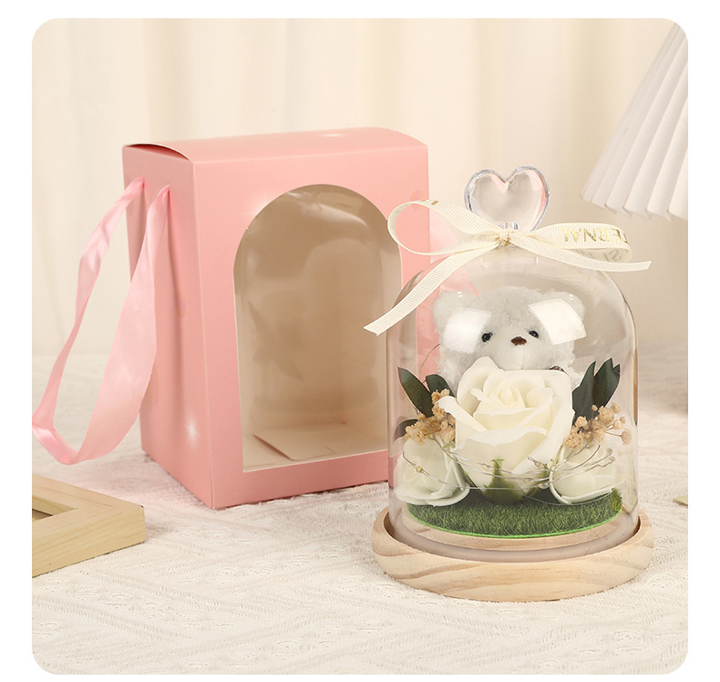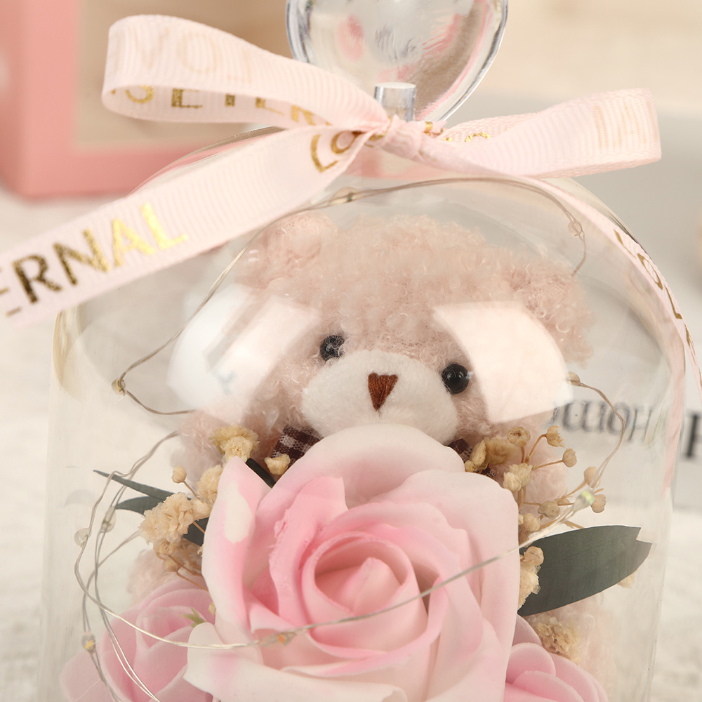 新款仿真花玻璃罩塑料罩礼品可爱风小熊情人节礼物高级感花灯批发