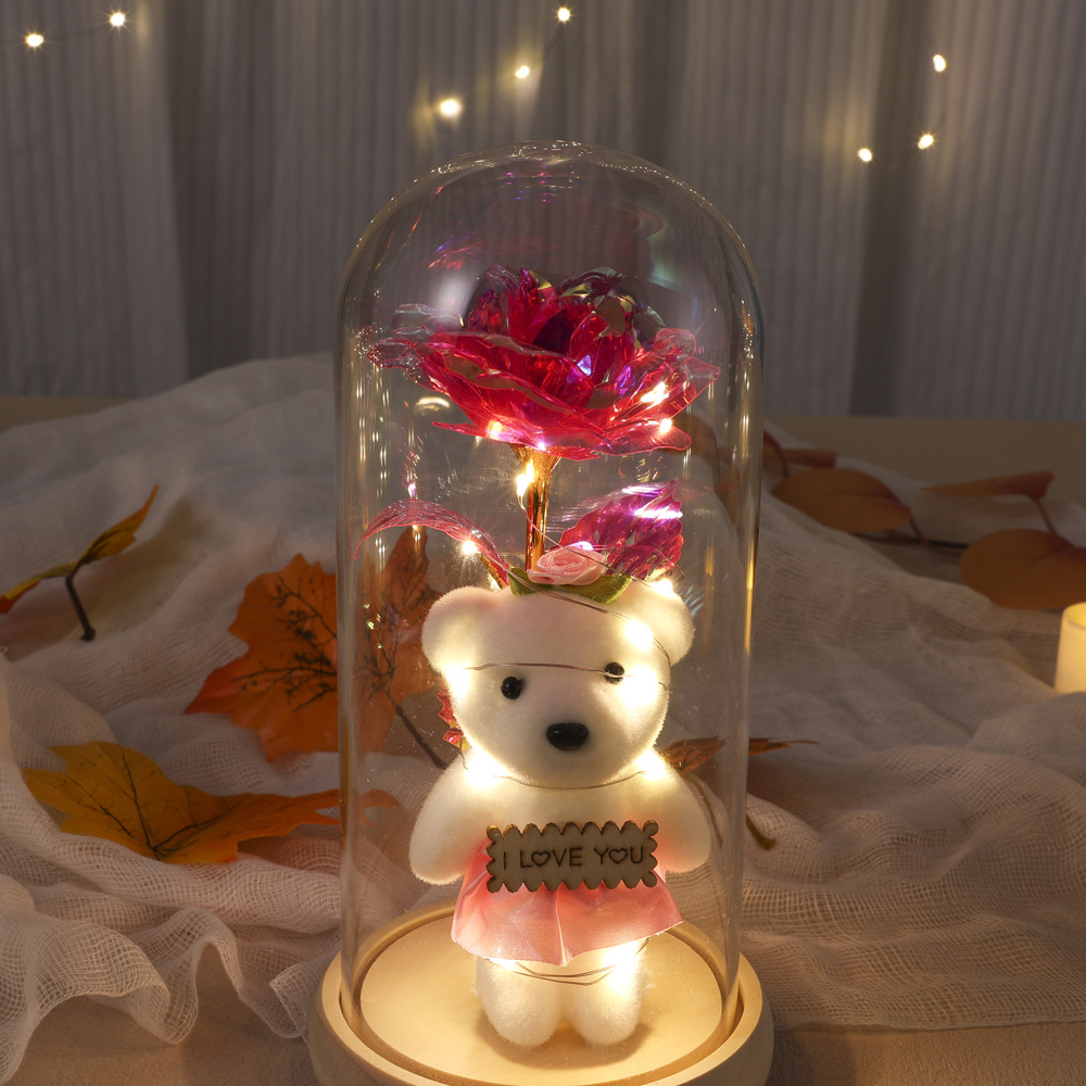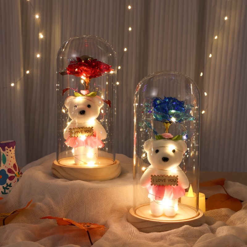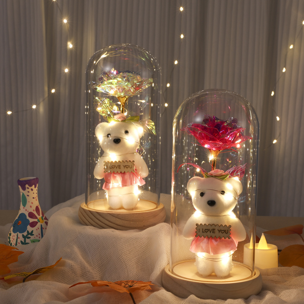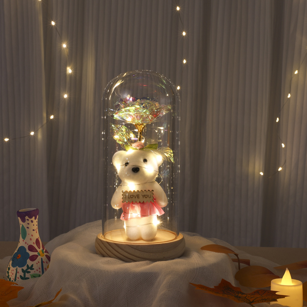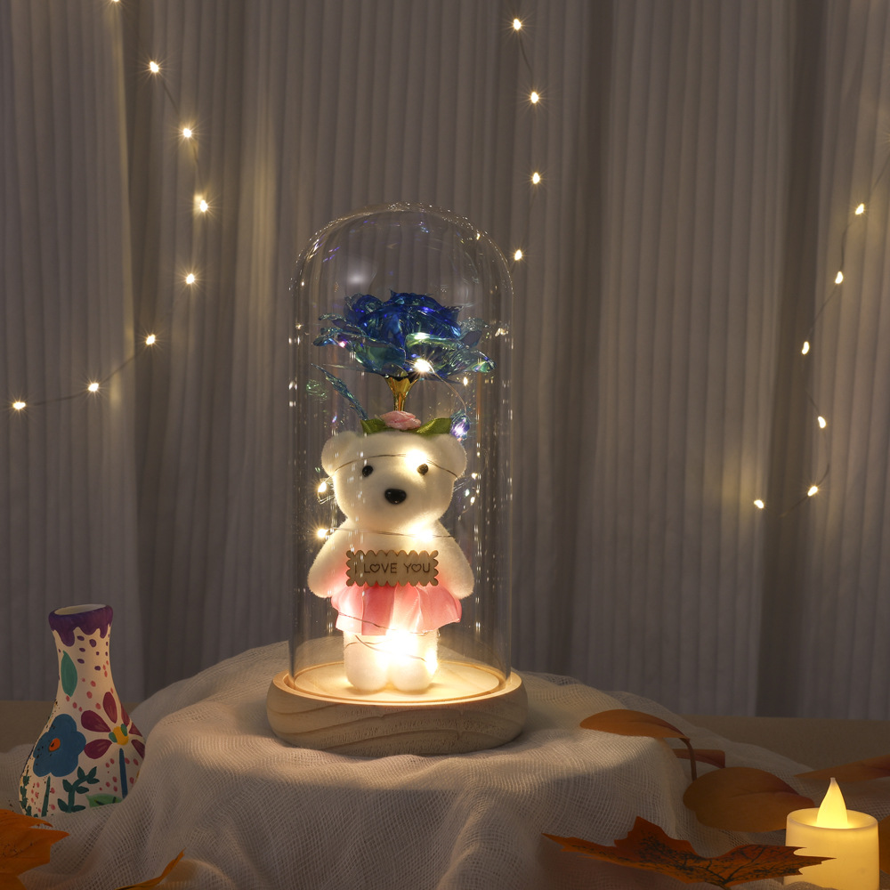 跨境亚马逊永生花玫瑰花玻璃罩带灯小熊小夜灯情人节礼物发光摆件